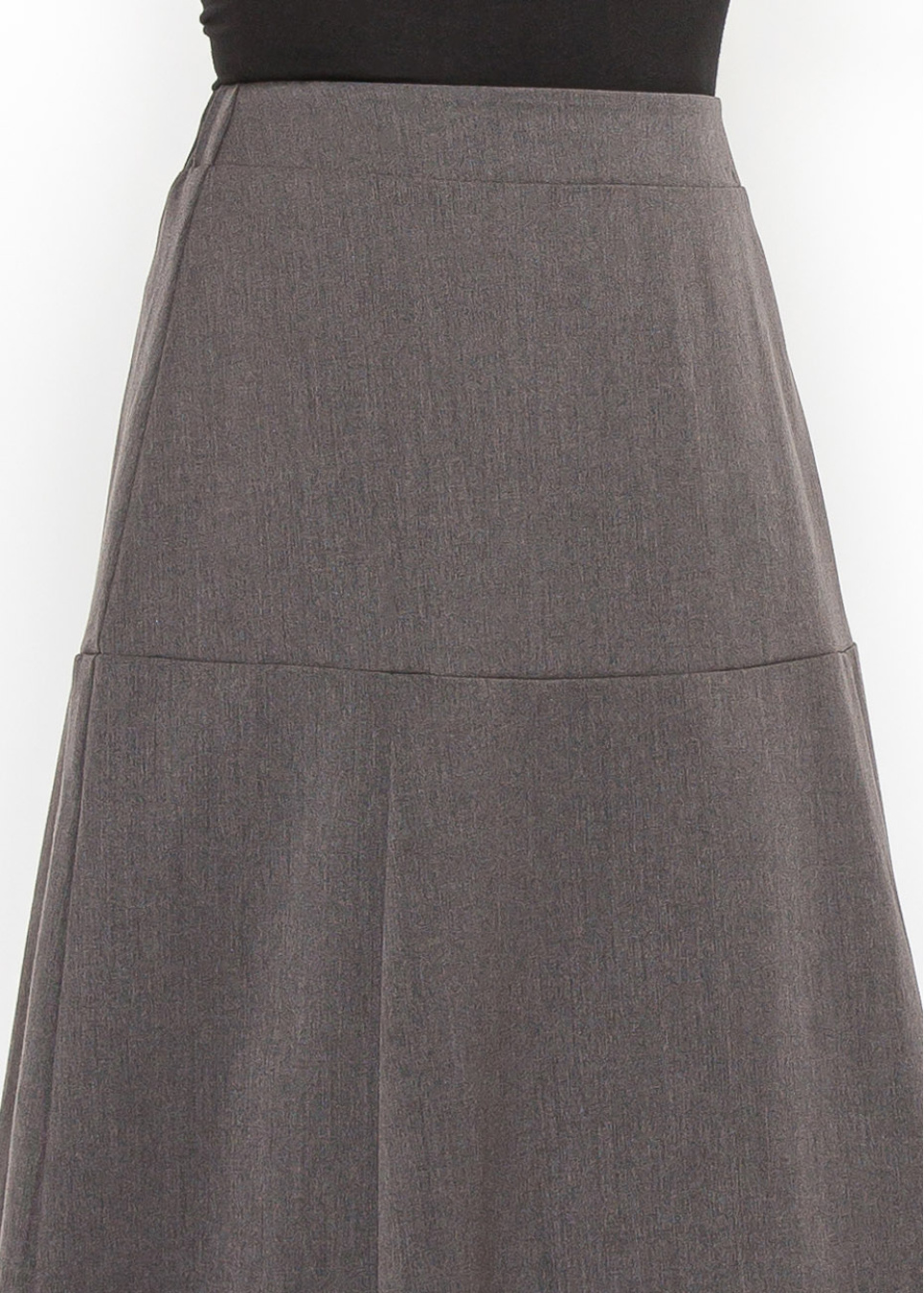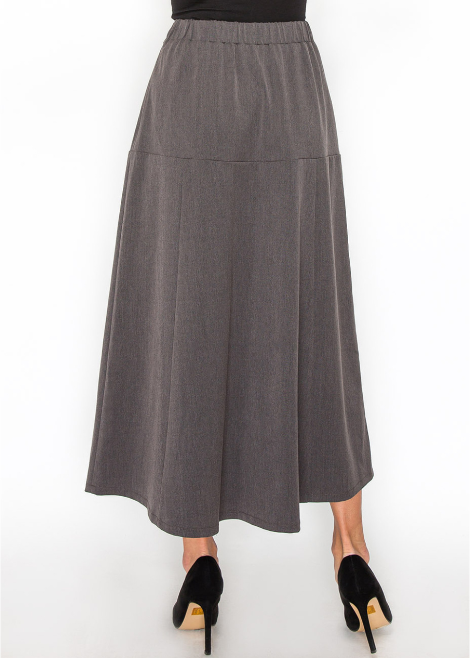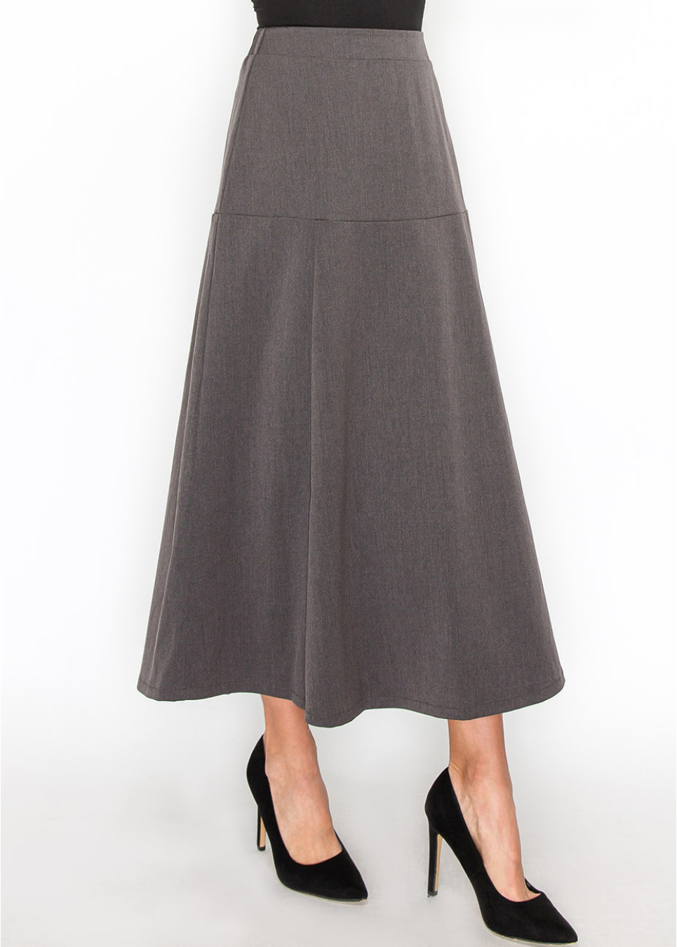 The subtle panel design on this gray midi skirt adds a modern touch to a traditional look. The smooth fabric ensures all-day comfort, making it an excellent choice for both work and casual outings.