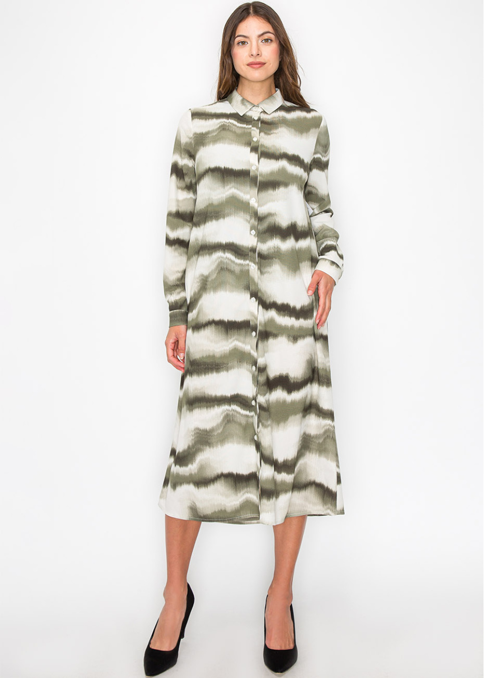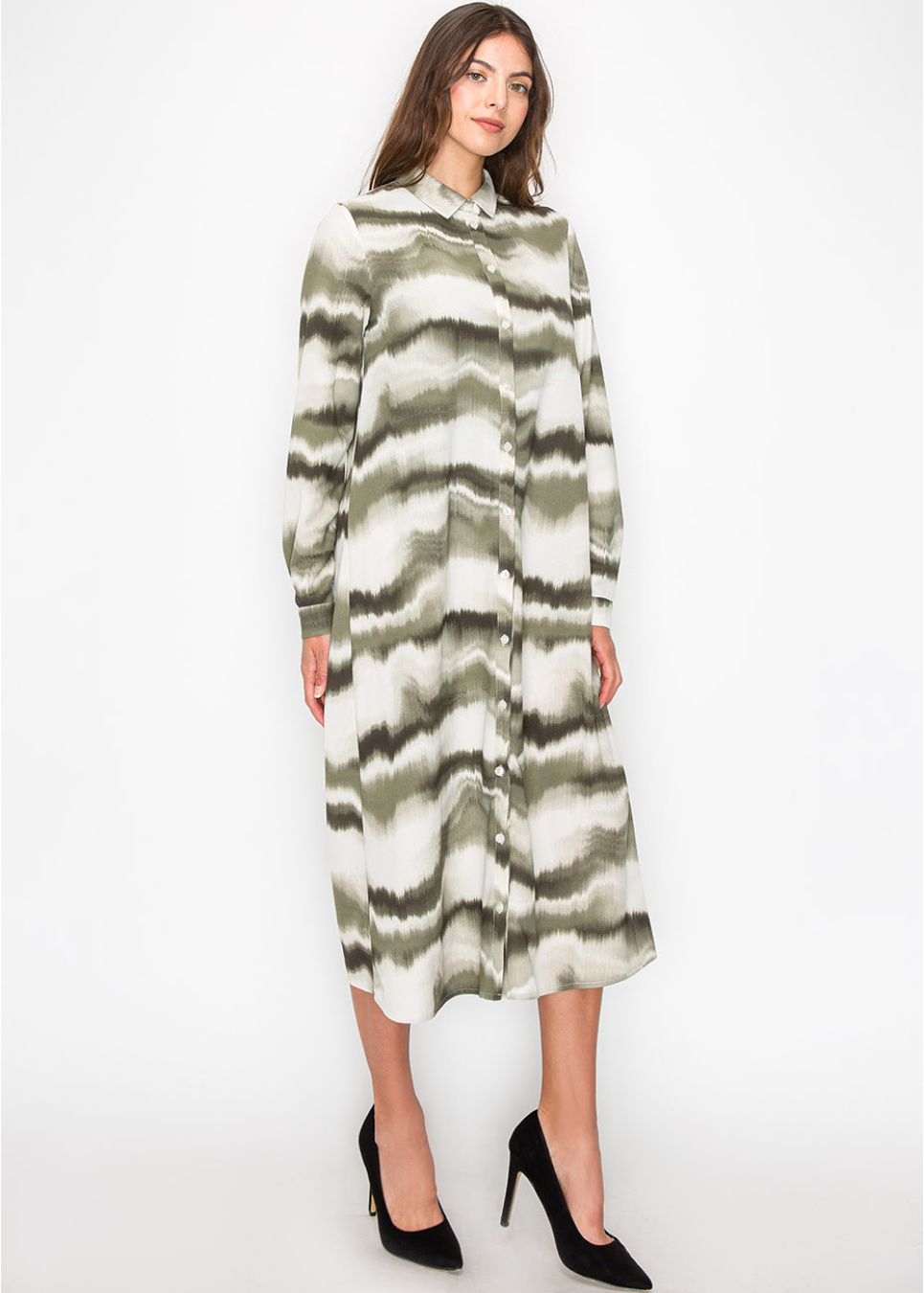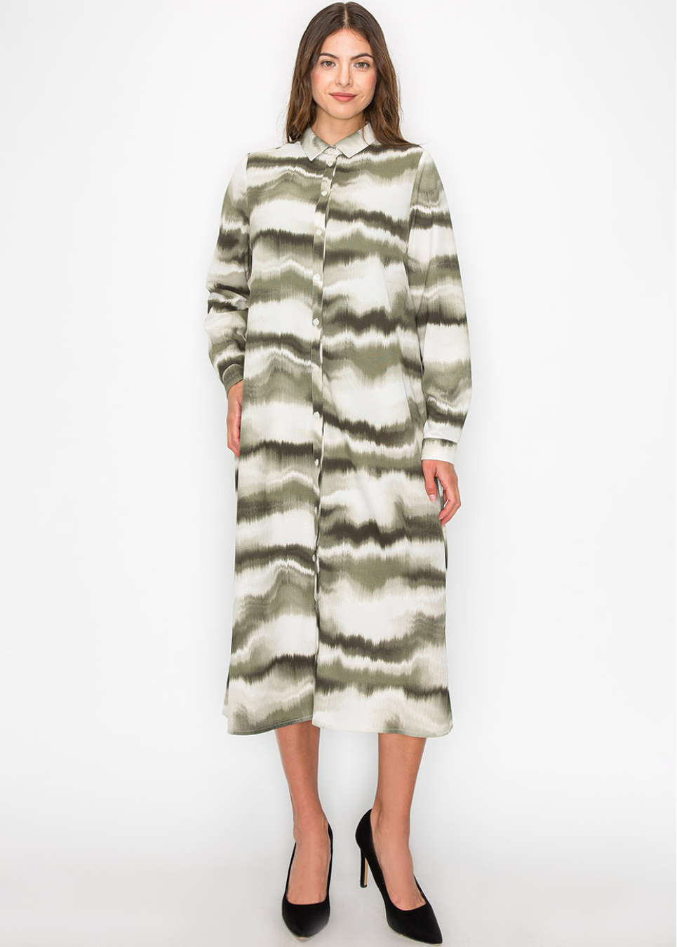 Featuring a soothing wave-like tie-dye pattern in green and white, this dress is as comfortable as it is stylish. The button-down front adds a touch of elegance, while the long sleeves and flowing shape provide a modest and flattering fit.
