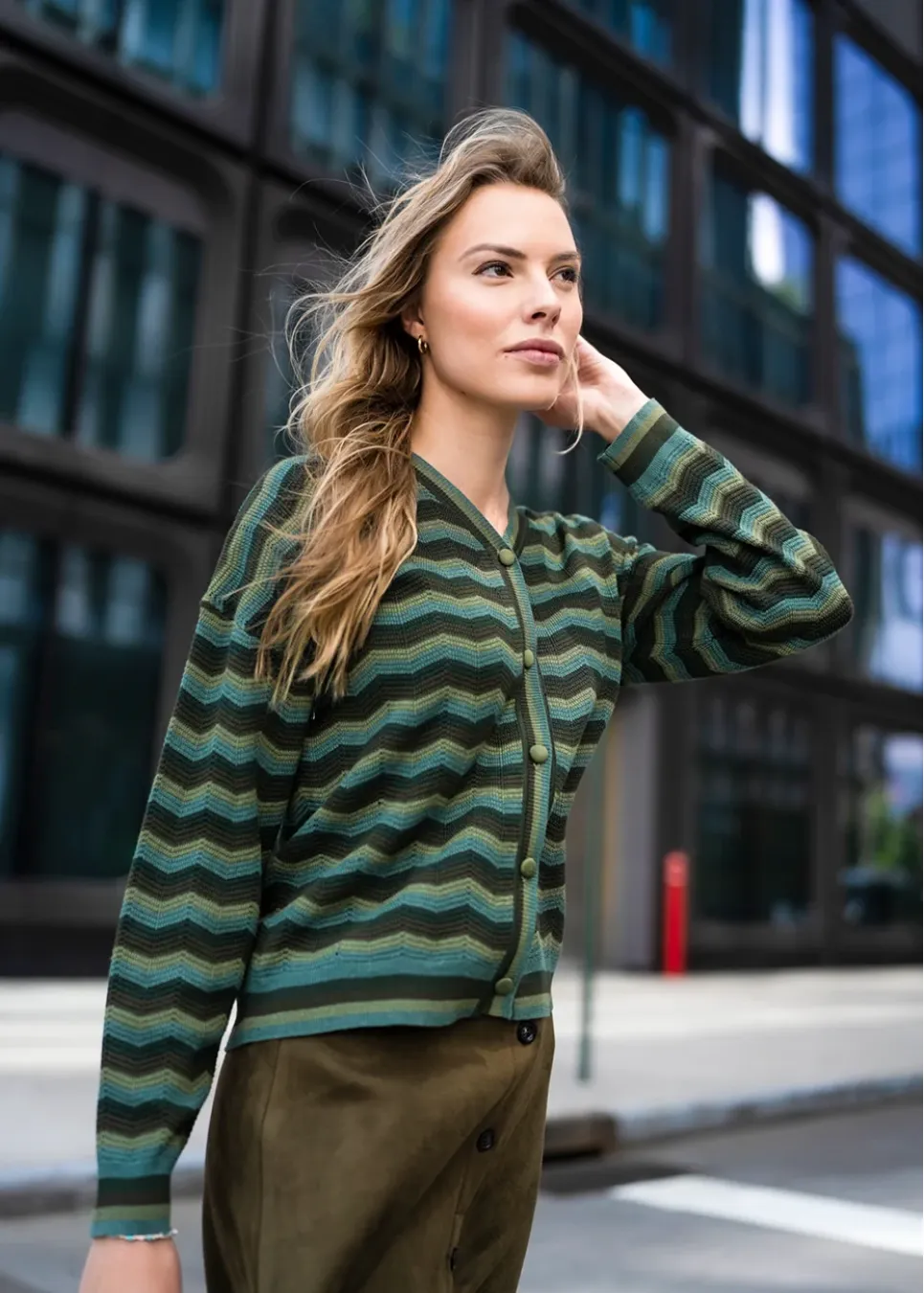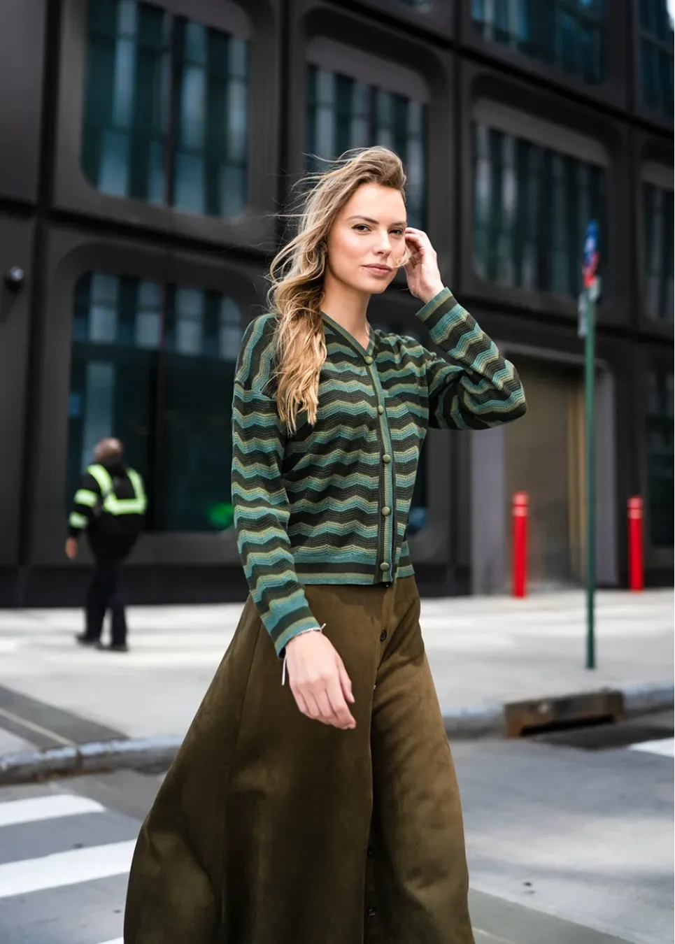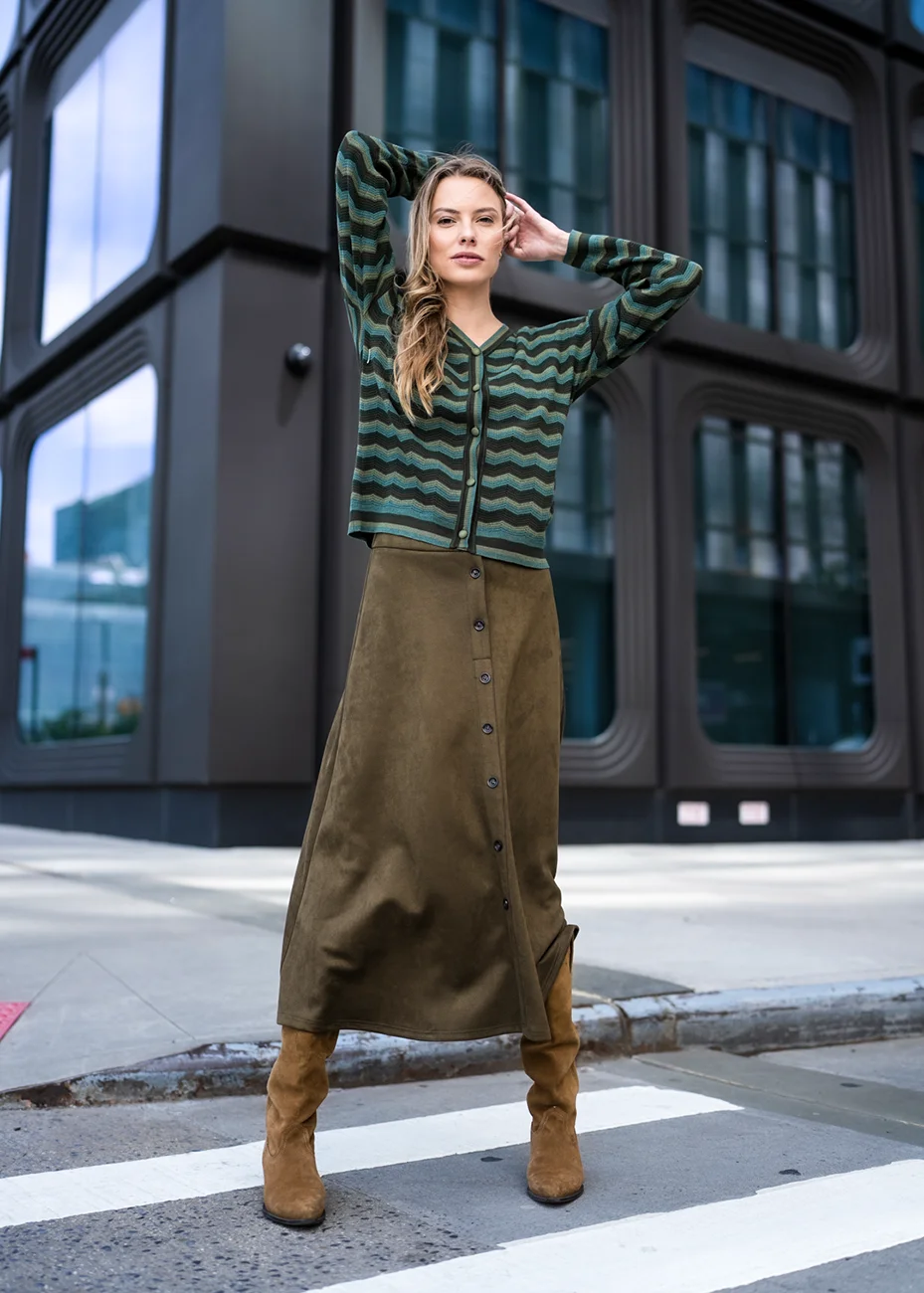 A quiet standout piece for fall — textured, cozy, and beautifully balanced in tone. The maxi skirt gives it elegance, while the chevron knit adds depth and personality.