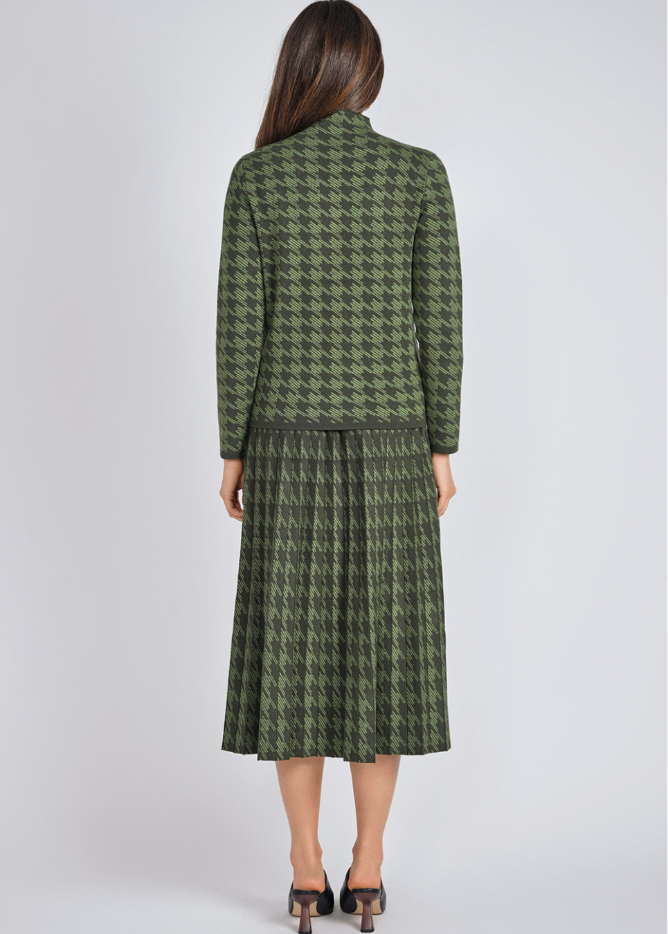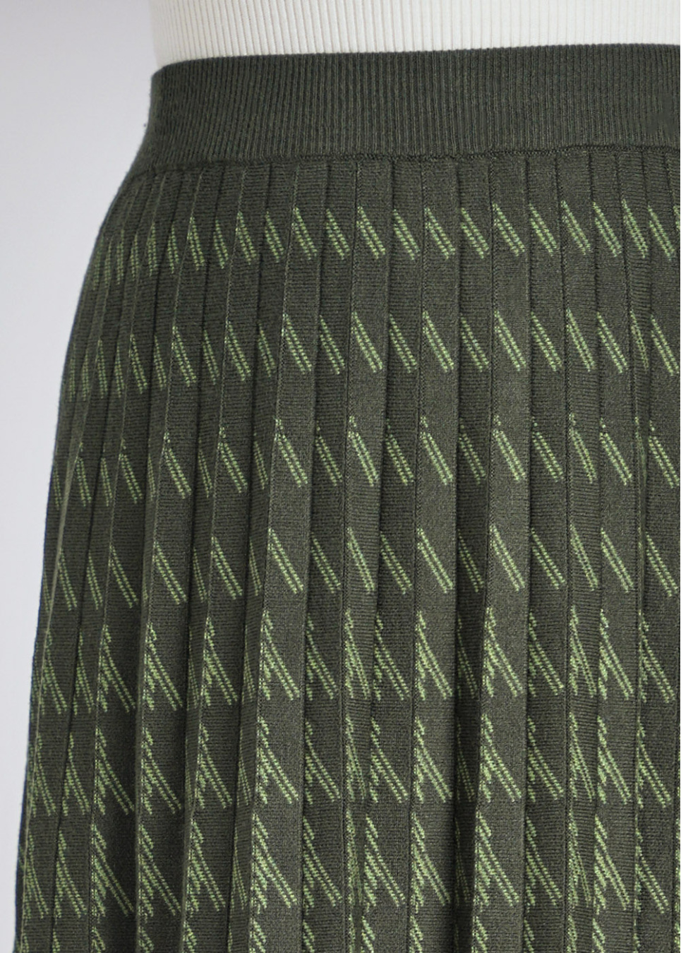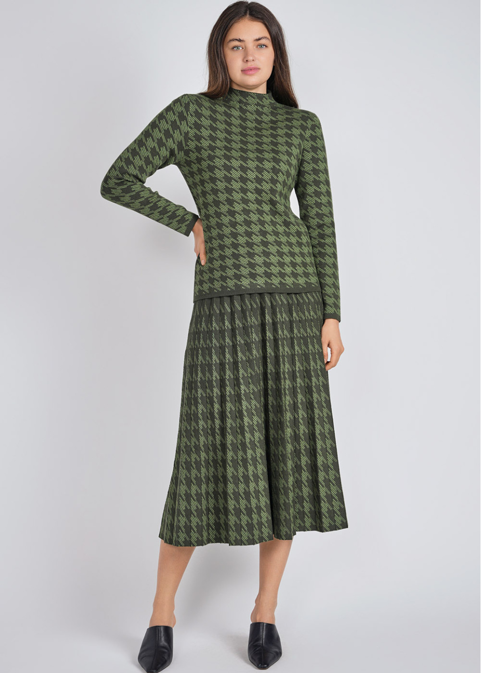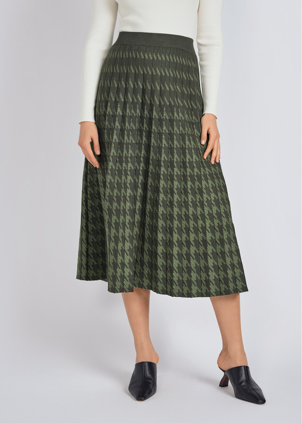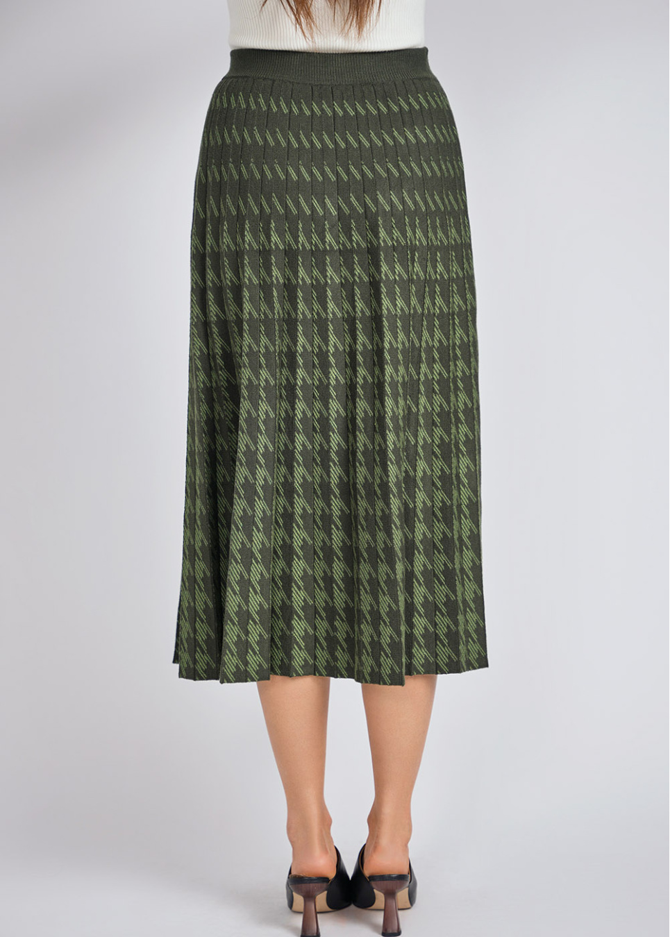 Green Midi Skirt: Houndstooth Knit Pleats