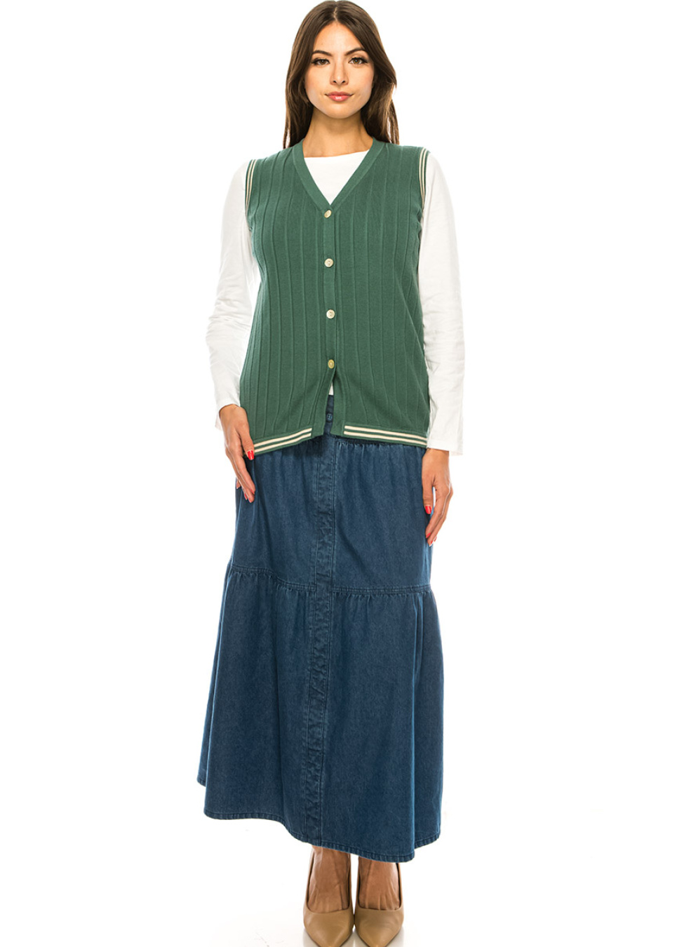 Keep it cozy and chic with this beautiful green ribbed vest from YAL New York. The classic button-front design and v-neckline create a flattering and elegant silhouette that's perfect for layering over any outfit.