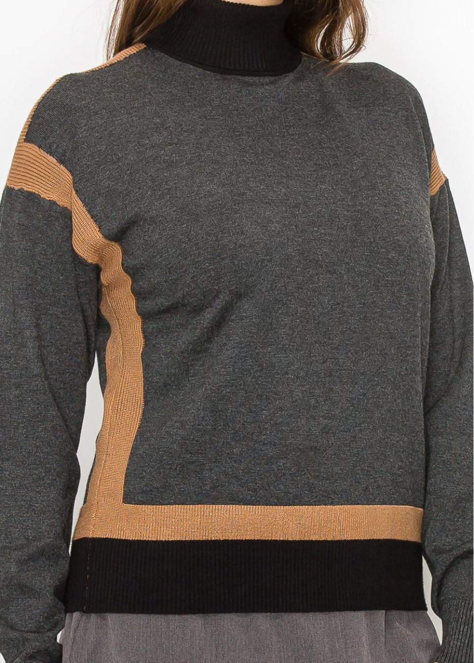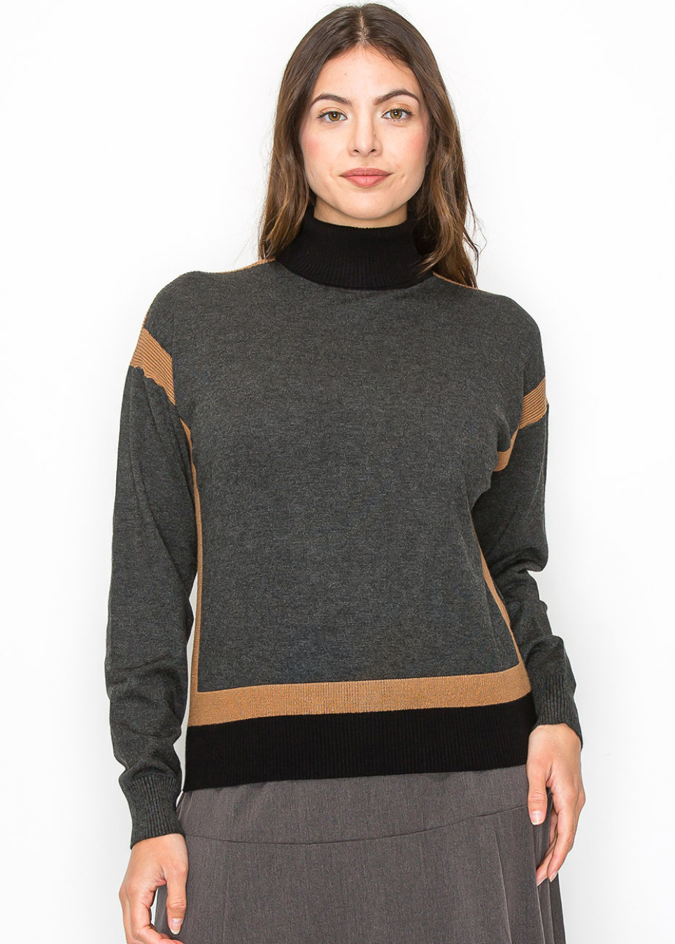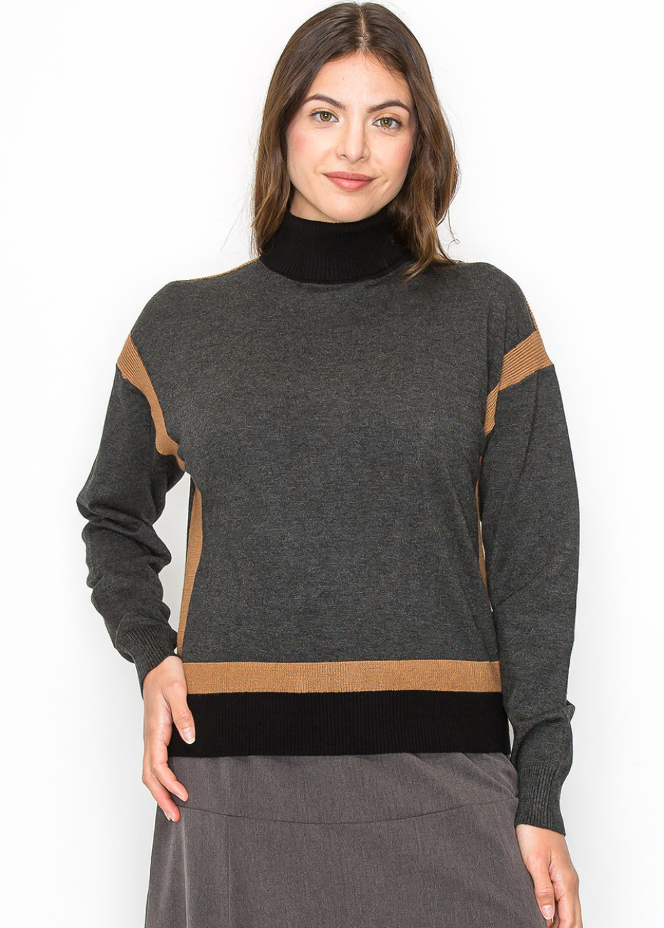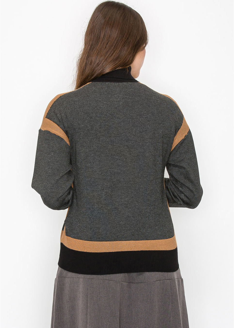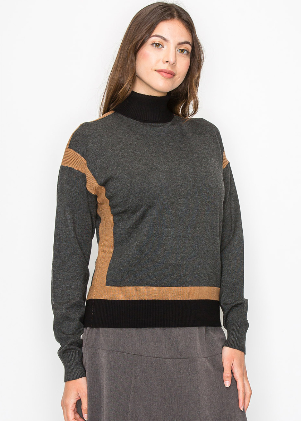 Designed for both comfort and style, this grey sweater is accented with camel and black color blocks along the sleeves and hem. The modest fit and long sleeves make it easy to pair with skirts for a casual yet refined look.