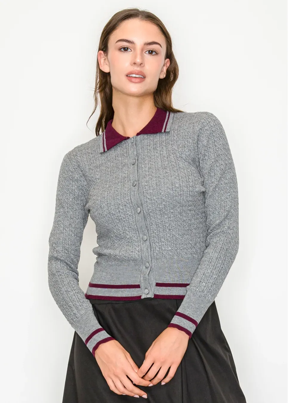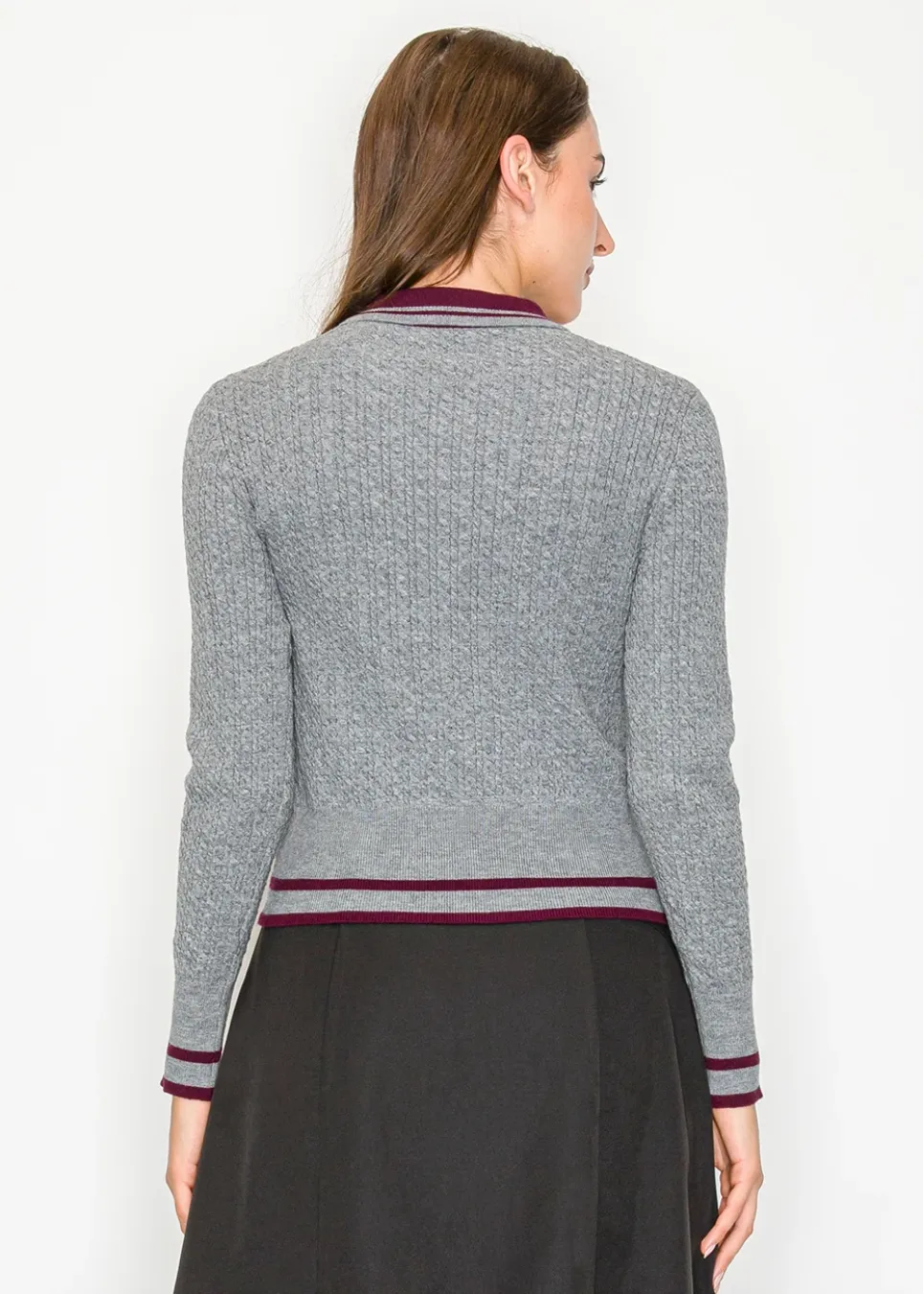 A polished cardigan in soft grey knit with refined burgundy trims. A collared silhouette that brings quiet sophistication to everyday looks.
