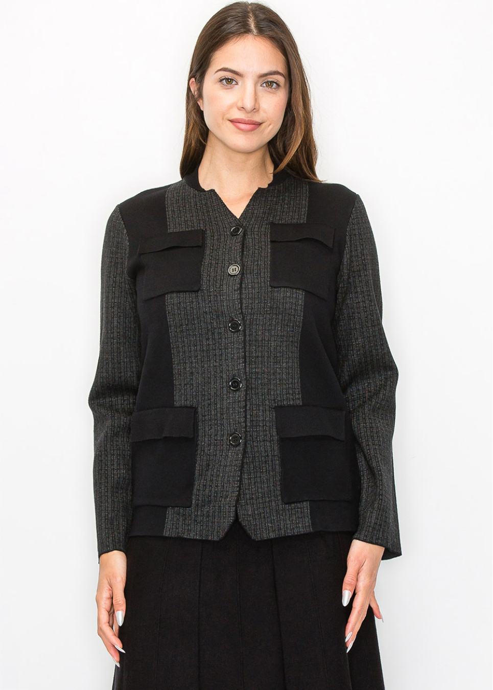 Checked Knit Button-Front Cardigan in Black