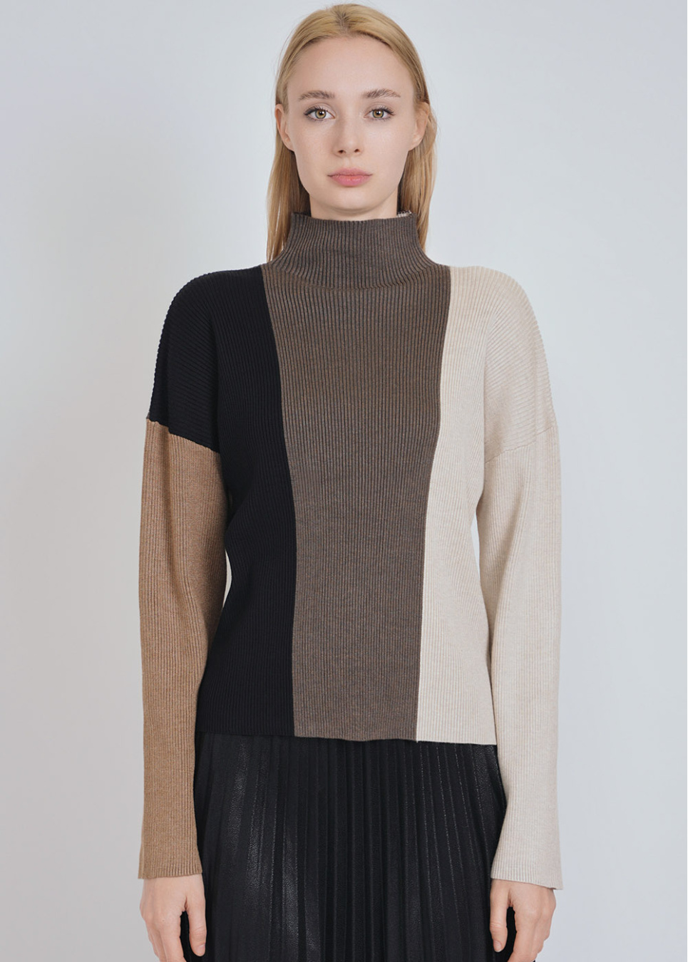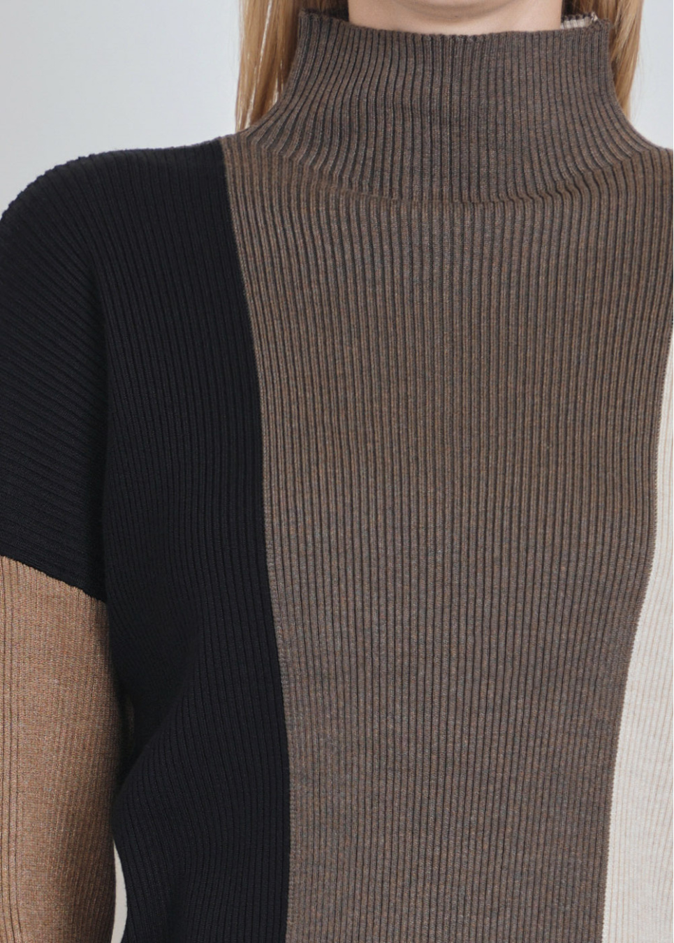 High-Collar Harmony: Ribbed Multi-Shade Sweater