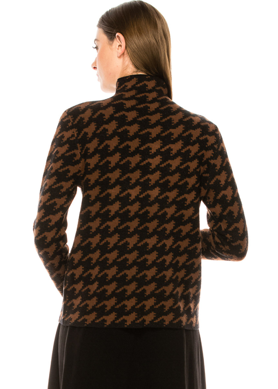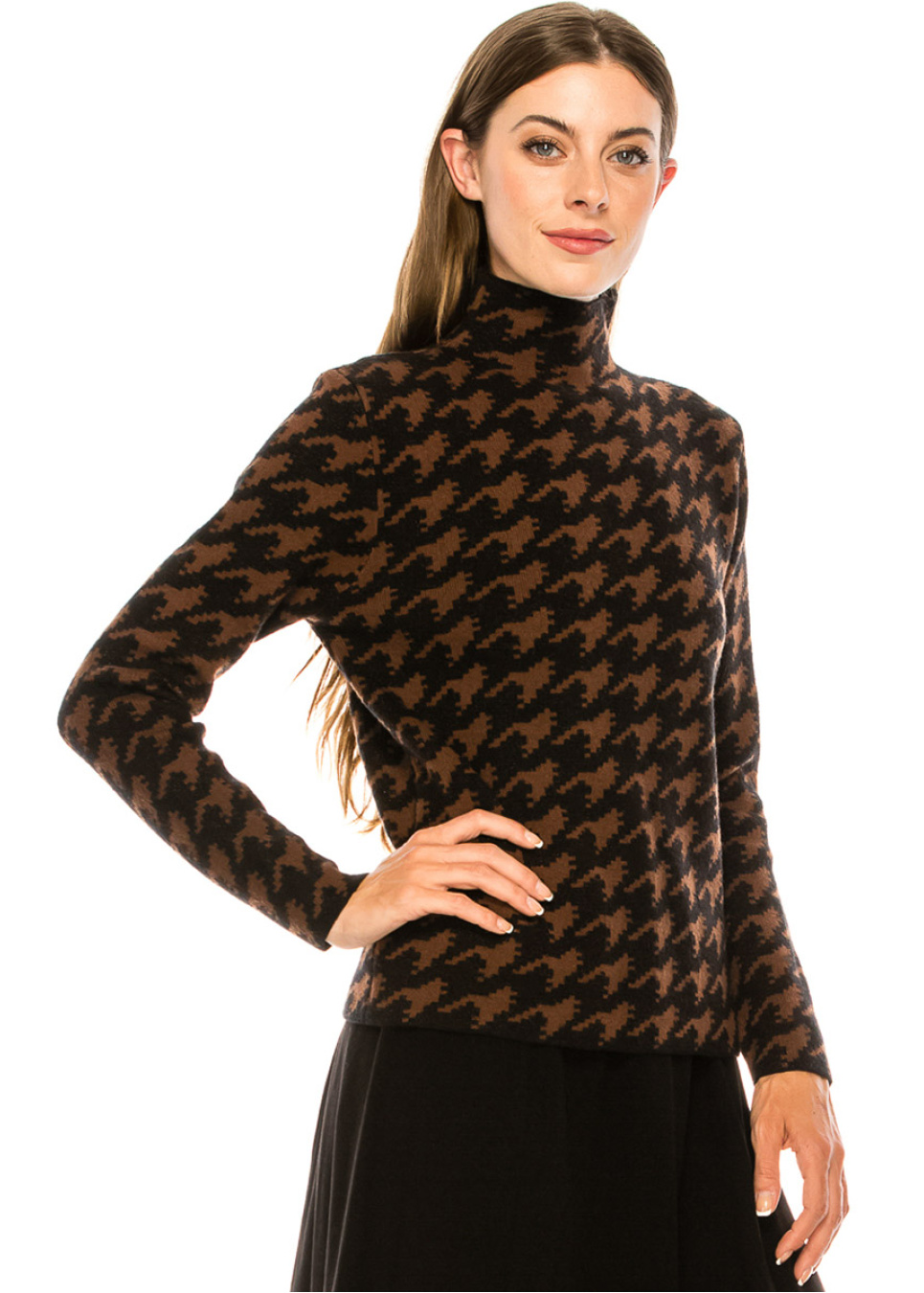 This knit sweater has a traditional high collar, long sleeves, and a houndstooth print. It's the perfect complement to any outfit, whether you're wearing jeans or a skirt. The soft, high-quality fabric used makes it very pleasant to wear.