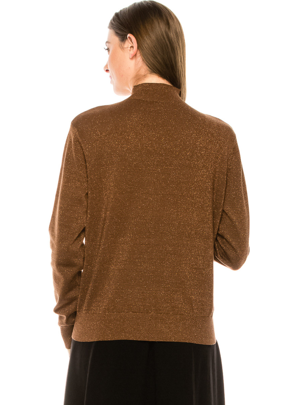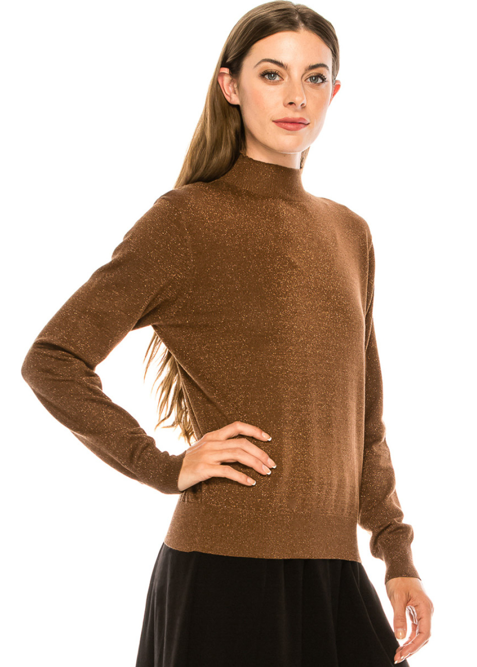Every lady needs a basic high-neck sweater in a neutral hue. This staple piece is very versatile and will brighten your day with its lurex shine.
