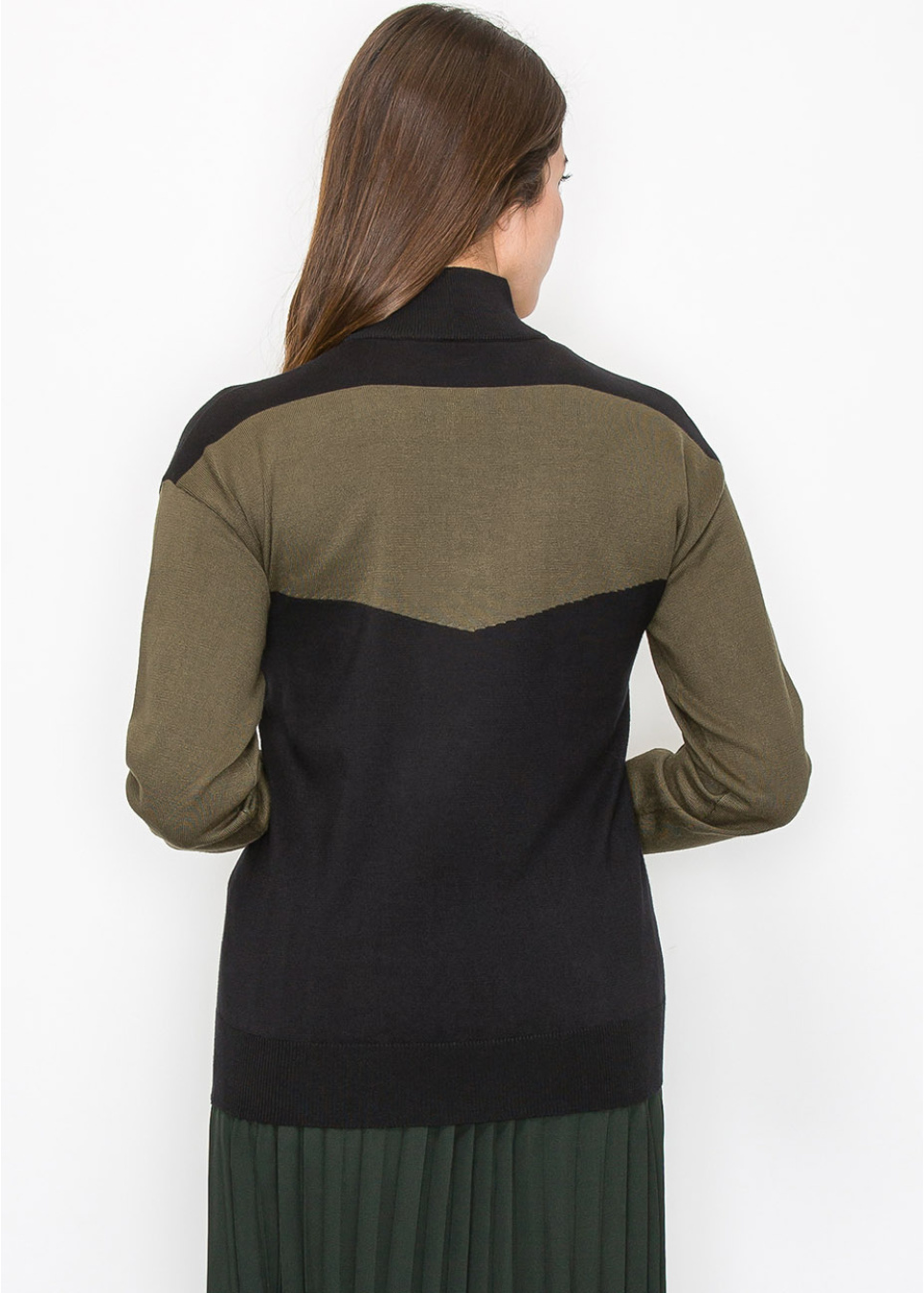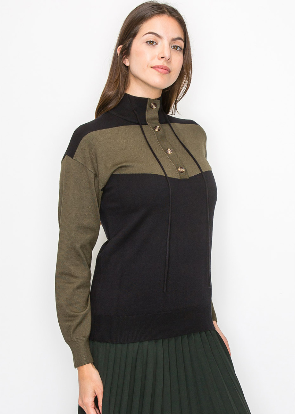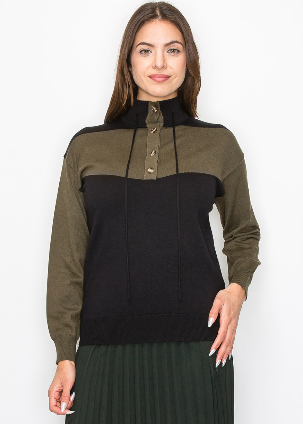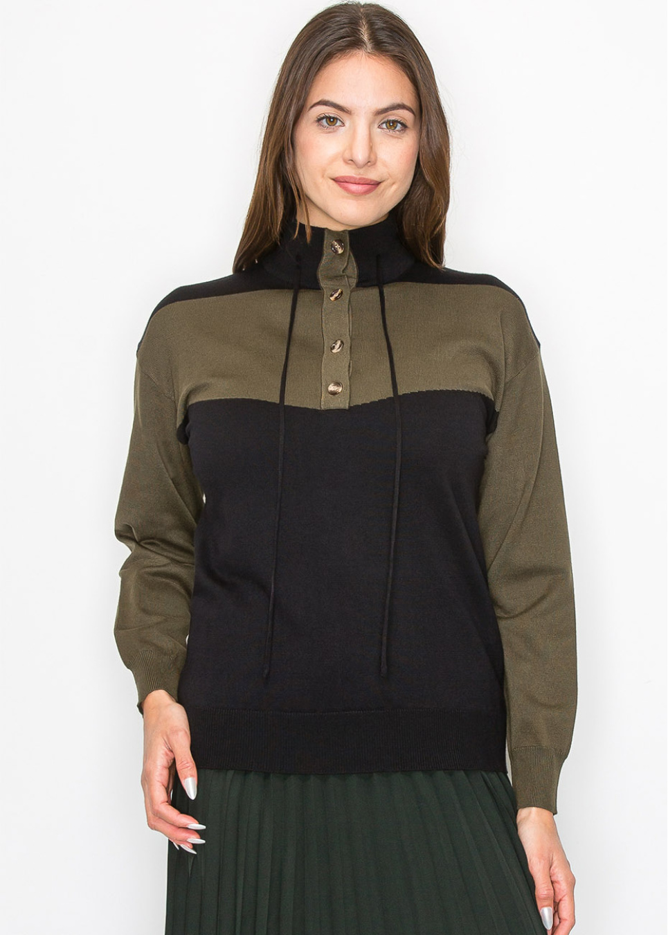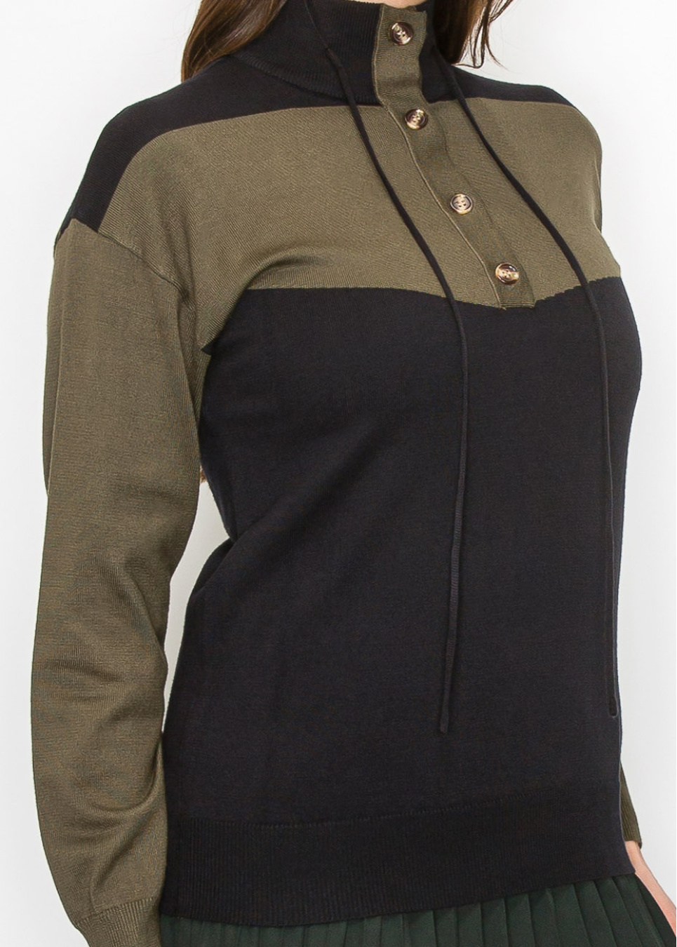 With a sleek black body and an olive-toned top panel, this sweater brings a modern twist to classic color-blocking. The high-neck collar with button detailing adds a sophisticated edge, while the relaxed fit makes it an ideal choice for both casual and dressed-up looks.