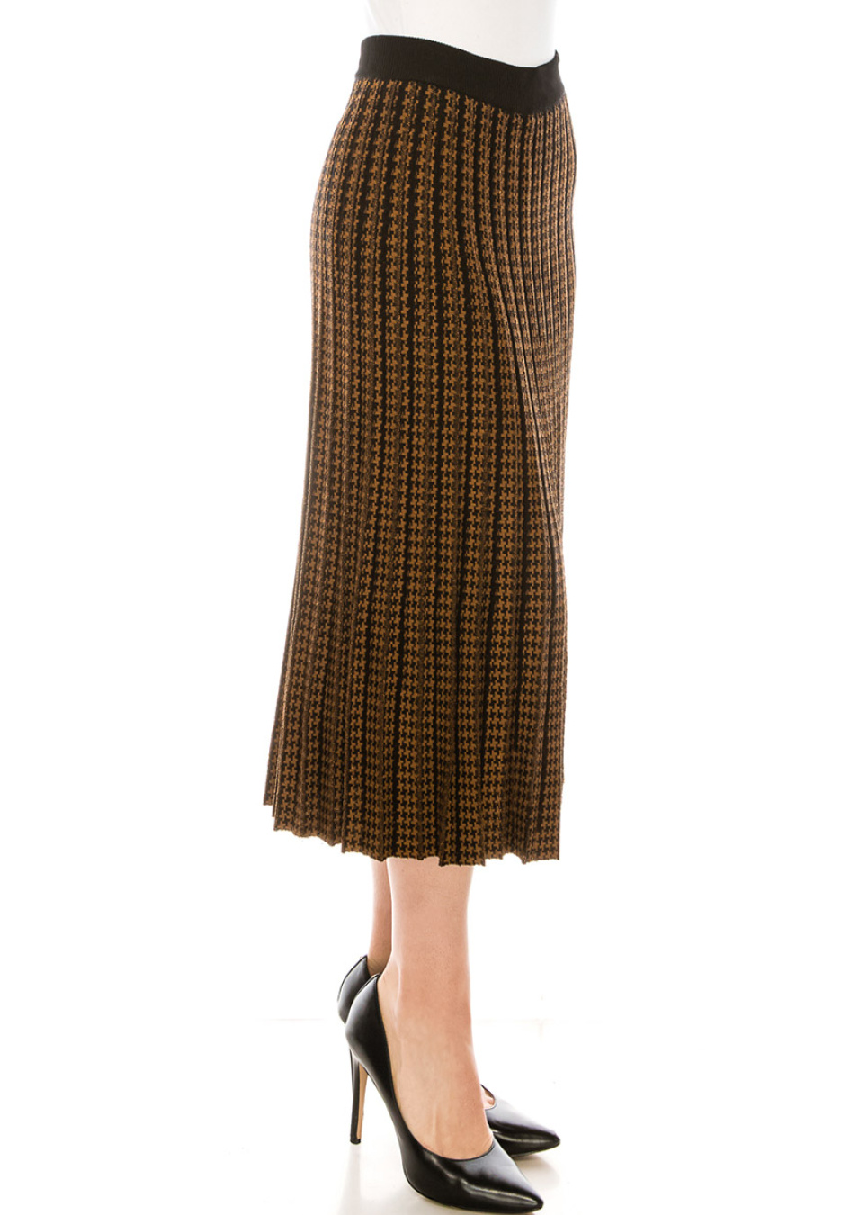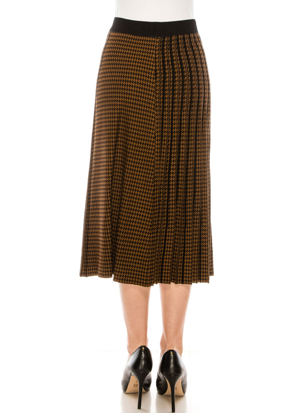 This warm skirt features a classic houndstooth print, elegant pleats, and high-quality material- perfect for any occasion. The midi length and rounded hem flatter any figure. A wide elastic waistband keeps the skirt securely in place without pinching.