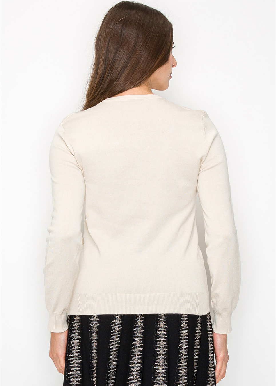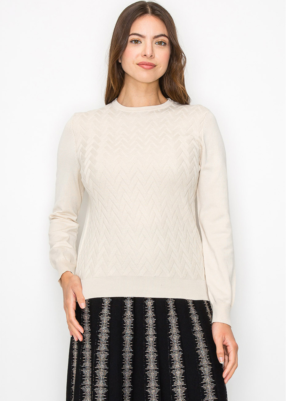 A wardrobe essential, this ivory knit sweater features a subtle chevron design that adds texture without overpowering the look. The crew neck and long sleeves make it a versatile piece that you can dress up or down for any occasion.