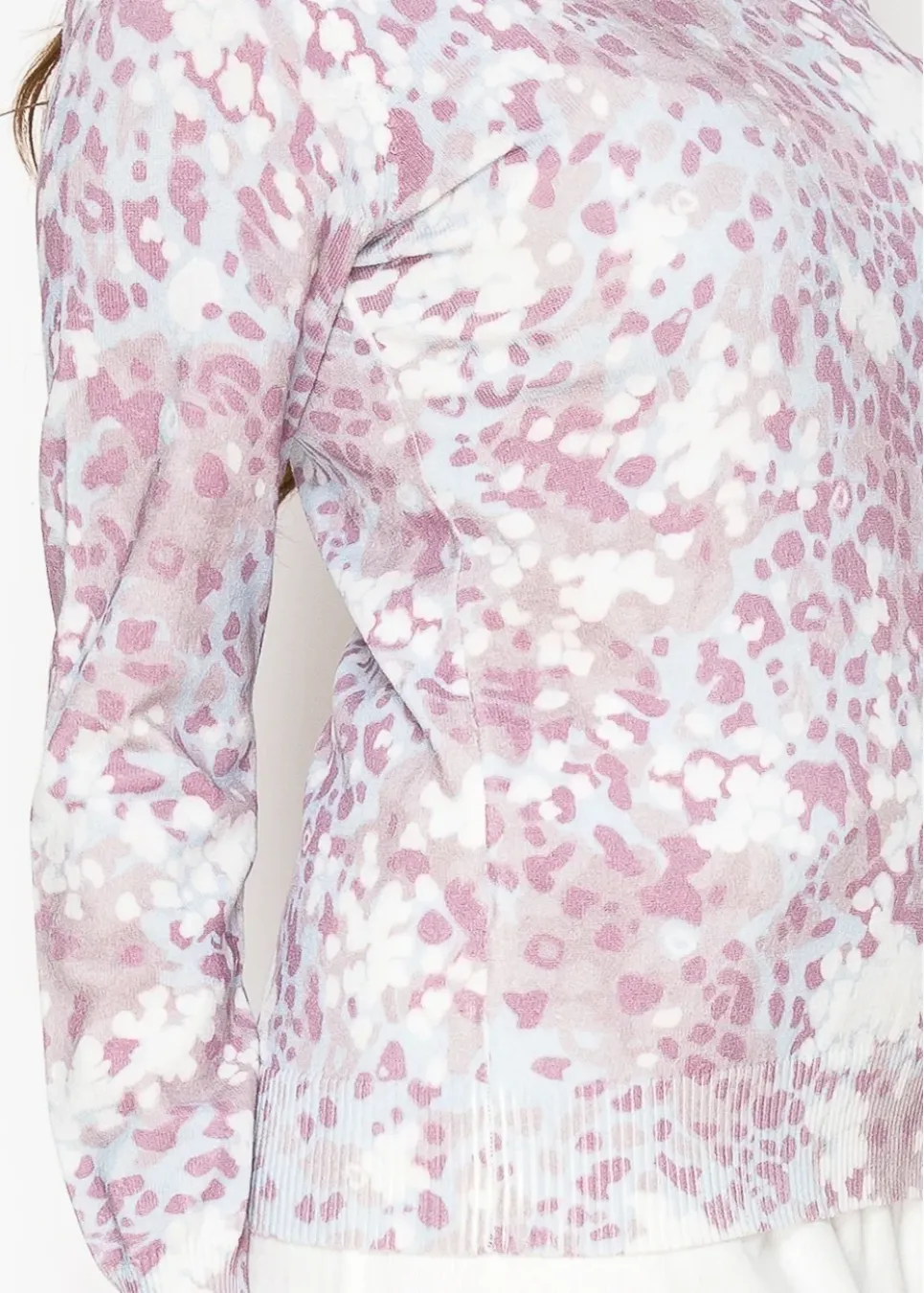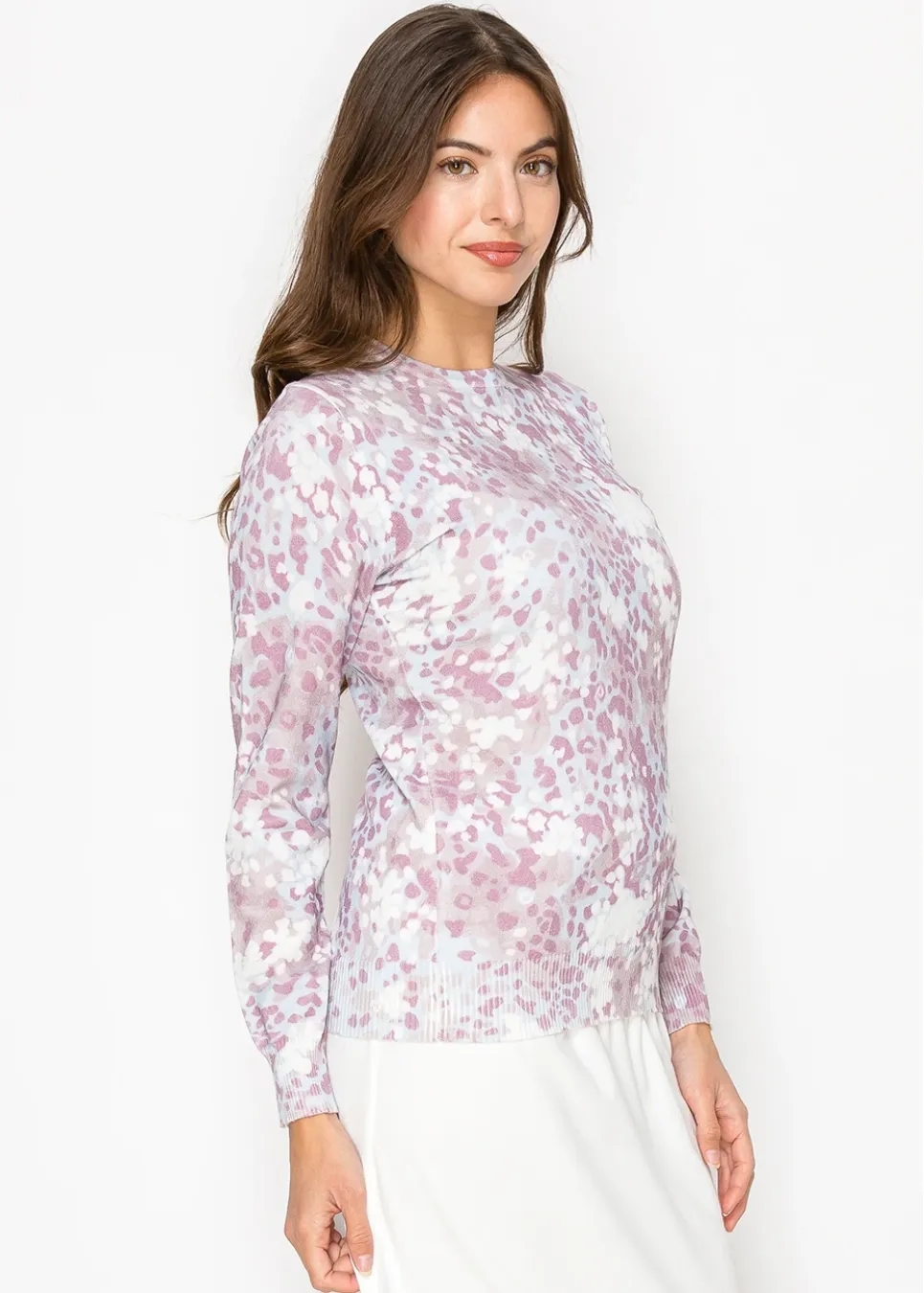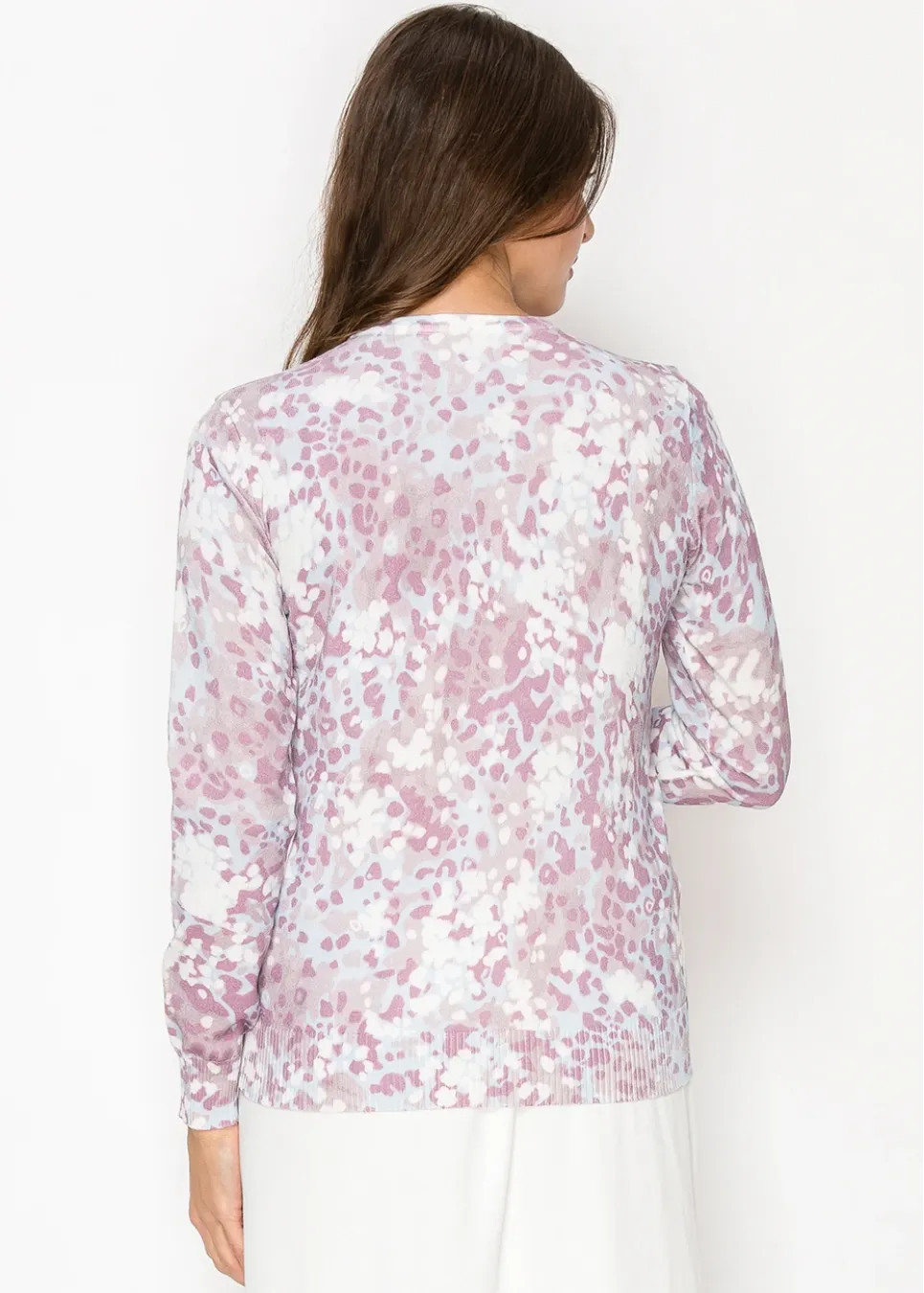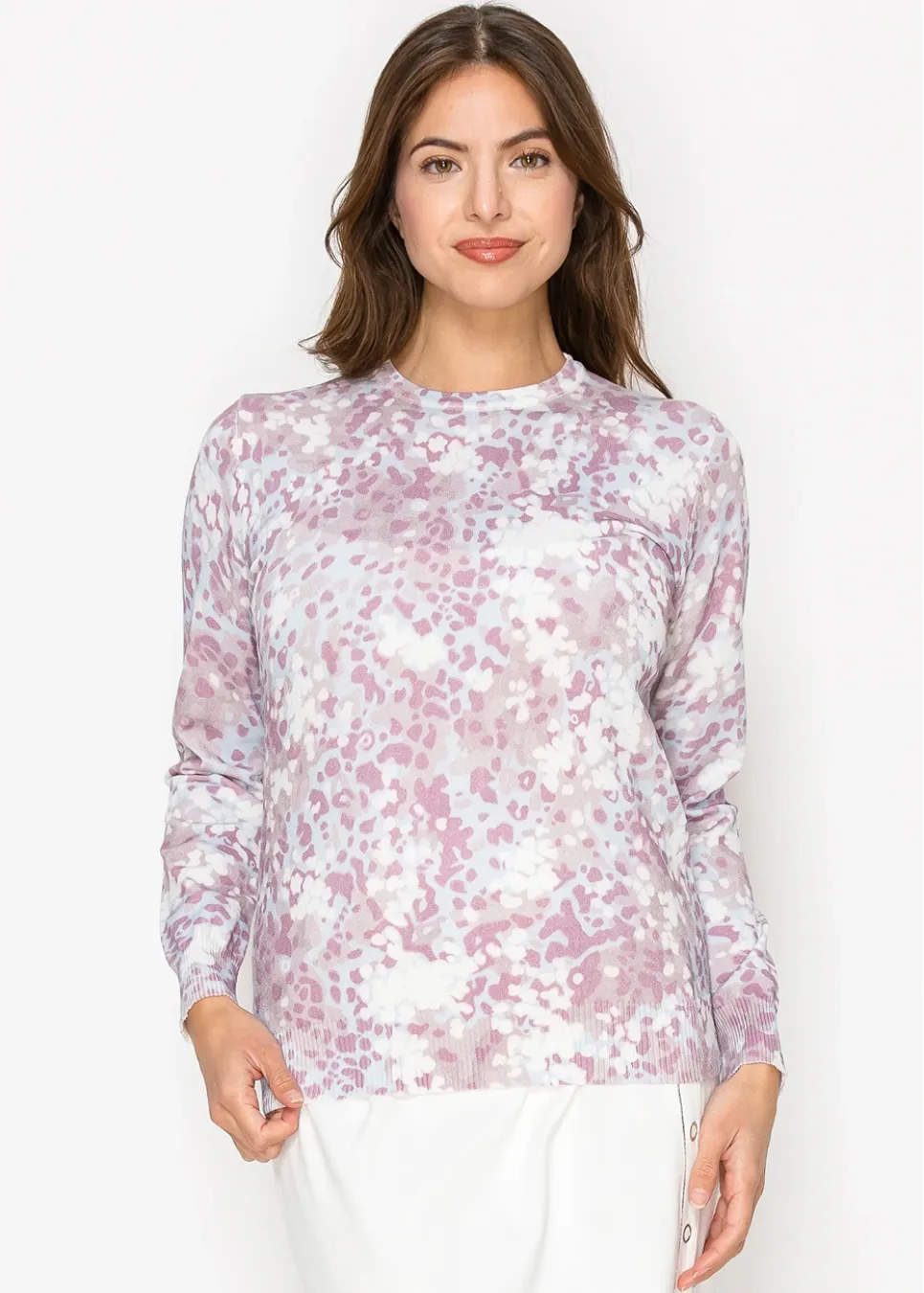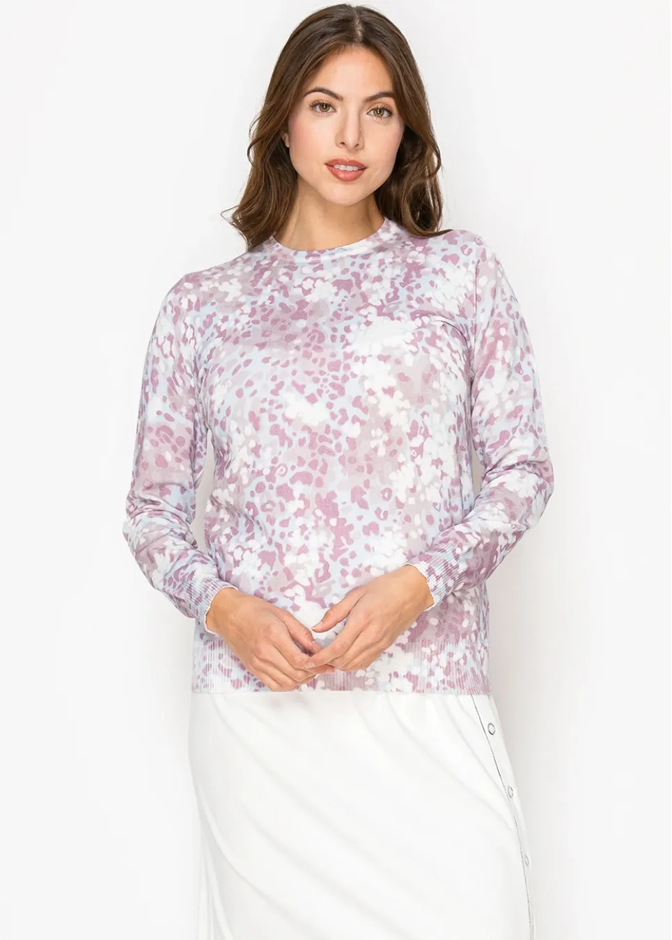 This lightweight sweater is a mix of soft lavender, white, and blush tones that create a dreamy, watercolor-like pattern. Perfect for adding a touch of color to your day while staying cozy and stylish.