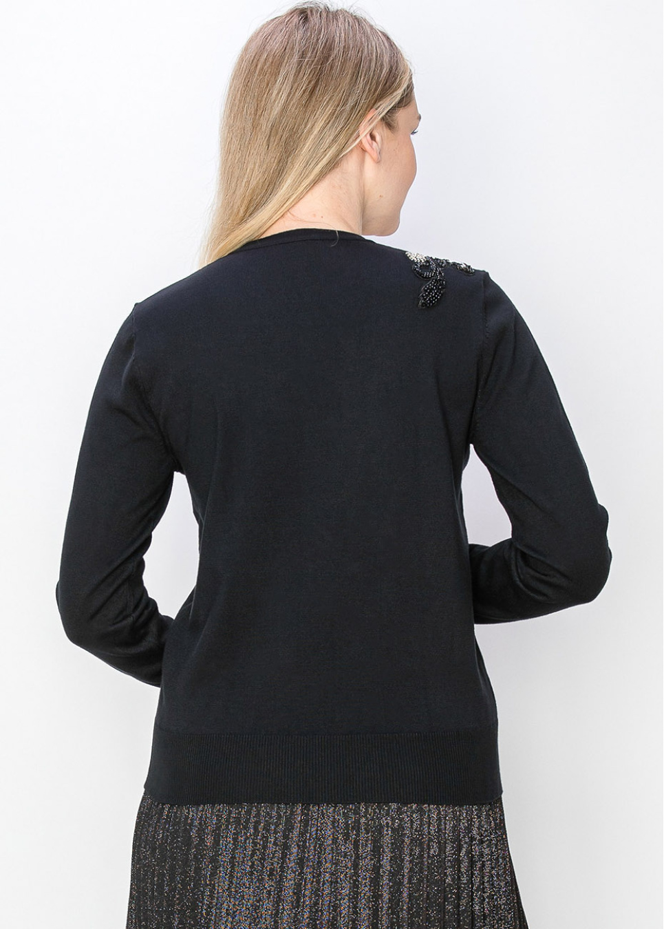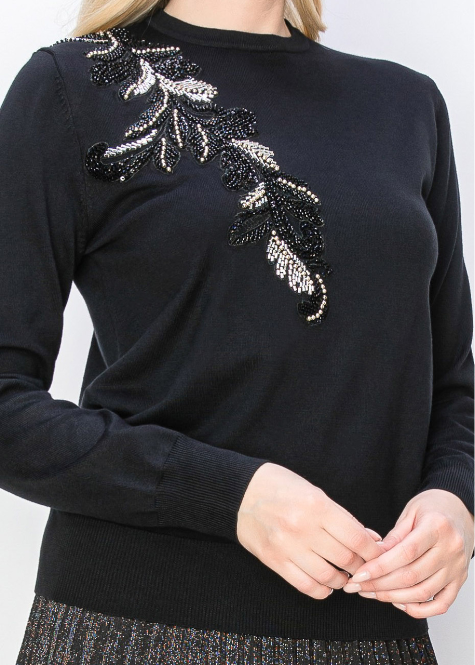 An artistic leaf embellishment crafted from silver and black beads adorns the shoulder of this black knit sweater, giving it a chic, modern touch. The soft material and classic silhouette make it both comfortable and stylish, ideal for elevating your everyday modest outfits. It’s a versatile piece you can dress up or down with ease.