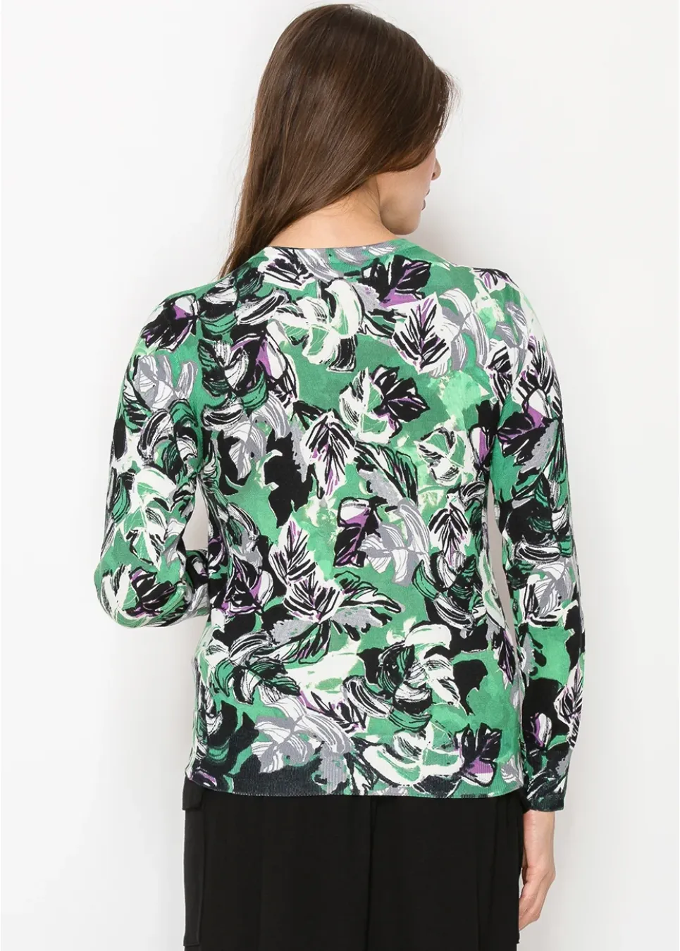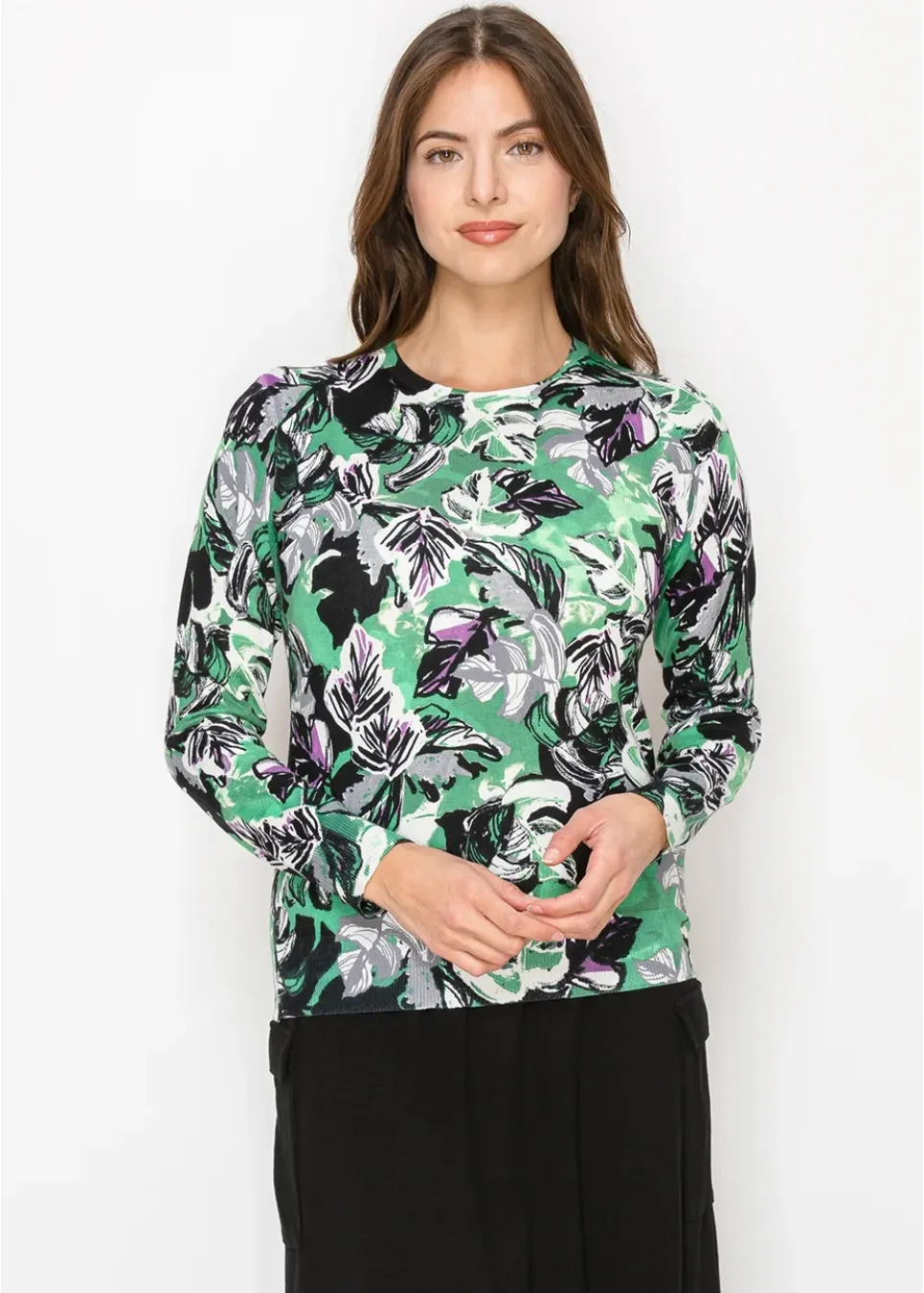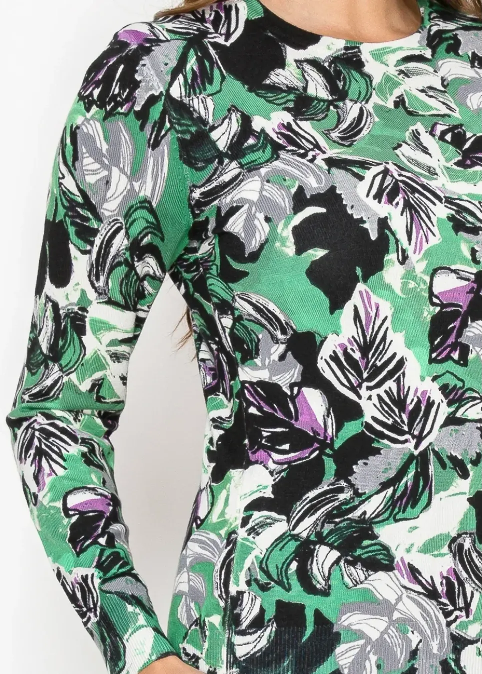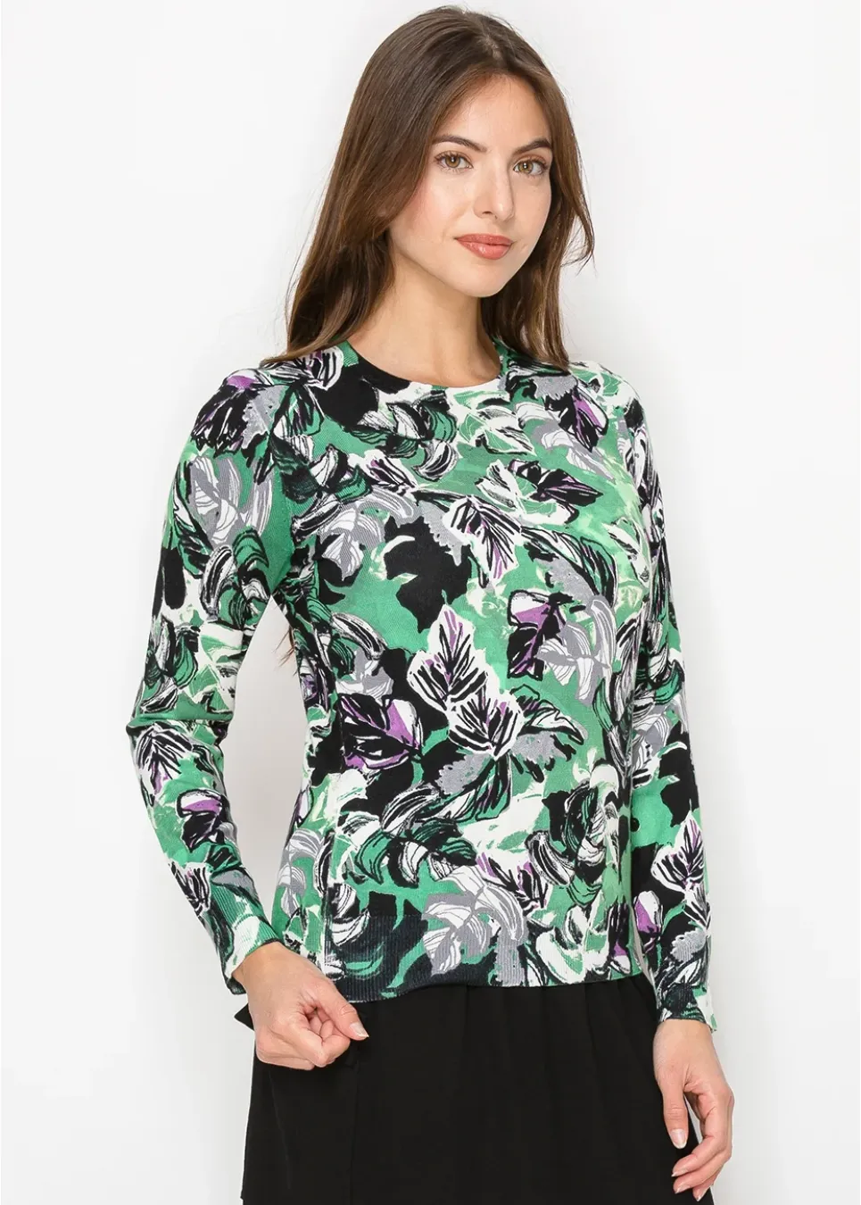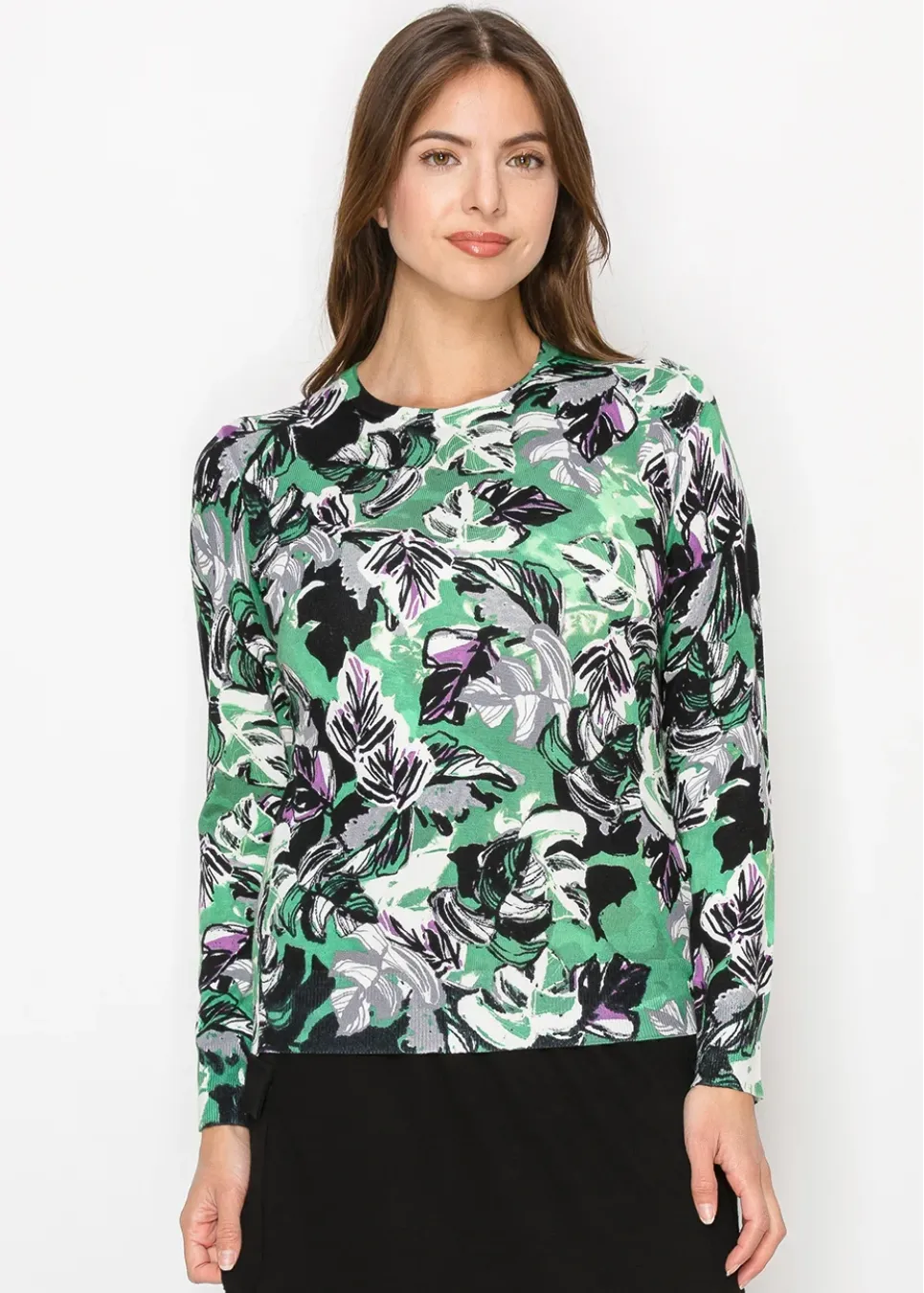Step into a world of color with this leafy-patterned sweater. Its relaxed fit and lightweight knit fabric keep things cozy, while the artistic mix of greens and purples ensures you’ll stand out in any crowd.