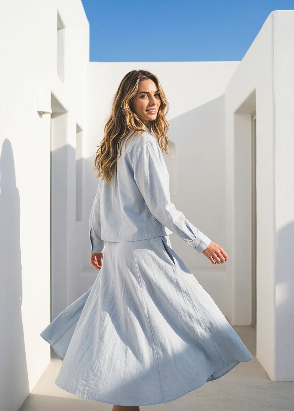 Button up, step in, done. Soft blue cotton blend, elasticized back on the skirt, and a silhouette that works without trying.