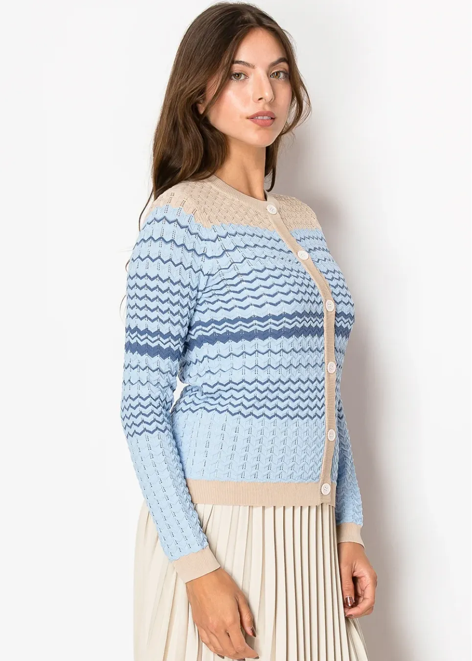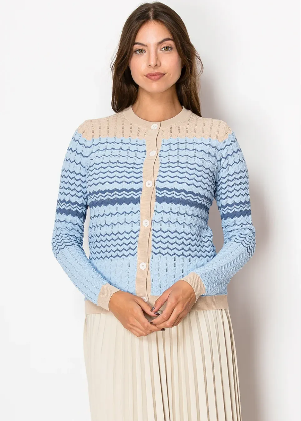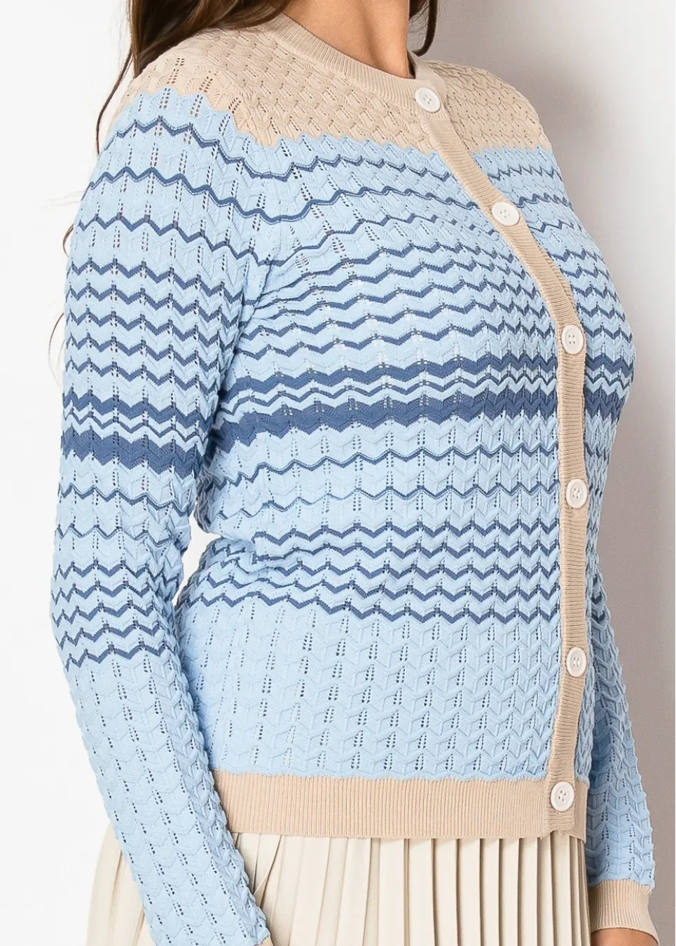 Featuring delicate chevron textures in soft blues, this cardigan is a perfect blend of comfort and style. The button-front closure and neutral accents make it easy to pair with your favorite skirts or dresses.