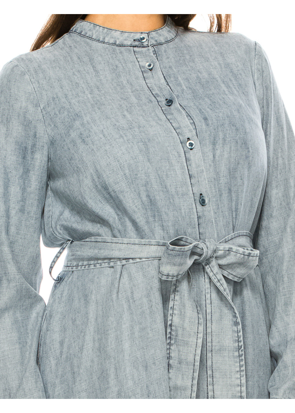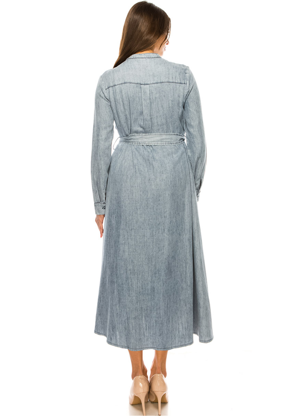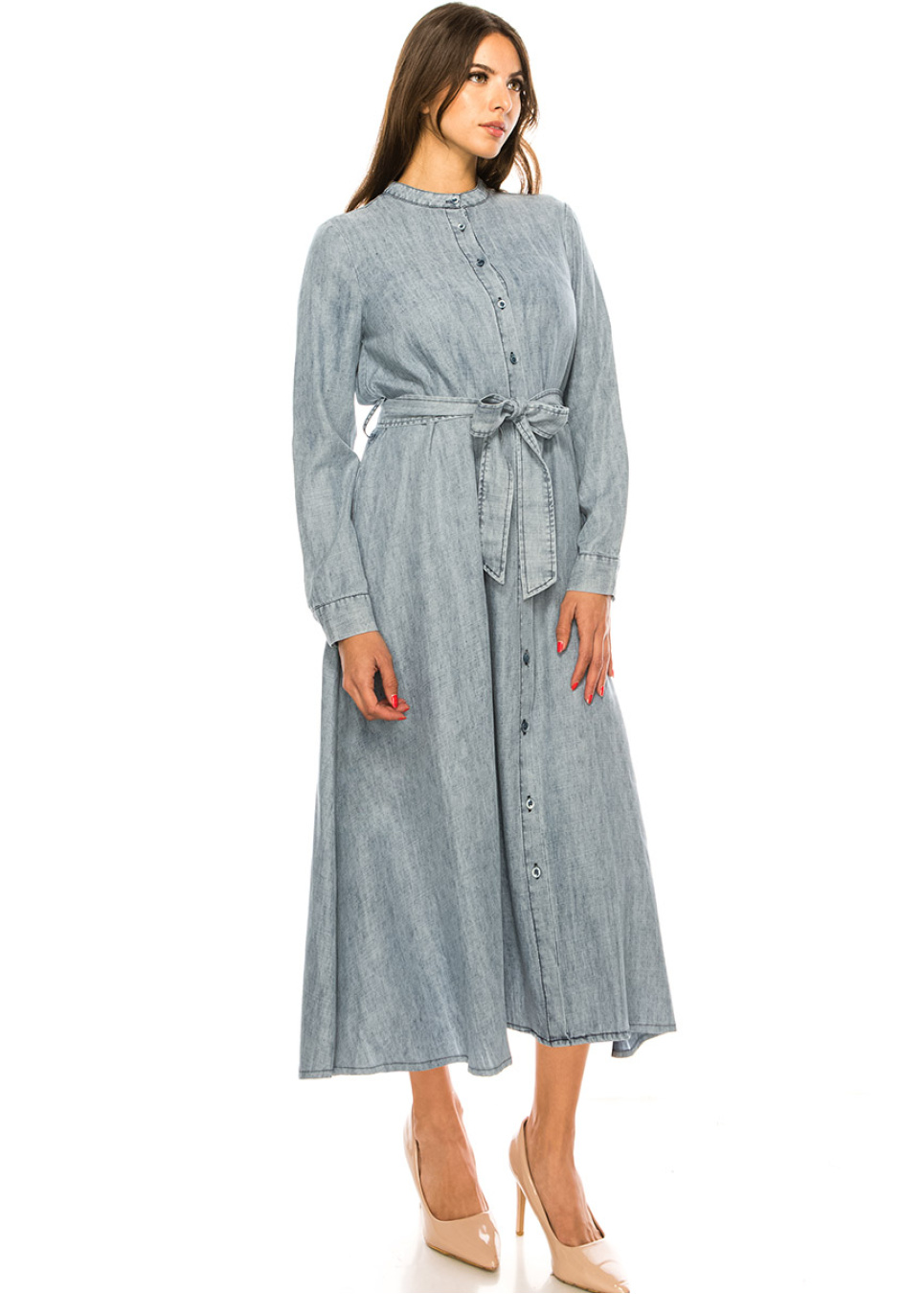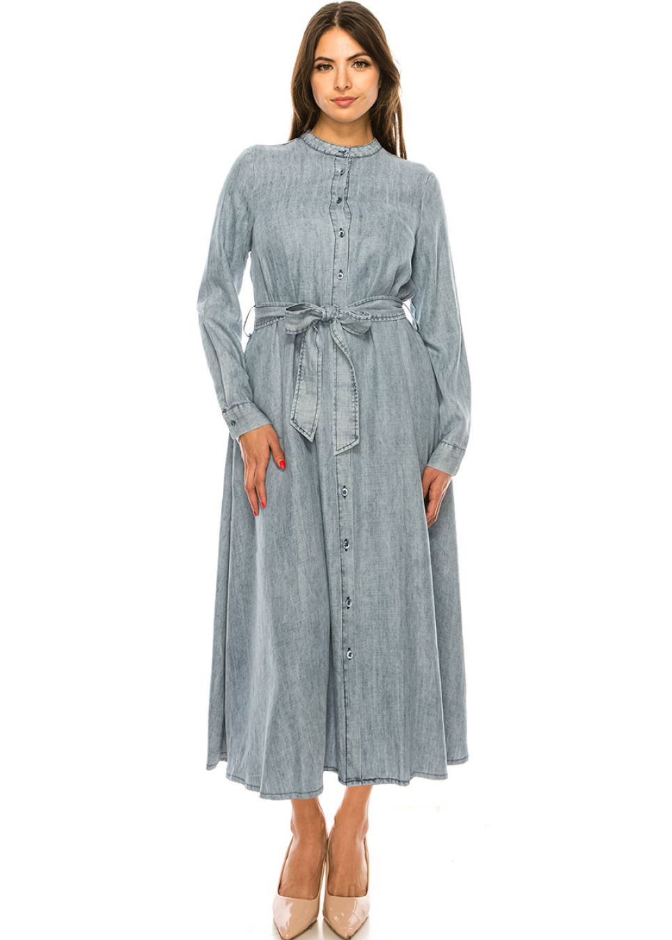 Achieve effortless elegance in our light blue denim maxi dress with a crew neck and button-front design. The dress features a waist belt and cuffs with button details, creating a feminine and sophisticated look with the soft denim fabric. Perfect for a date night or a special occasion.
