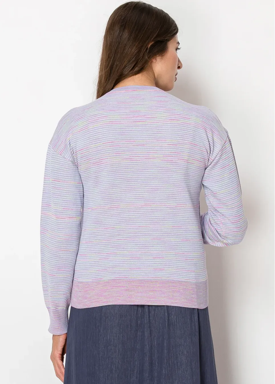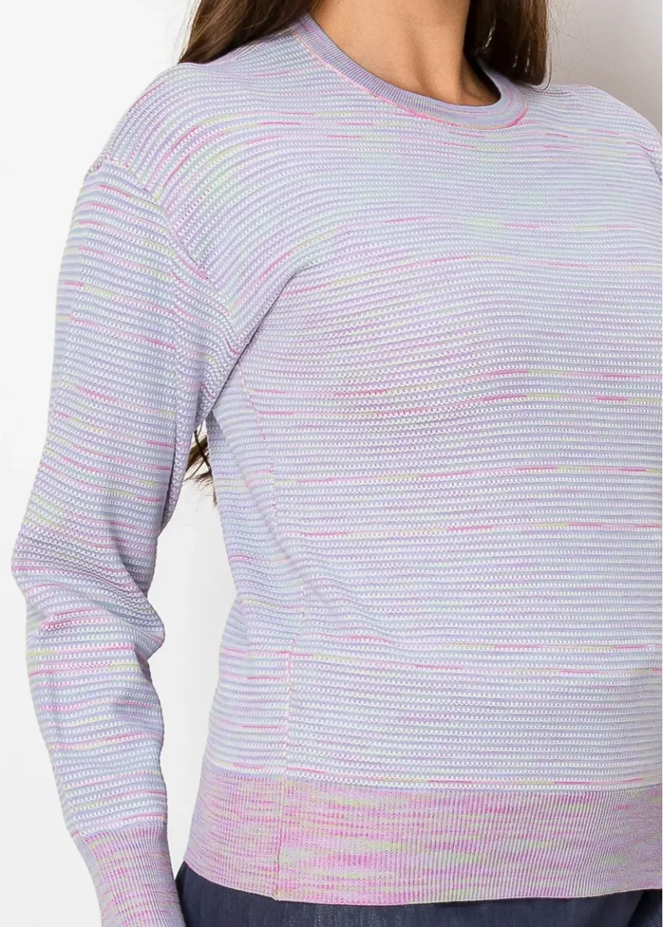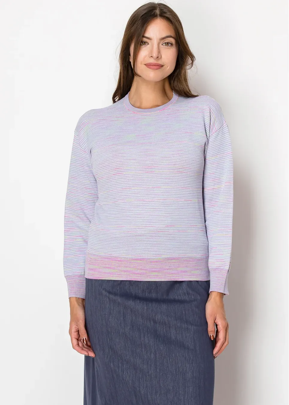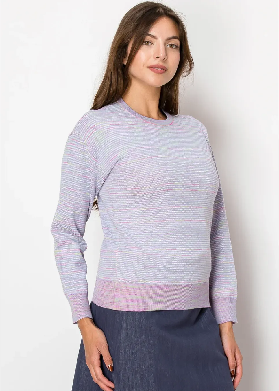 With its soft lavender tones and pastel striping, this sweater exudes calm elegance. The classic crew neckline and ribbed hem ensure a timeless, flattering fit.