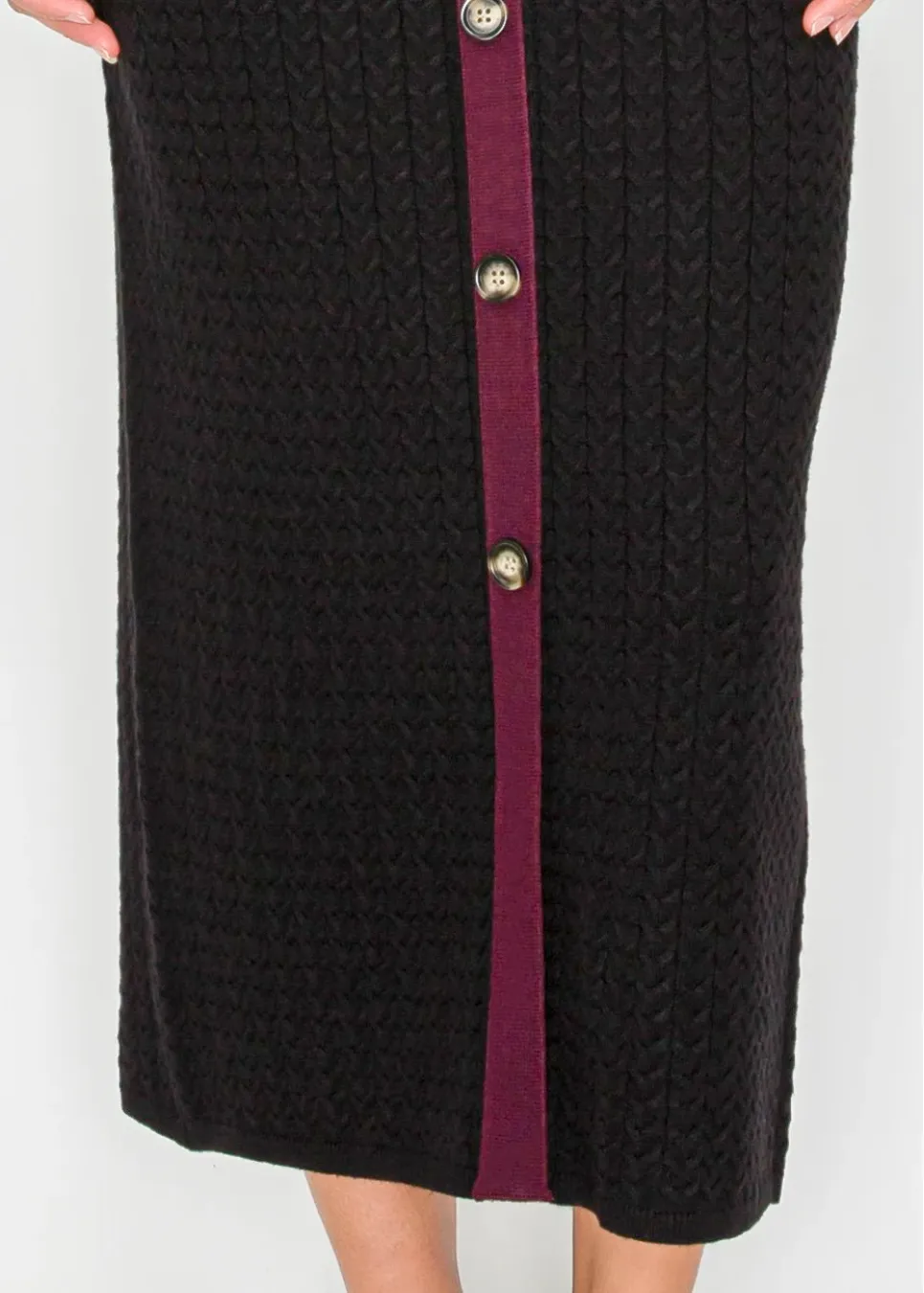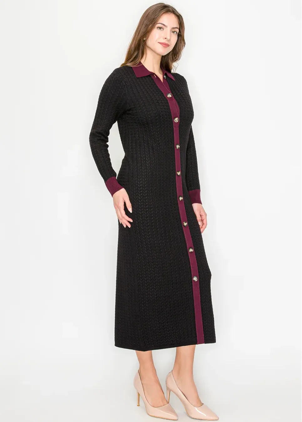 Crafted in a soft cable knit, this full-length dress flatters with its straight cut and vertical button placket. The contrast collar, cuffs, and trim elongate the figure and add tailored detail.