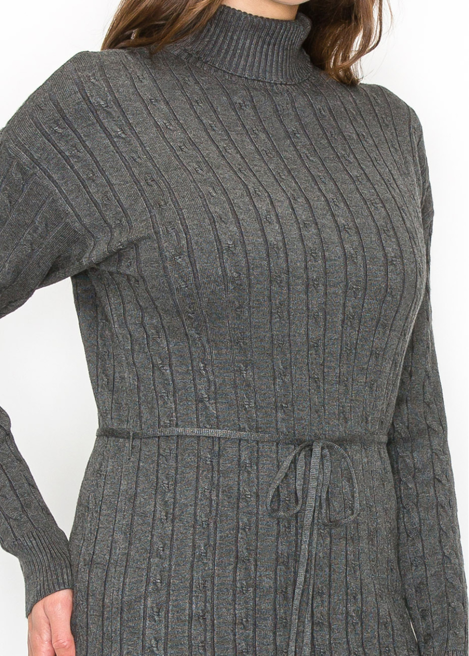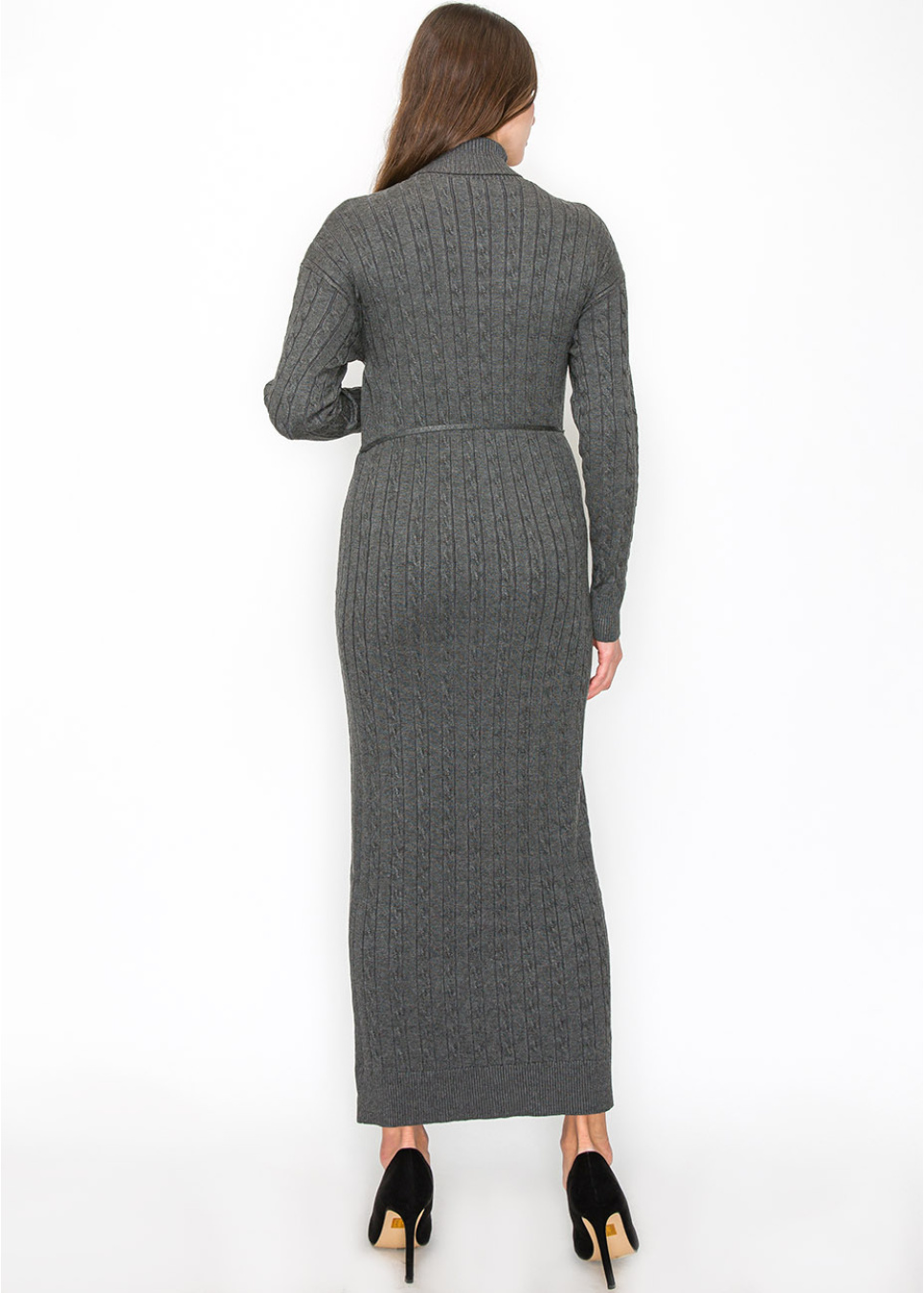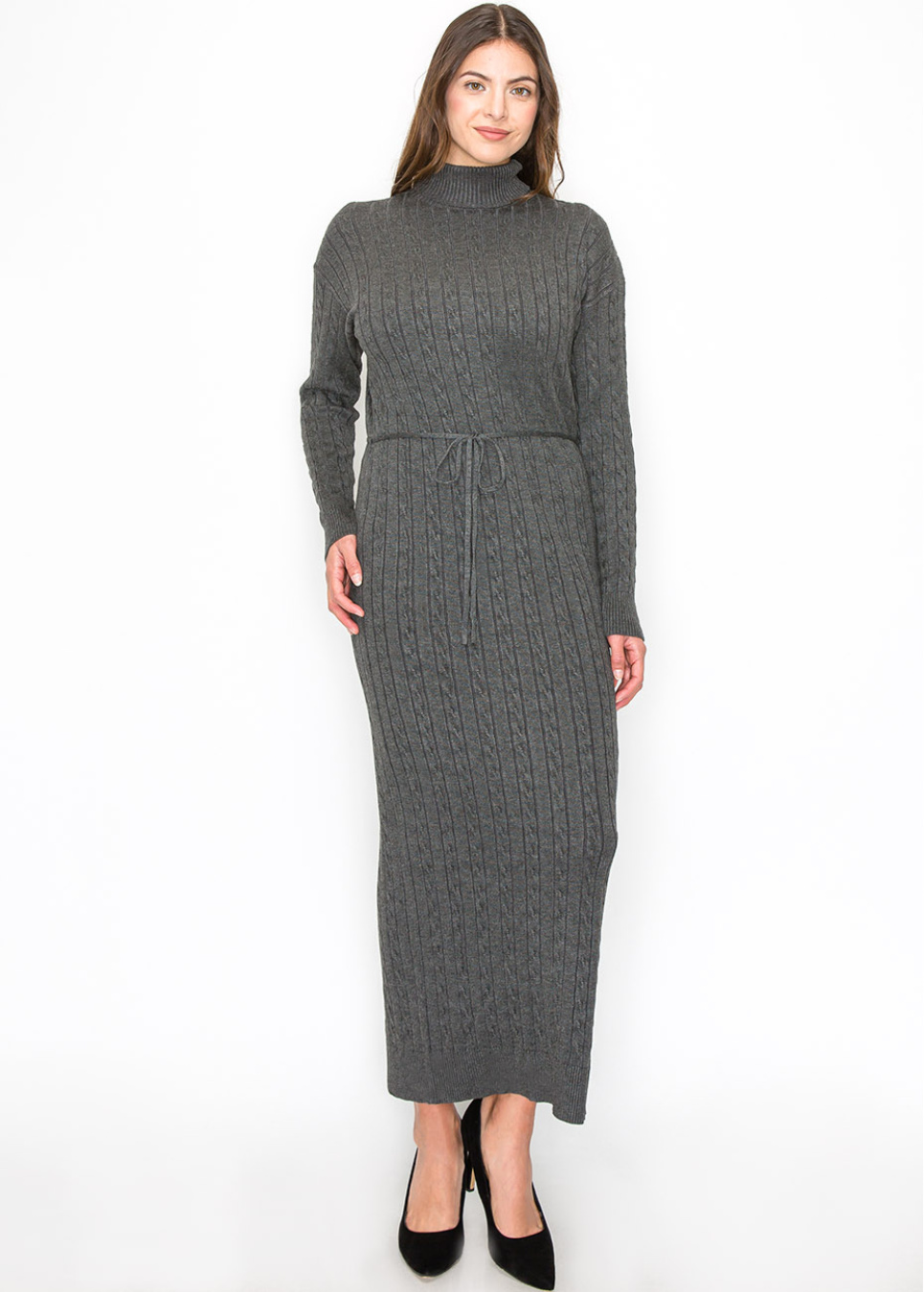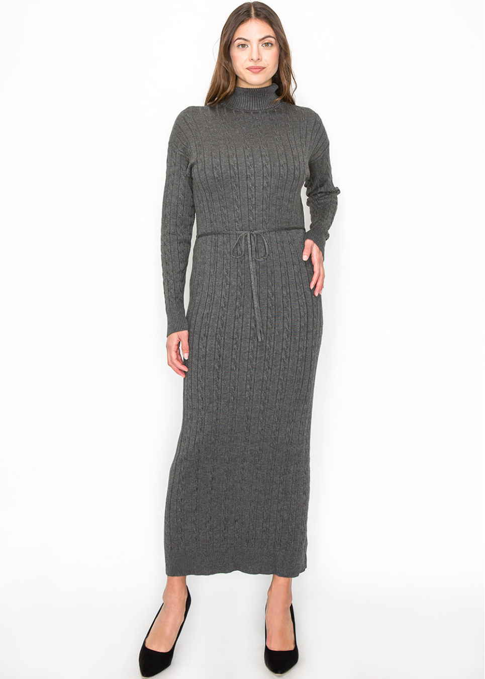 Crafted for both comfort and elegance, this full-length grey knit dress features a classic cable design and long sleeves. The mock neck adds a touch of sophistication, and the waist tie allows for a personalized fit. This dress is perfect for those seeking a modest, timeless look that can be worn for various occasions.