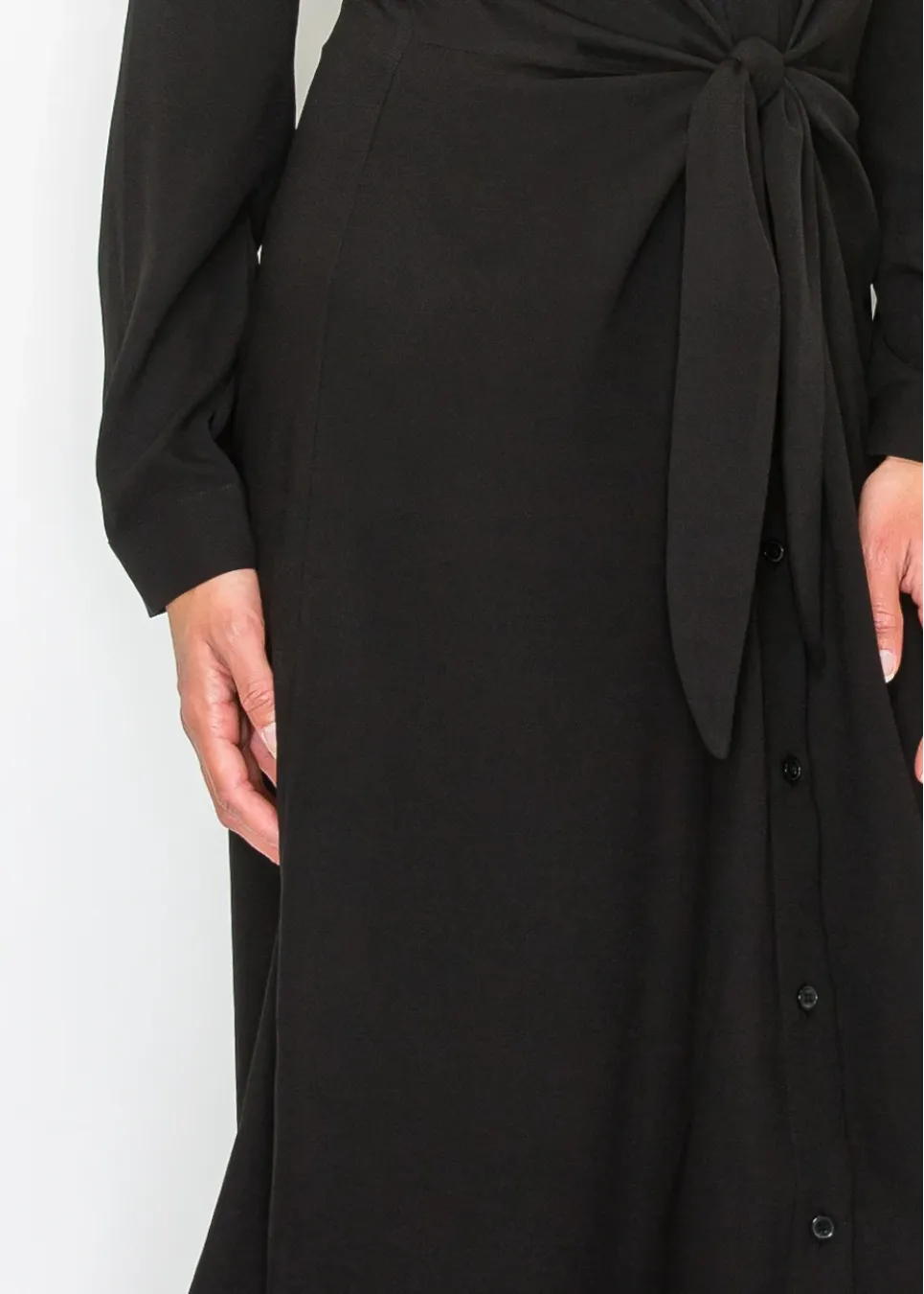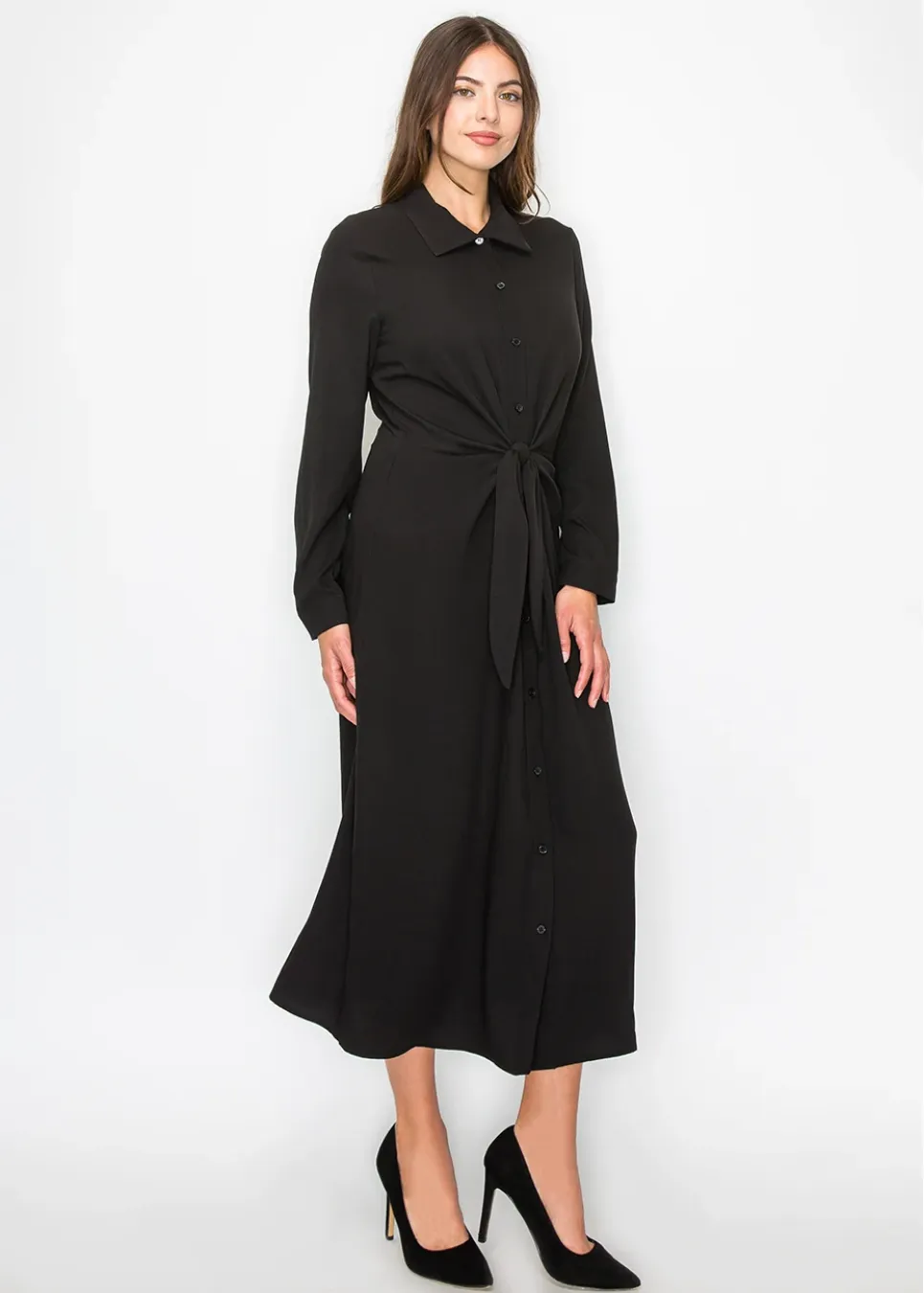 A black button-front dress with a waist tie detail that brings shape and polish to a timeless silhouette. The collared neckline and long sleeves make it versatile for both work and evenings out.