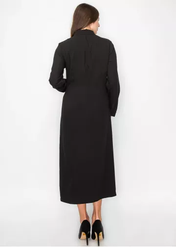 A black button-front dress with a waist tie detail that brings shape and polish to a timeless silhouette. The collared neckline and long sleeves make it versatile for both work and evenings out.