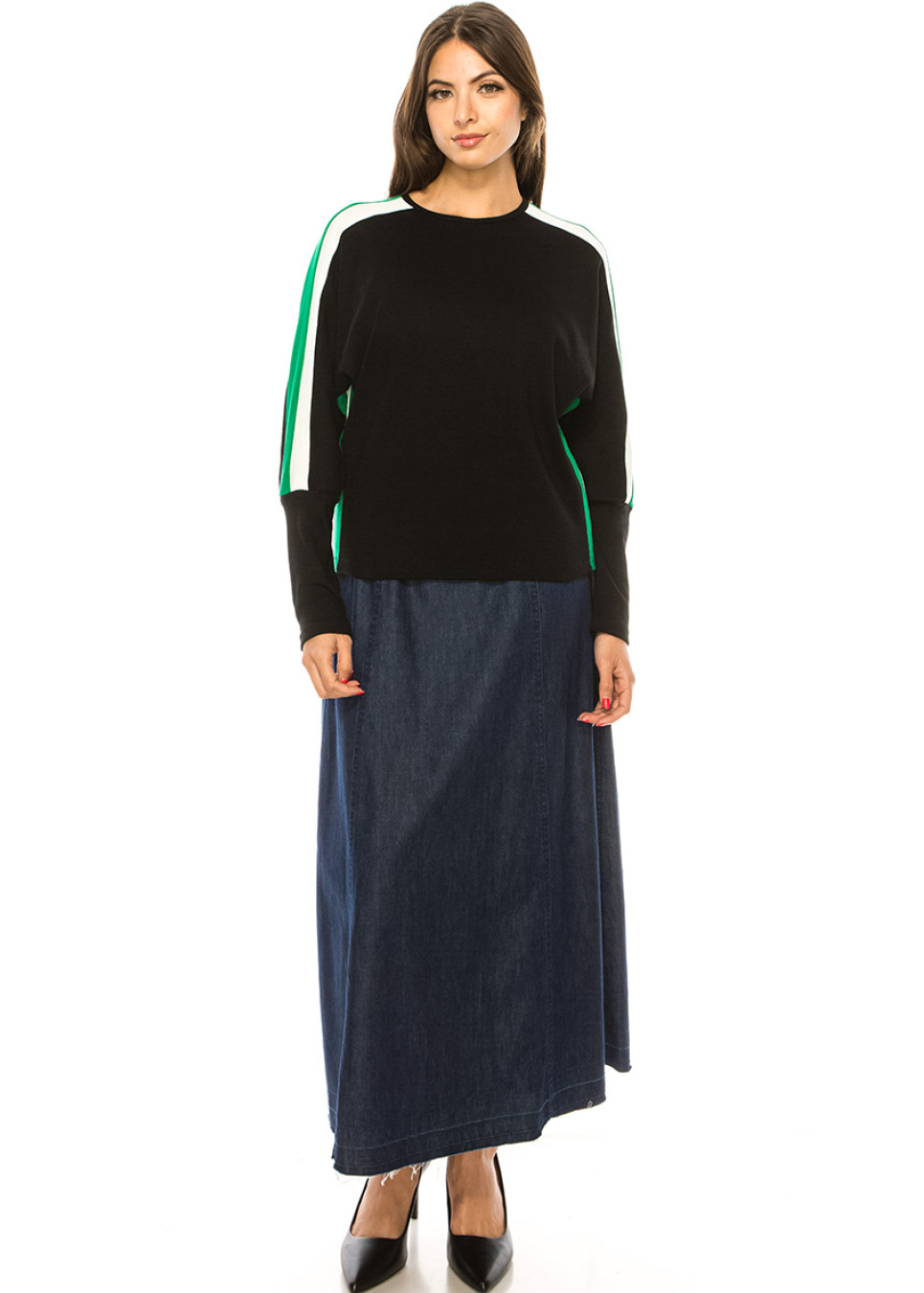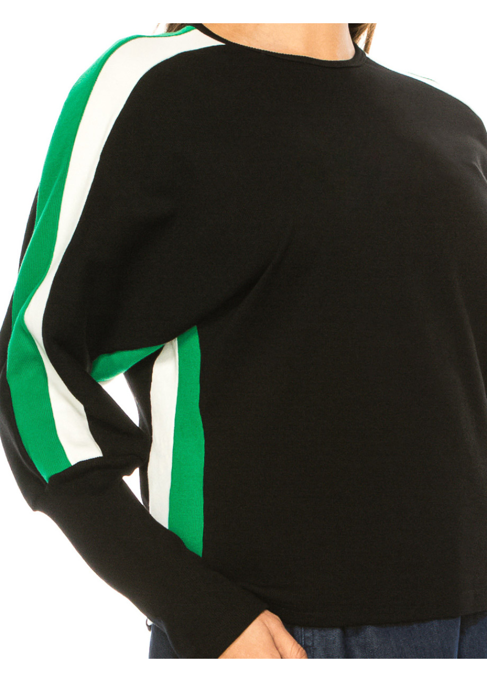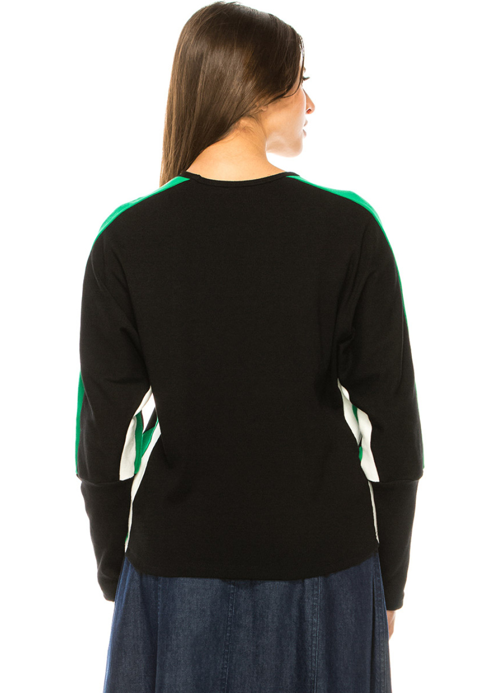 Add some edge to your wardrobe with this Long Sleeve T-Shirt. The green and white side stripes on the black shirt create a bold and modern look, while the loose fit and lightweight fabric make it a comfortable and practical choice. Perfect for those who want to stand out from the crowd.