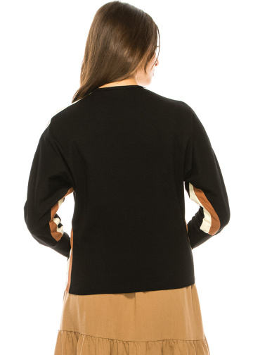 Have some fun with your wardrobe with this Long Sleeve T-Shirt. The camel and cream side stripes on the black shirt create a playful and trendy look, while the loose fit and lightweight fabric make it a comfortable and practical choice. Perfect for those who want to add some personality to their outfits.