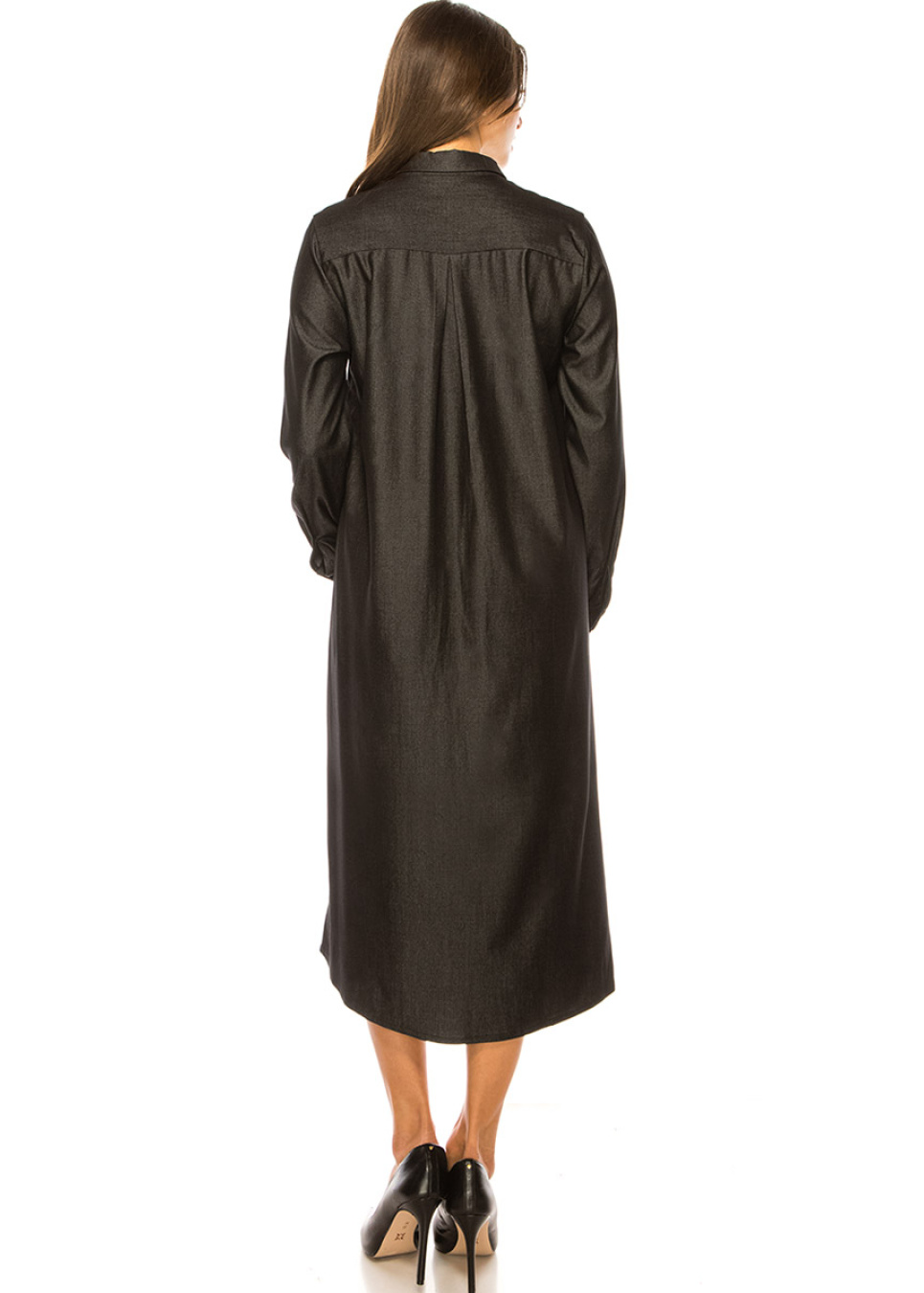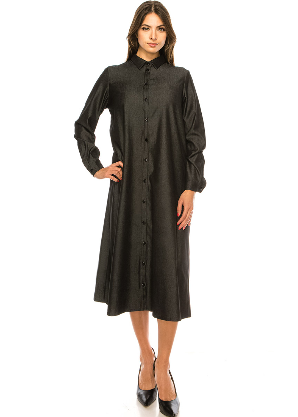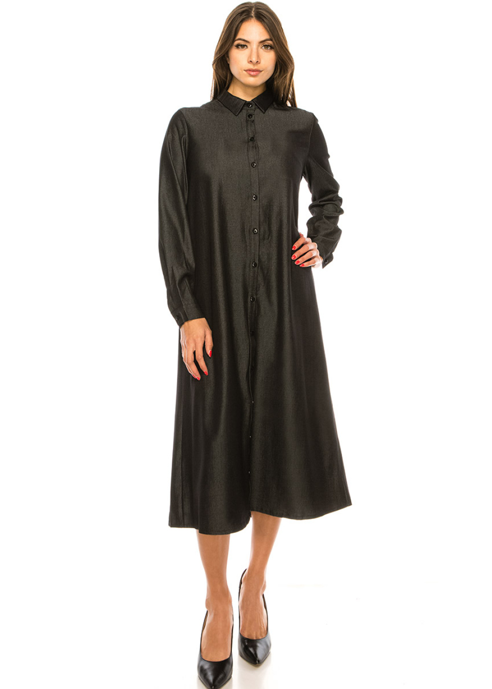Step into the spotlight with this stunning black midi dress made from denim fabric. Featuring a classic shirt collar and button-down front, this dress exudes elegance and sophistication. The midi length and long sleeves provide a demure appearance, making it perfect for any occasion. Its classic design reflects your unique personality and adds a touch of magic to your day, whether you're running errands or settling in with a good book.
