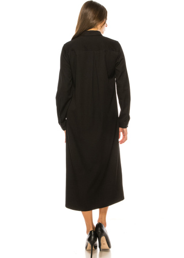 This black midi dress made from twill fabric featuring a classic shirt collar and button-down front is the epitome of simplicity and elegance. The midi length and long sleeves provide a timeless and modest look, making it a versatile addition to any wardrobe.