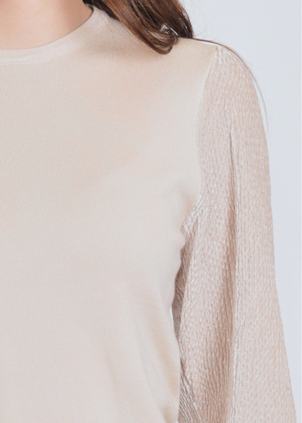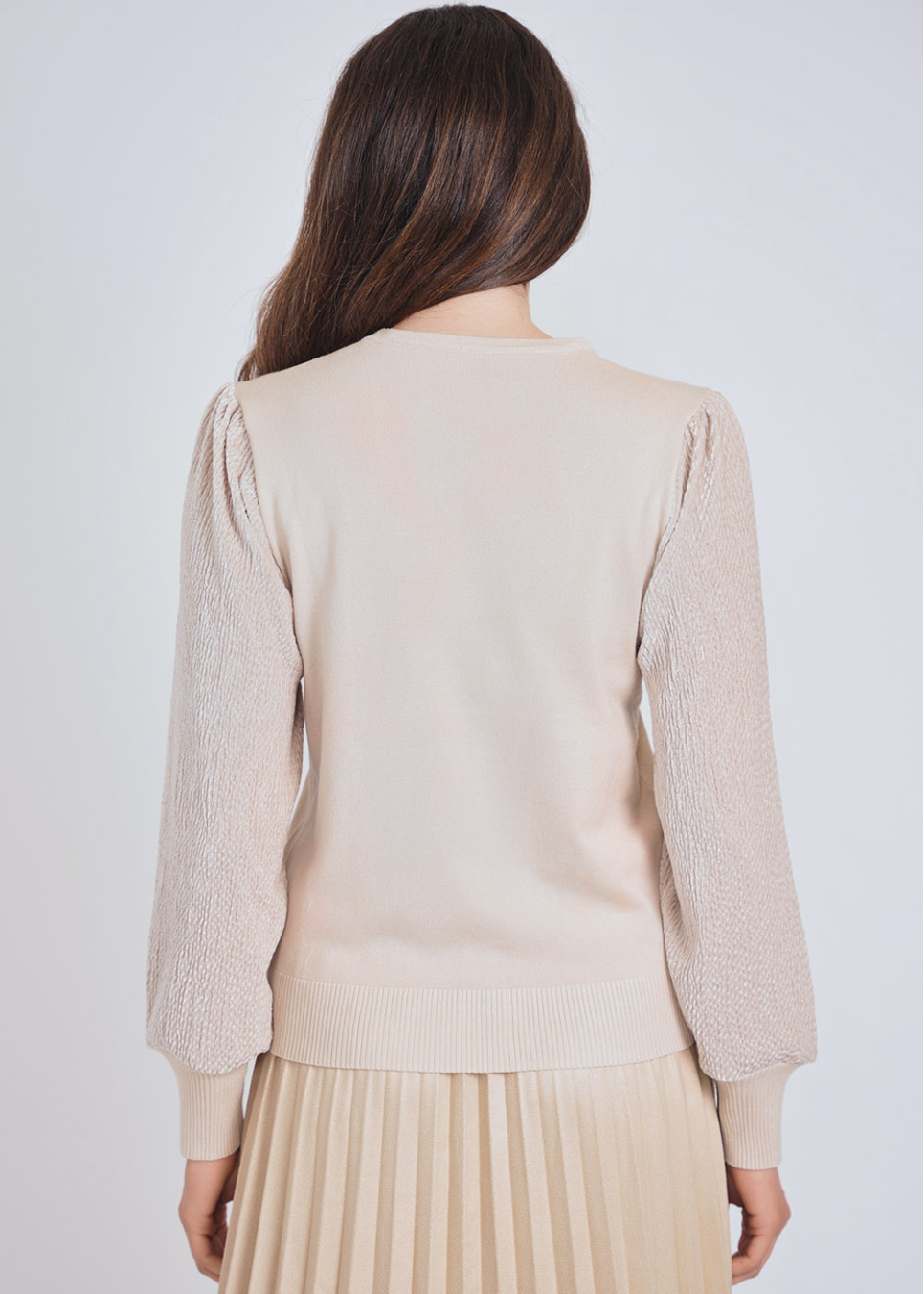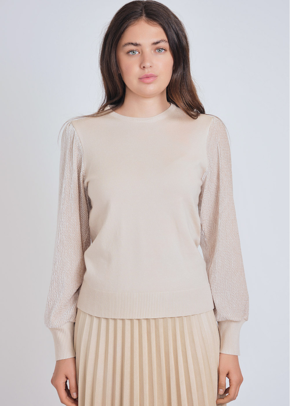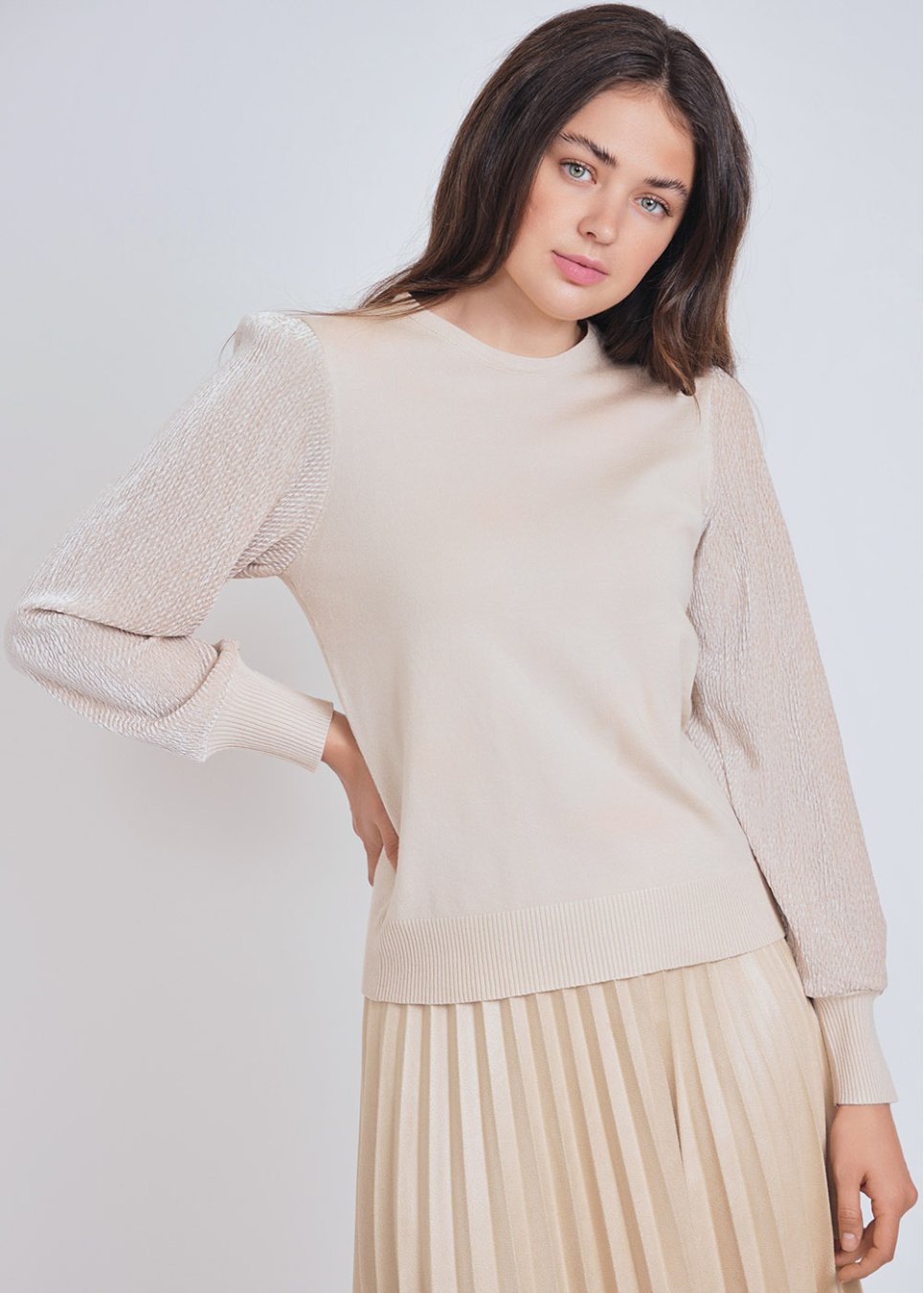 Beige Ribbed Sleeve Crewneck Sweater