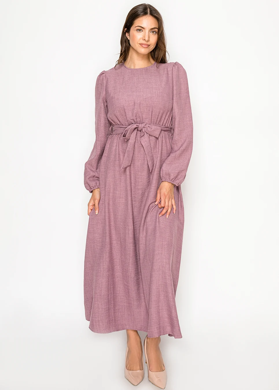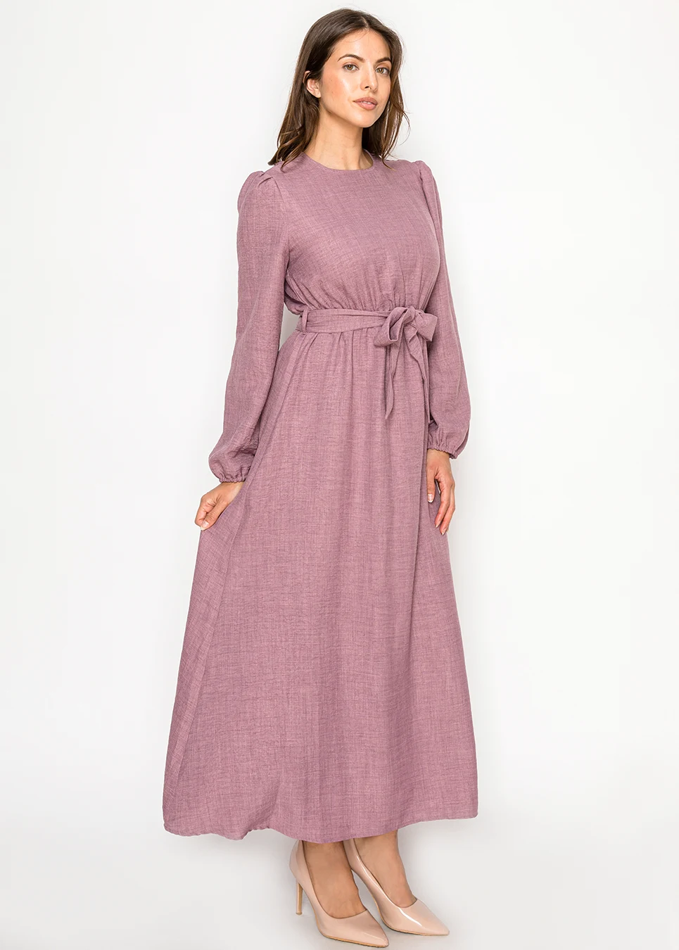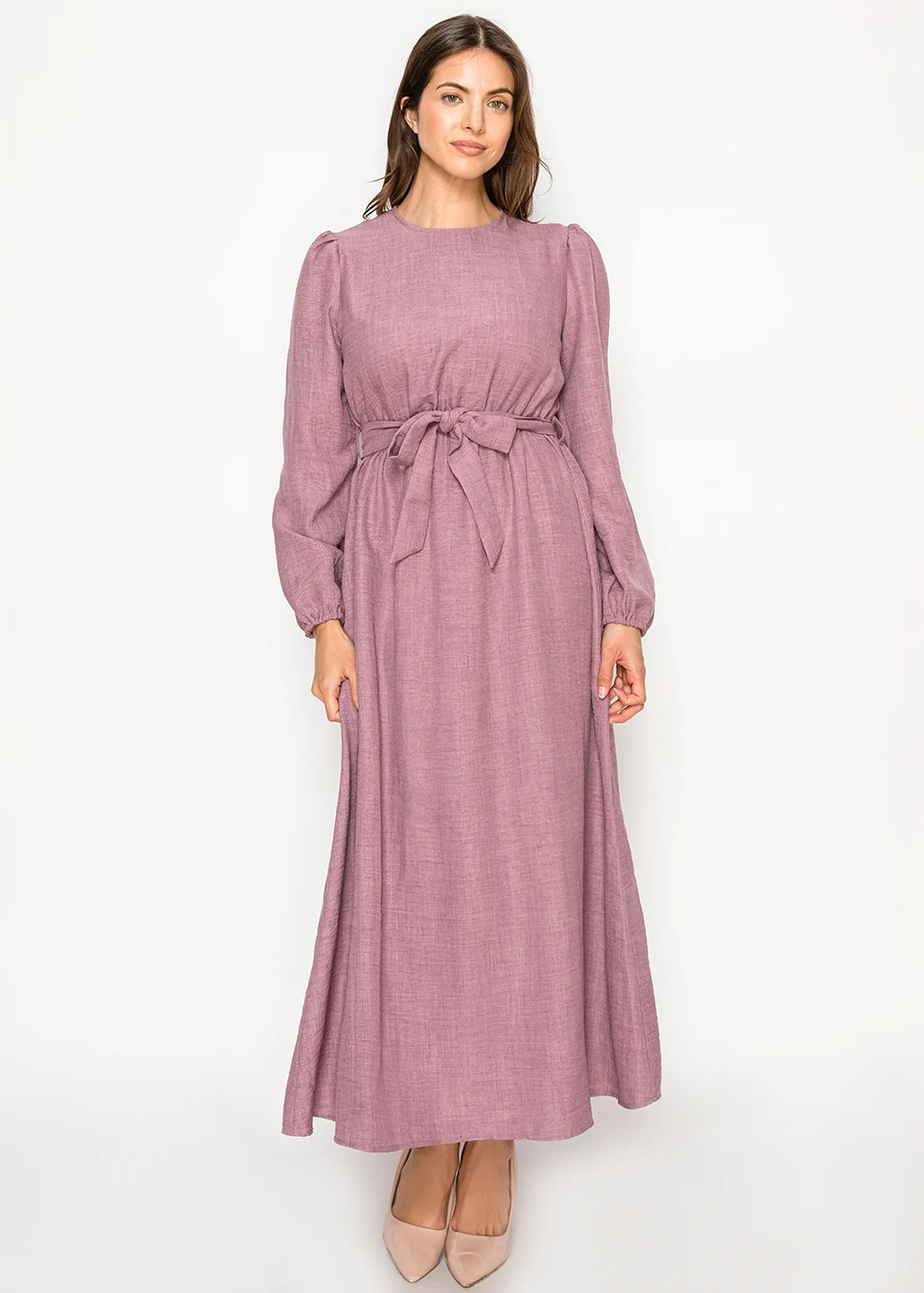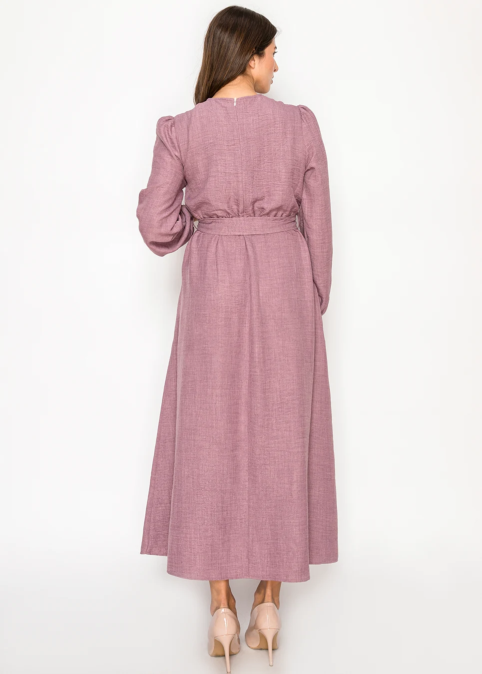 Understated elegance in the easiest form: a flowing maxi with a refined neckline and a softly defined waist. The muted mauve reads elevated and timeless, perfect when you want to look polished with zero effort.