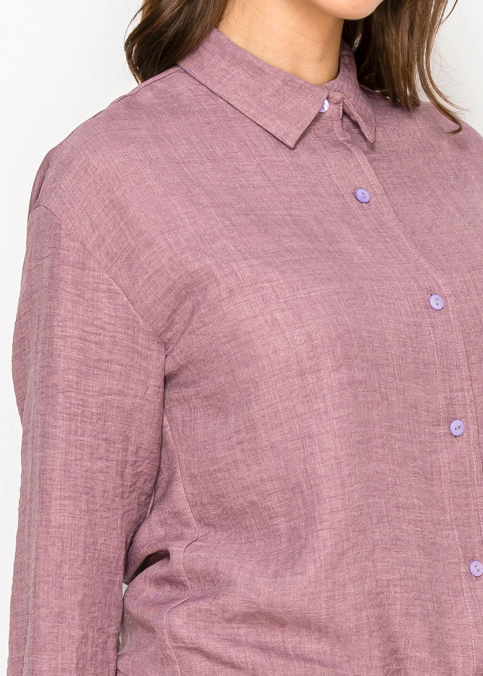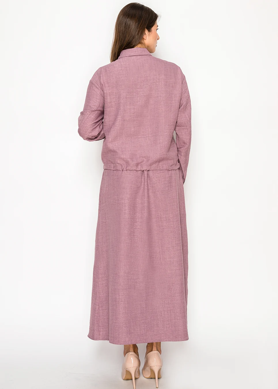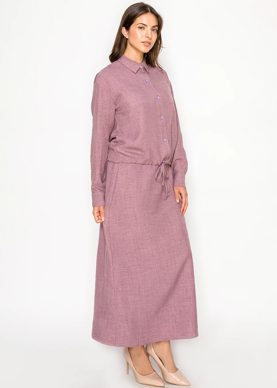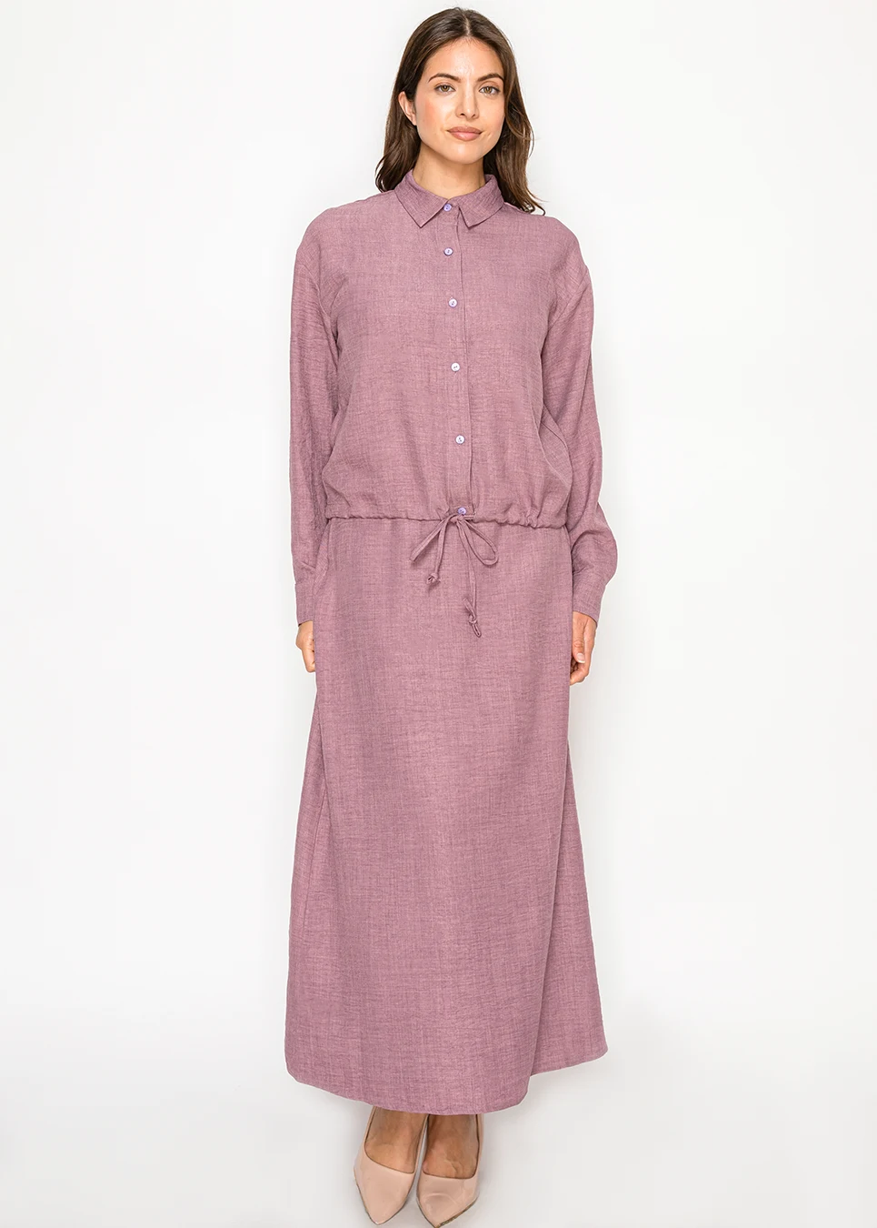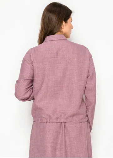 Some days you want something simple that still looks put together. This blouse does exactly that — a clean button front, soft mauve color, and a drawstring waist that creates gentle shape without losing that easy, relaxed feel.