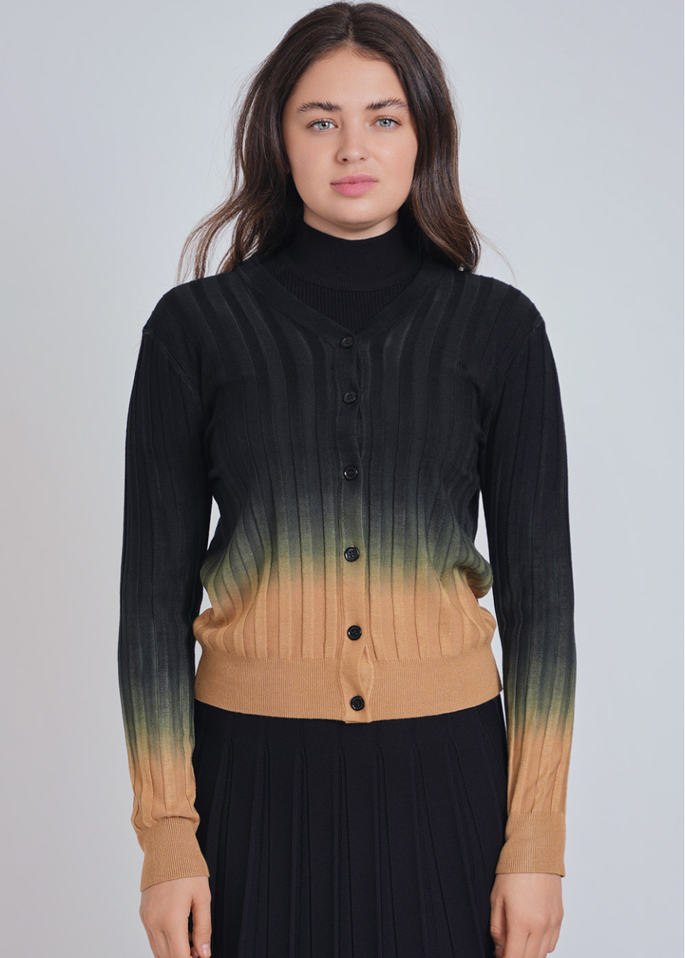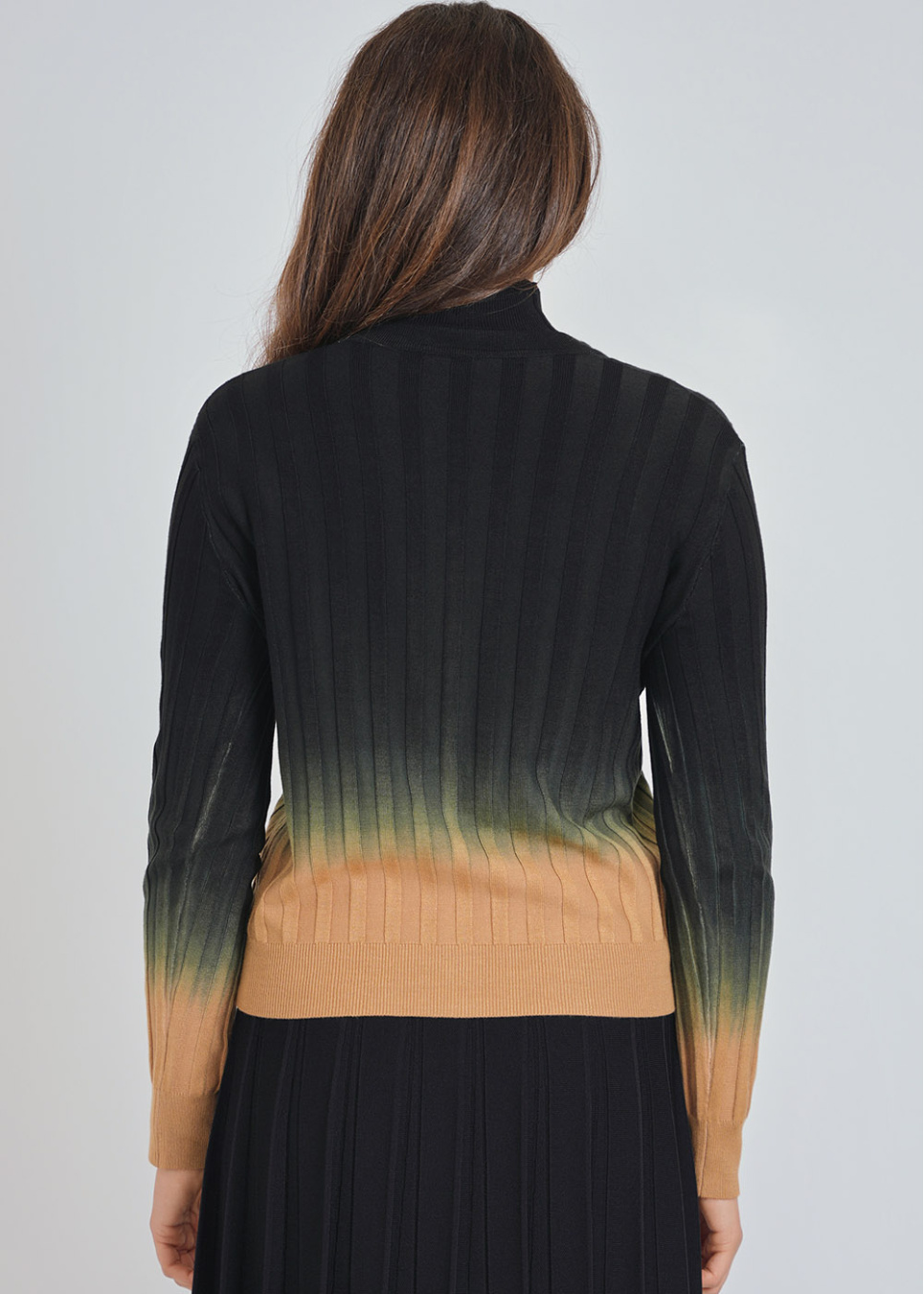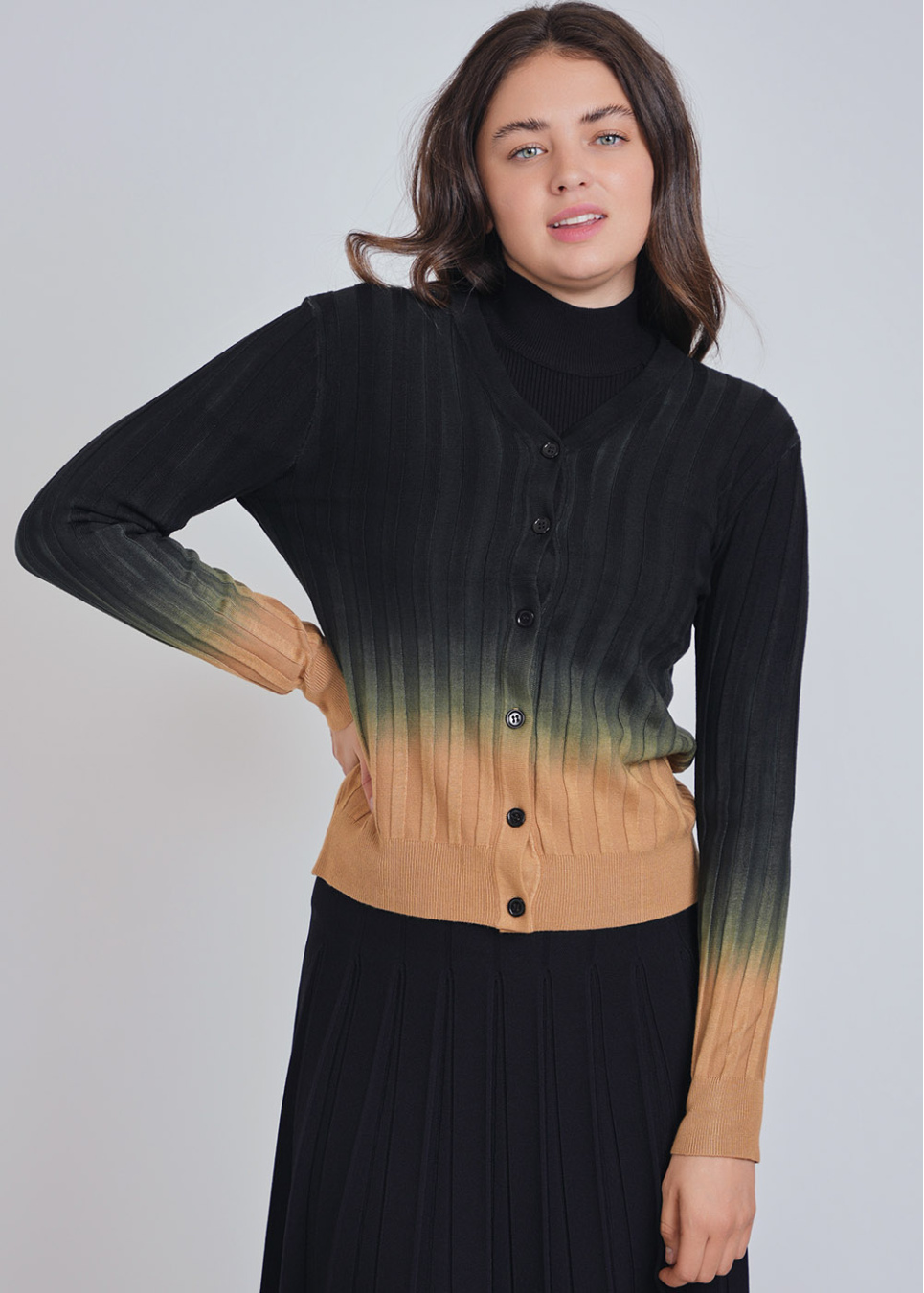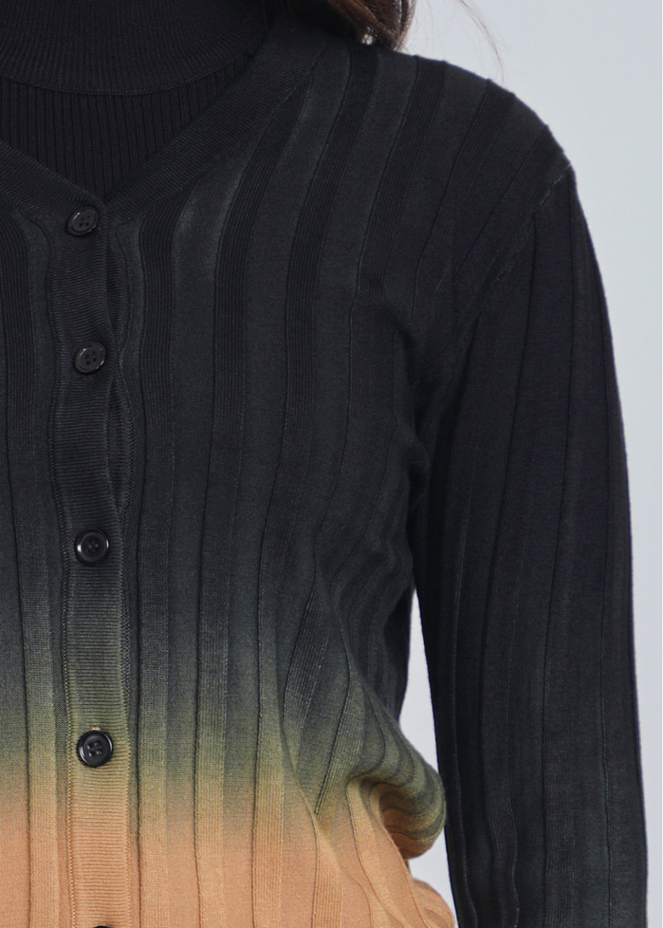 Melding Shades Cardigan: Camel to Black Rib Knit