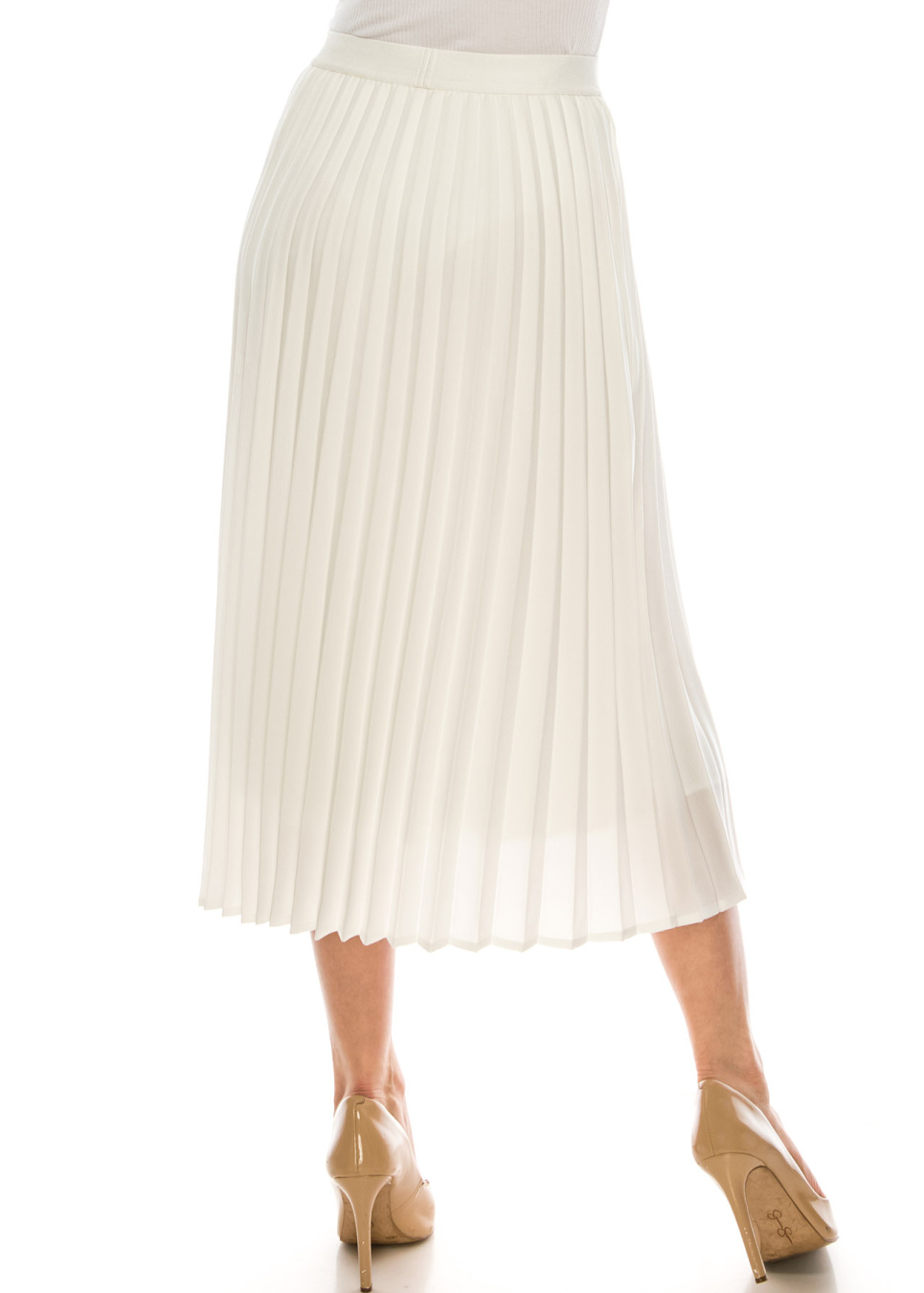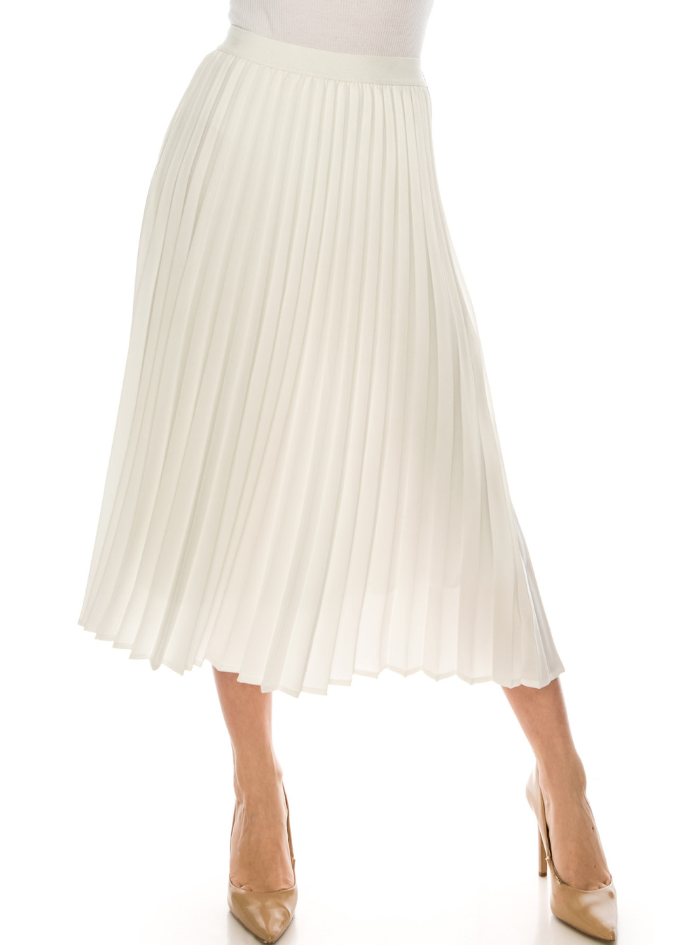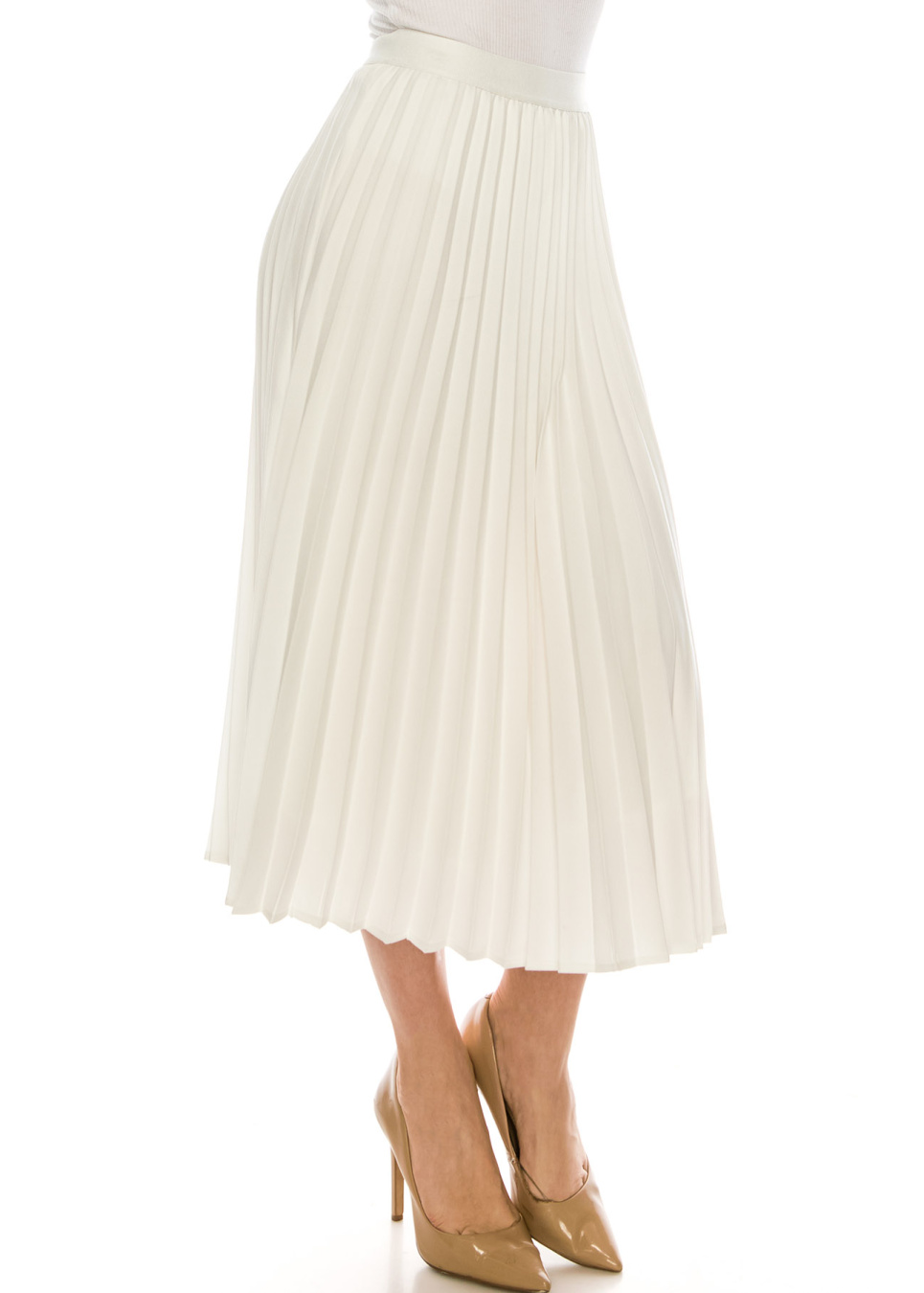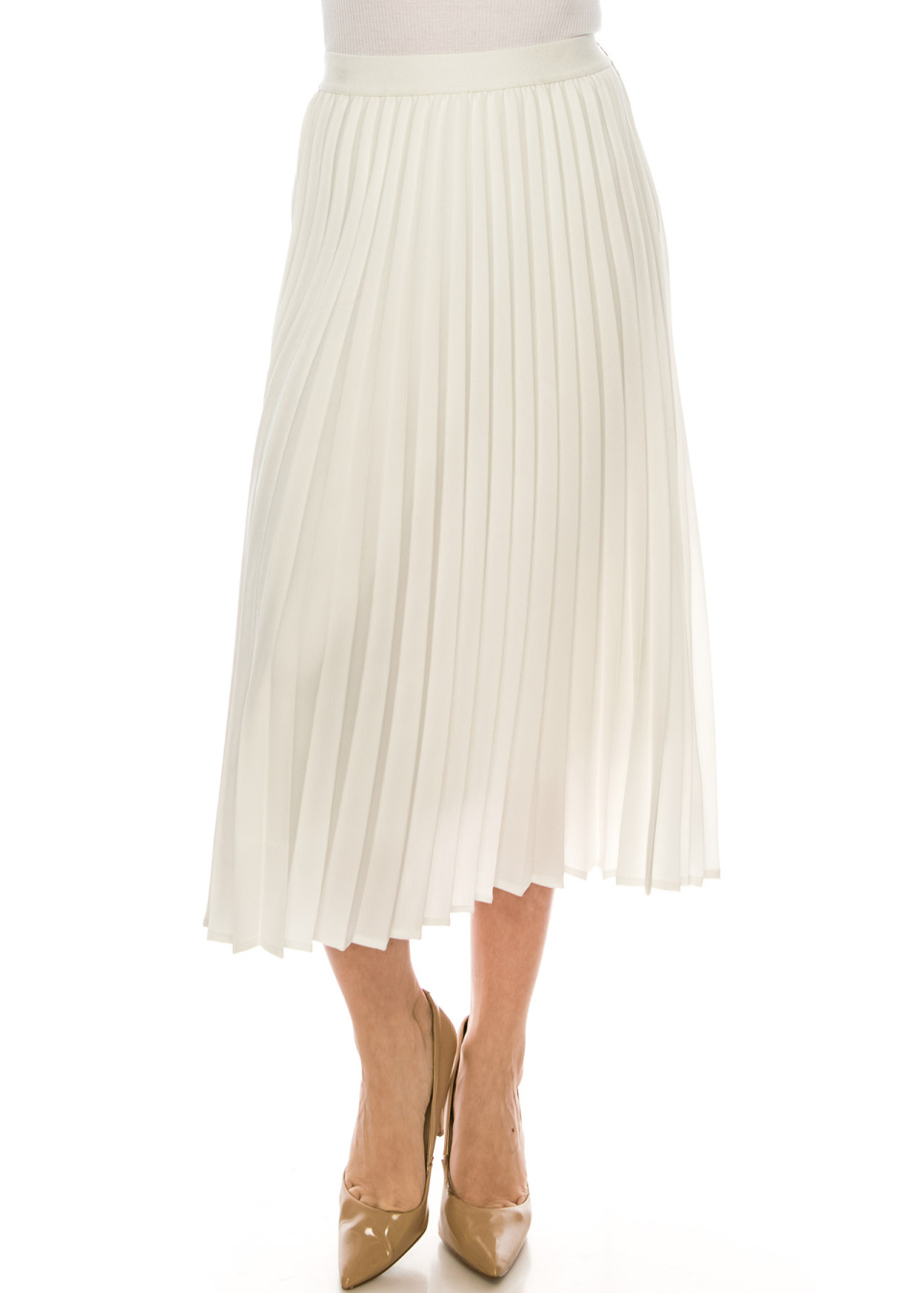 - This pleated skirt is so flattering. We designed this skirt in a way that it would lay flat on the stomach then starts pleating after.