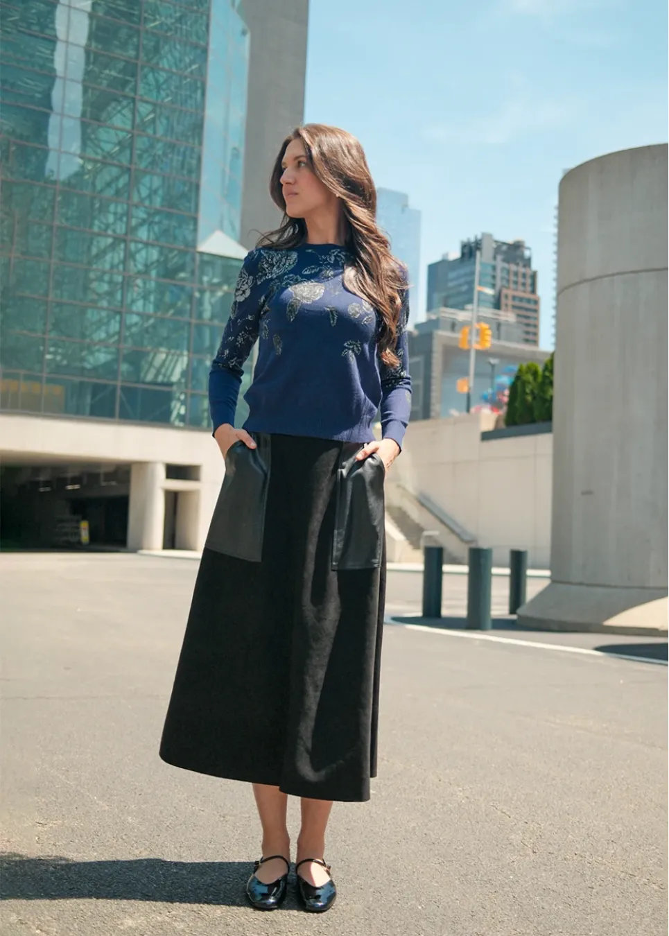 Metallic florals meet leather textures for a bold update. A sweater-and-skirt pairing that blends elegance with edge.