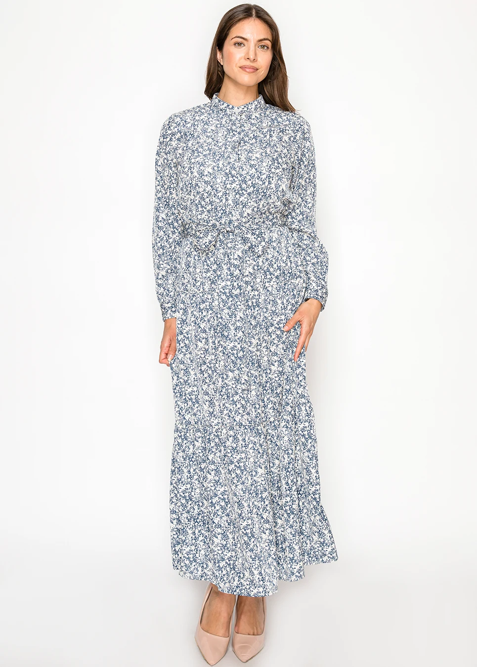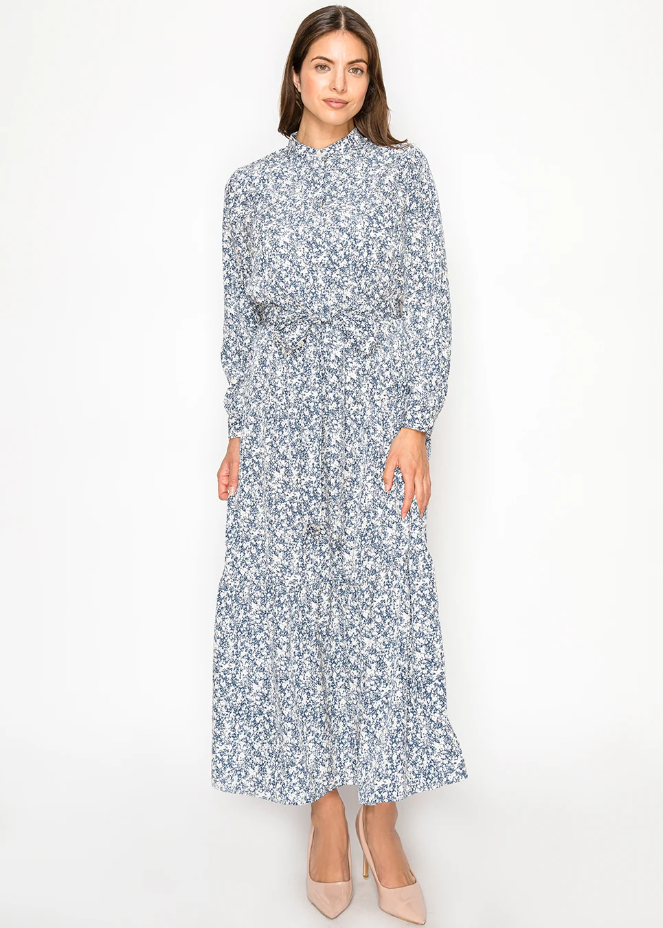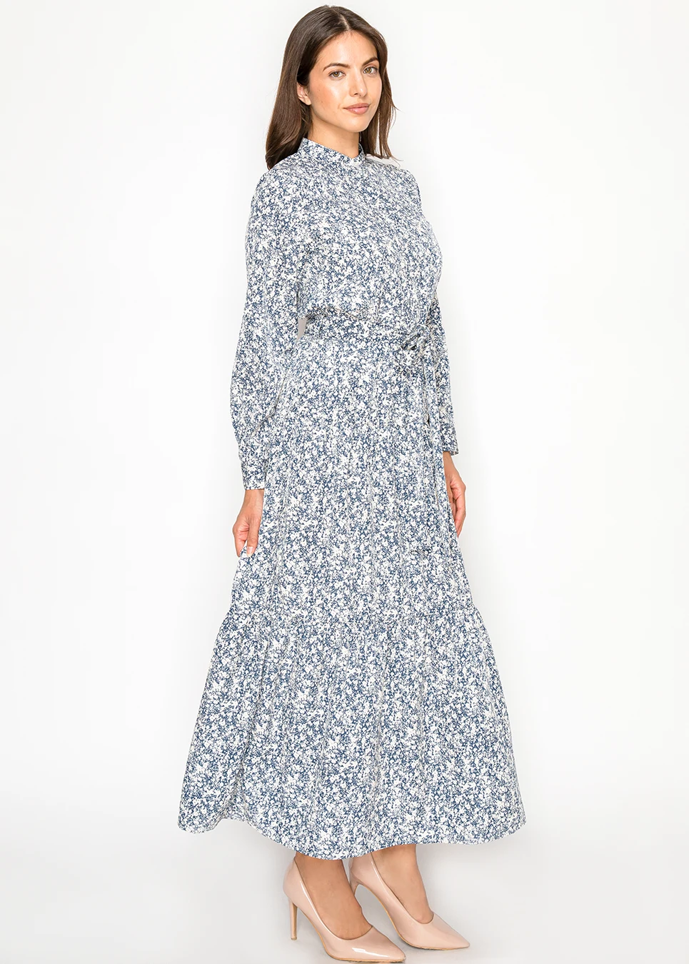 Blue Floral Midi Shirt Dress with Belted Waist