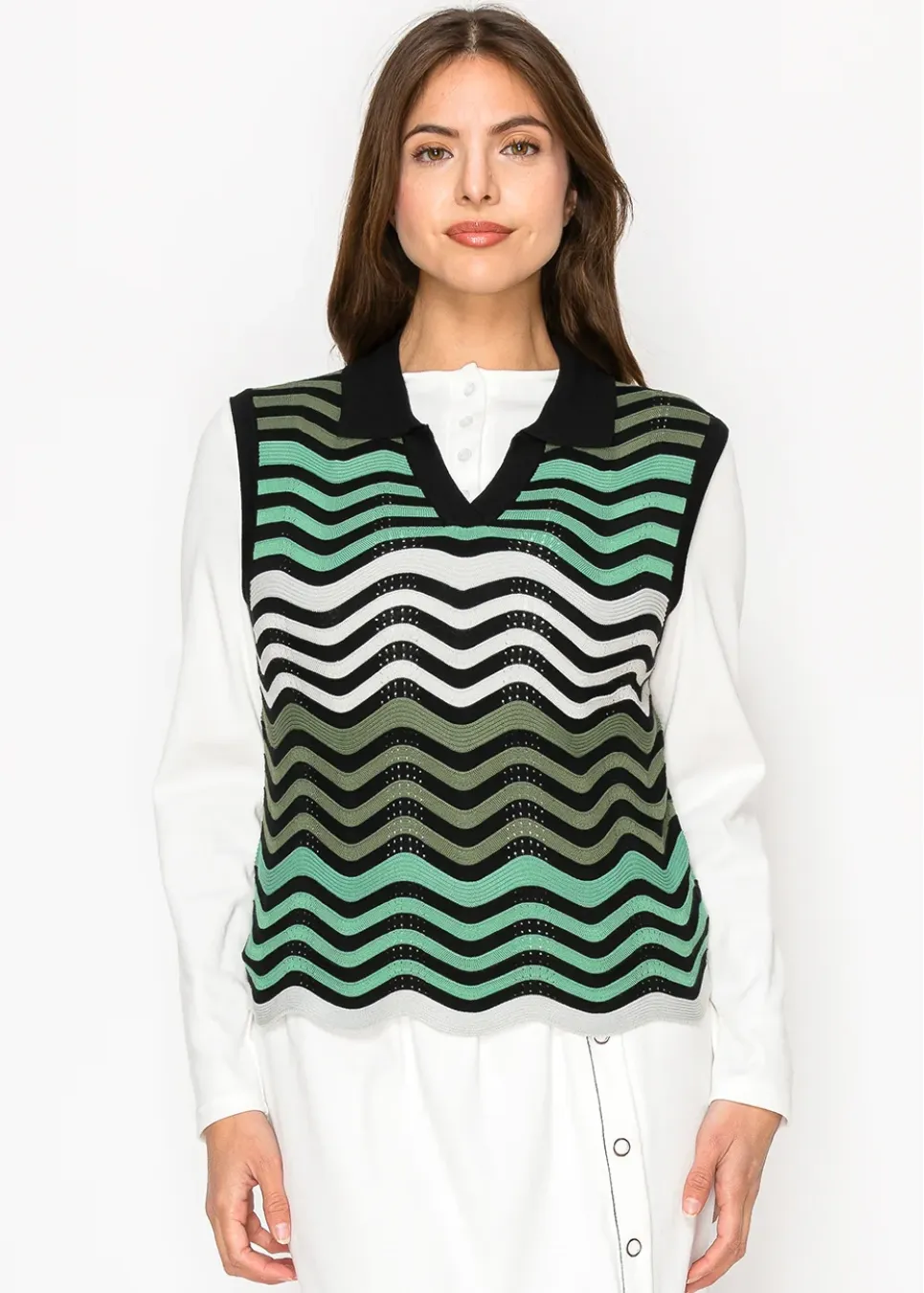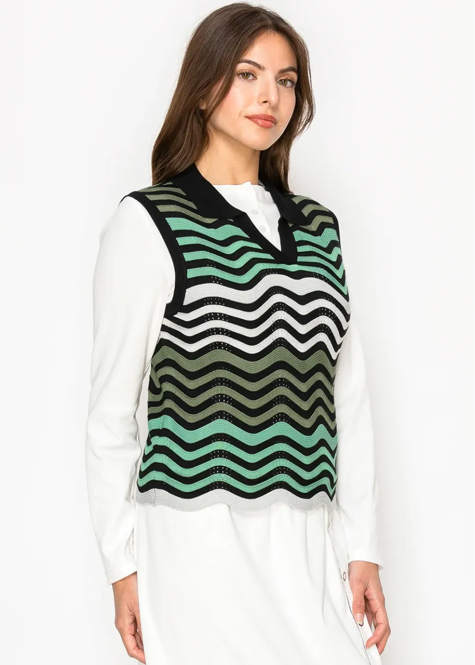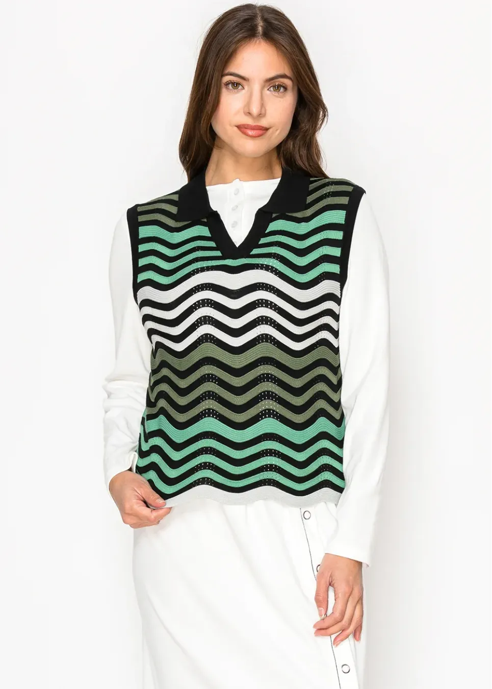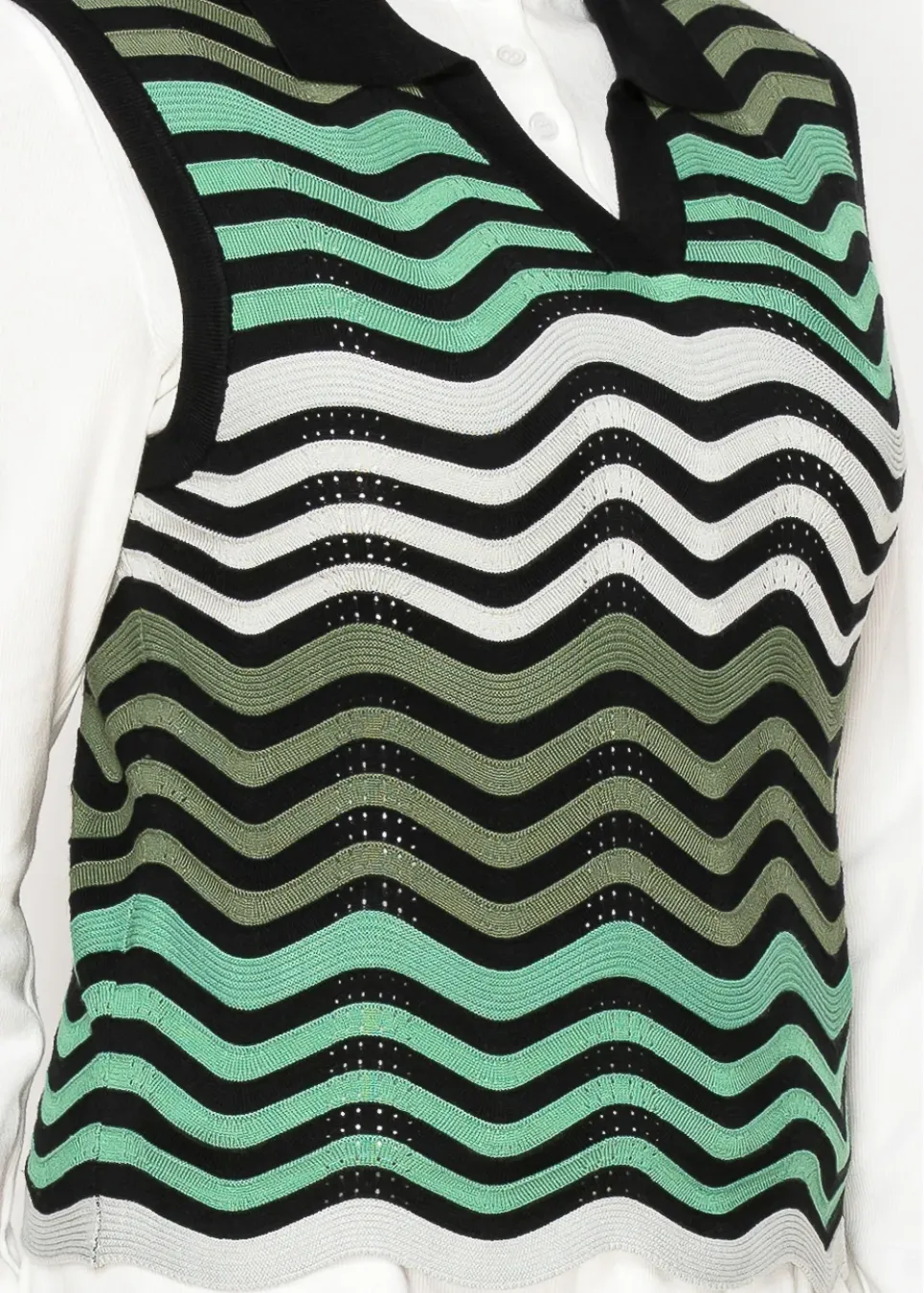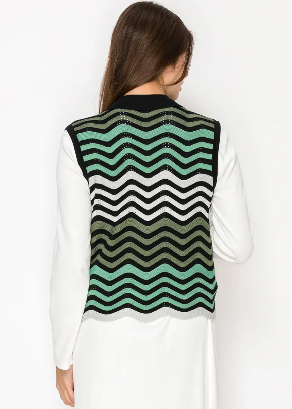 This lightweight knit vest is all about effortless layering. The wavy green, white, and black pattern adds a fun, modern touch to any outfit. Perfect over a white button-down for a polished but relaxed vibe. Its breathable design keeps things comfortable, whether you’re out and about or staying in.