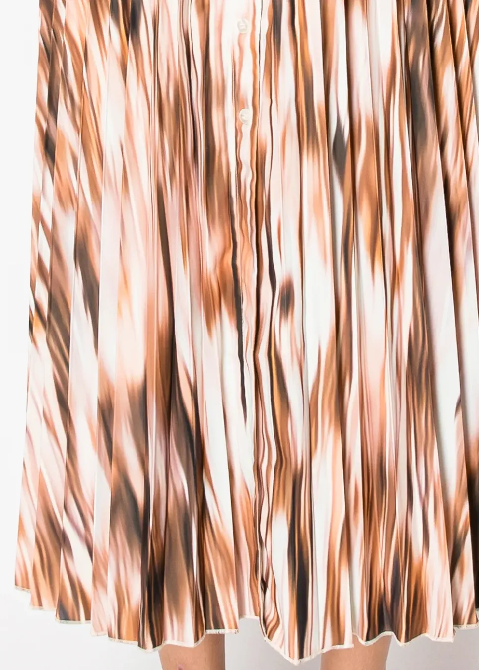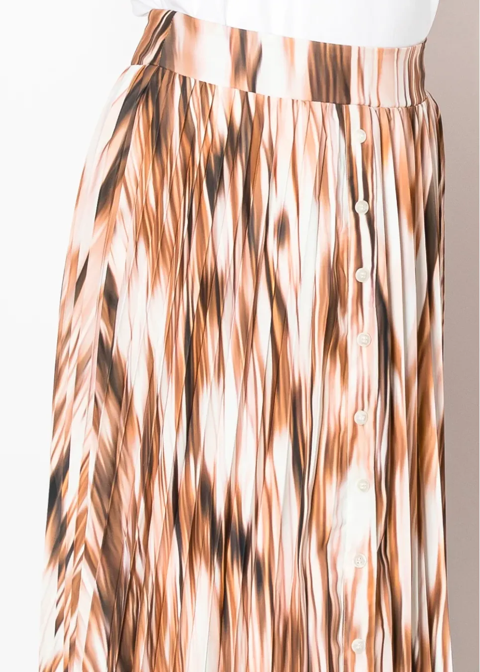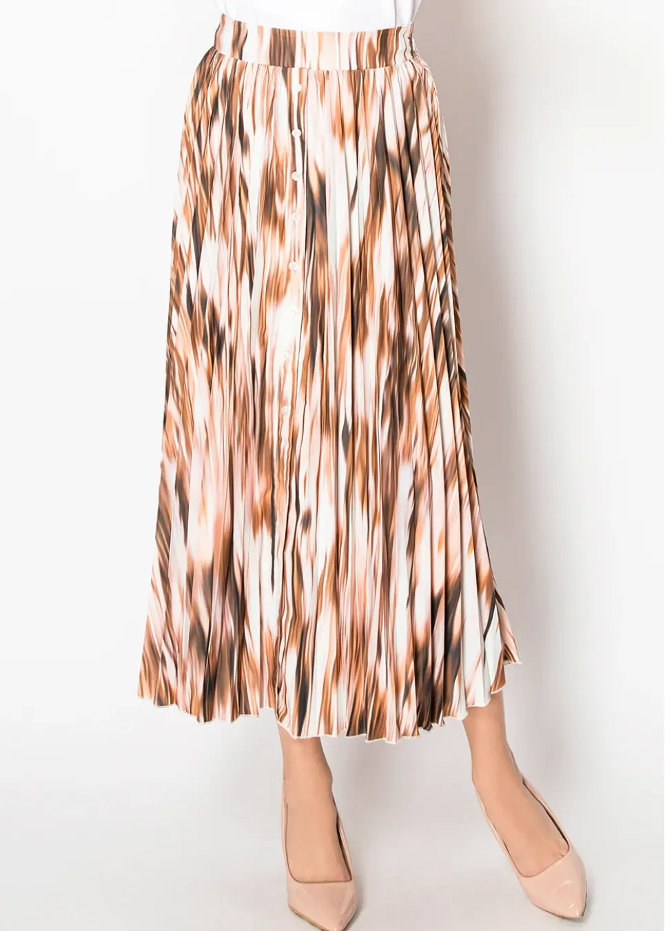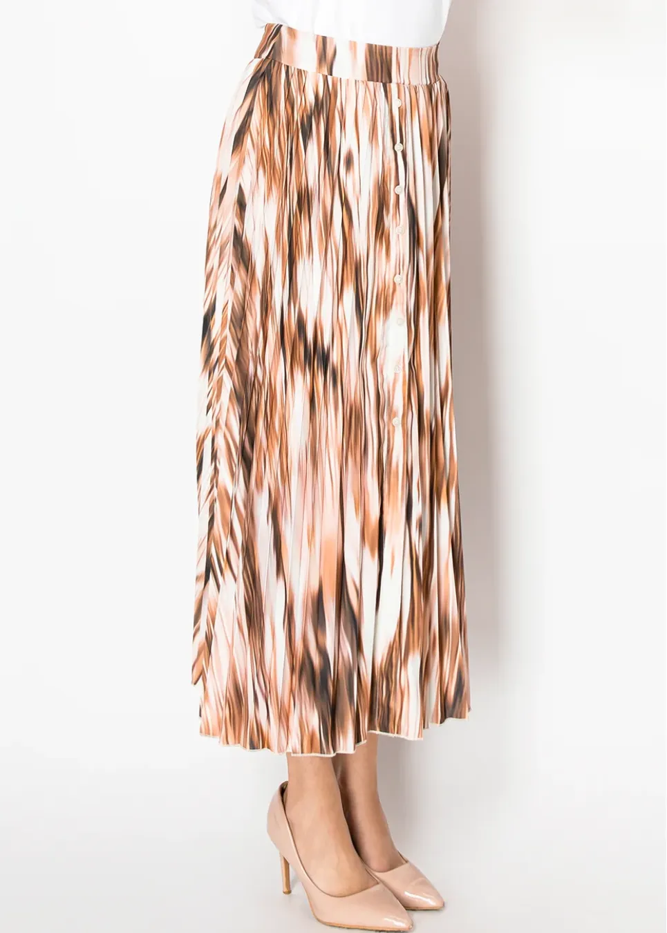 A warm cinnamon brown print flows through soft pleats, creating a graceful silhouette. The button-down front adds a classic detail, while the smooth, airy fabric makes this skirt feel as good as it looks.