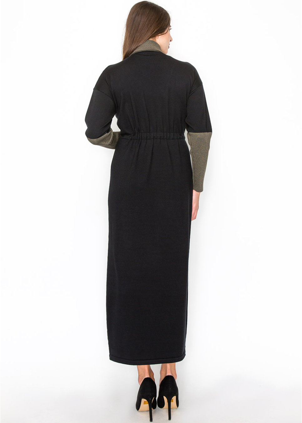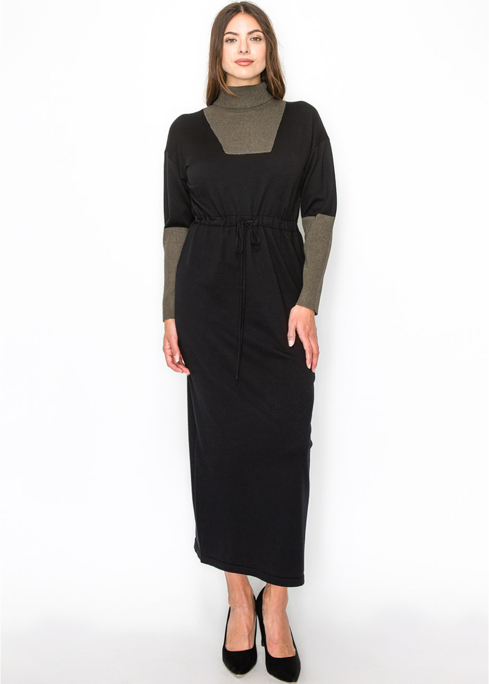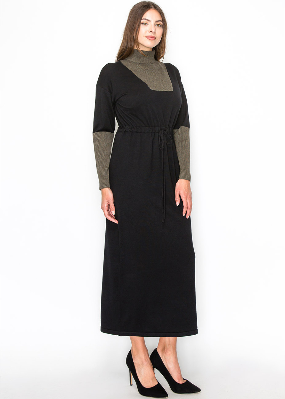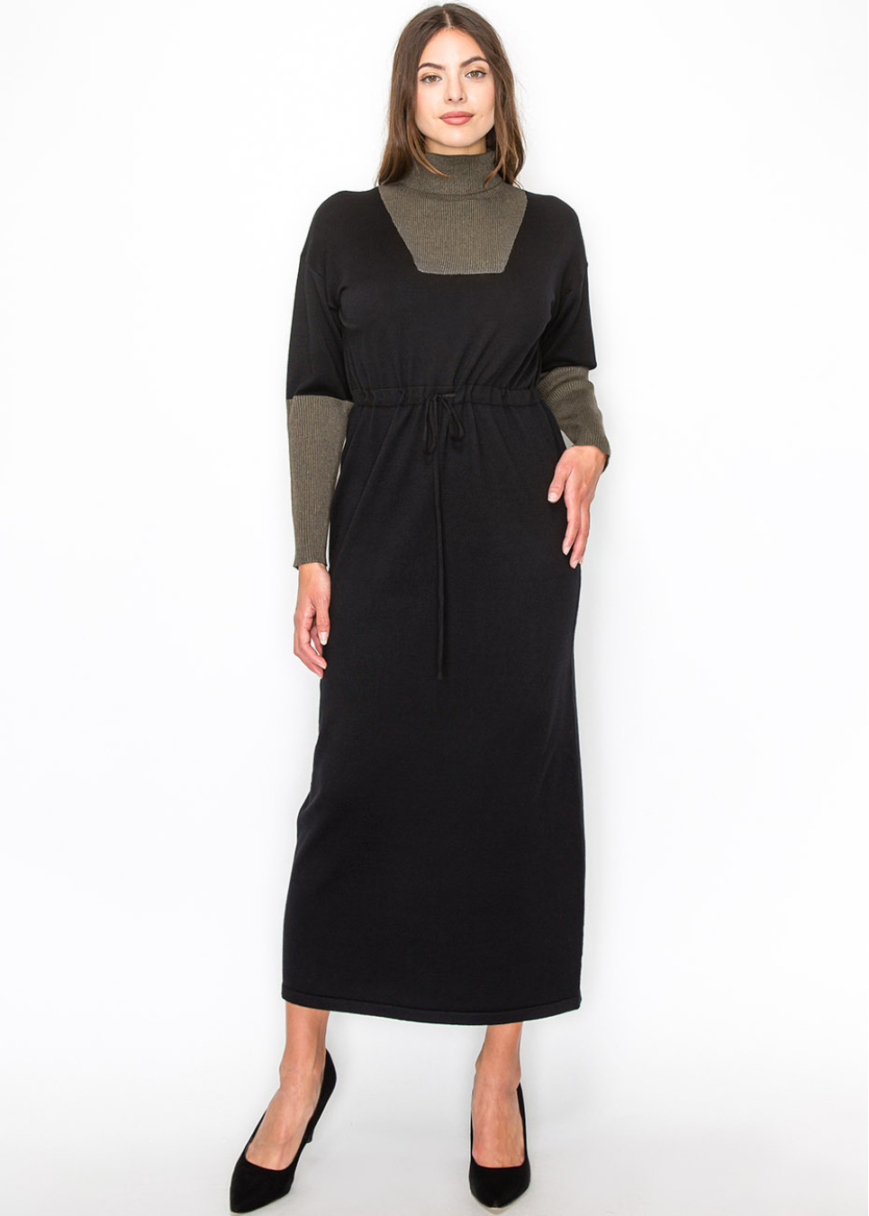 Stand out in this modern black dress featuring olive contrast panels on the sleeves and neckline. The drawstring waist adds versatility, while the soft, breathable knit fabric ensures comfort. Ideal for a sophisticated yet modest look.
