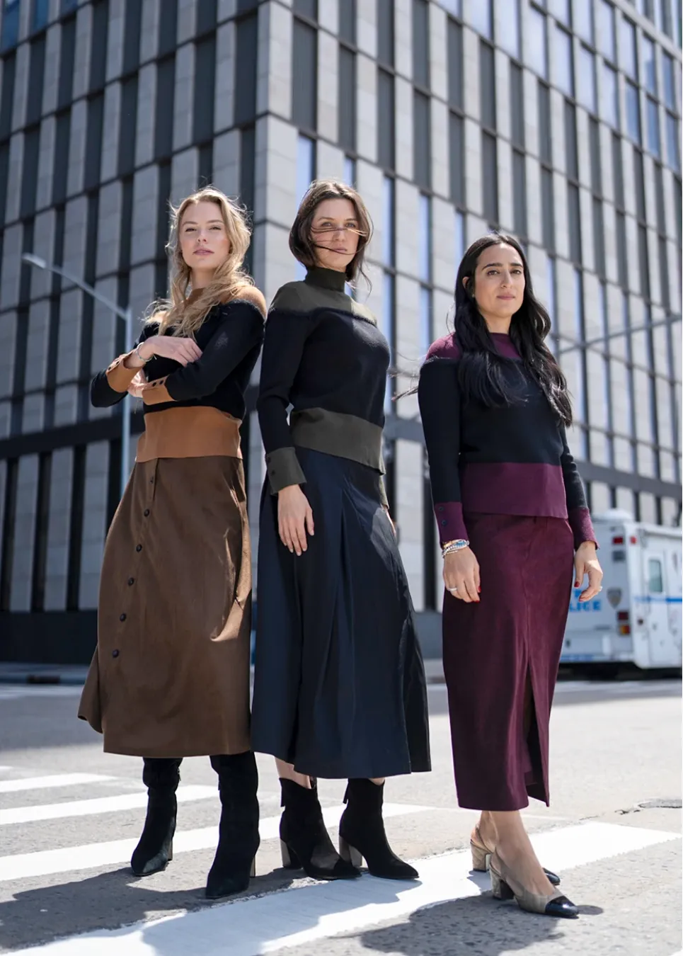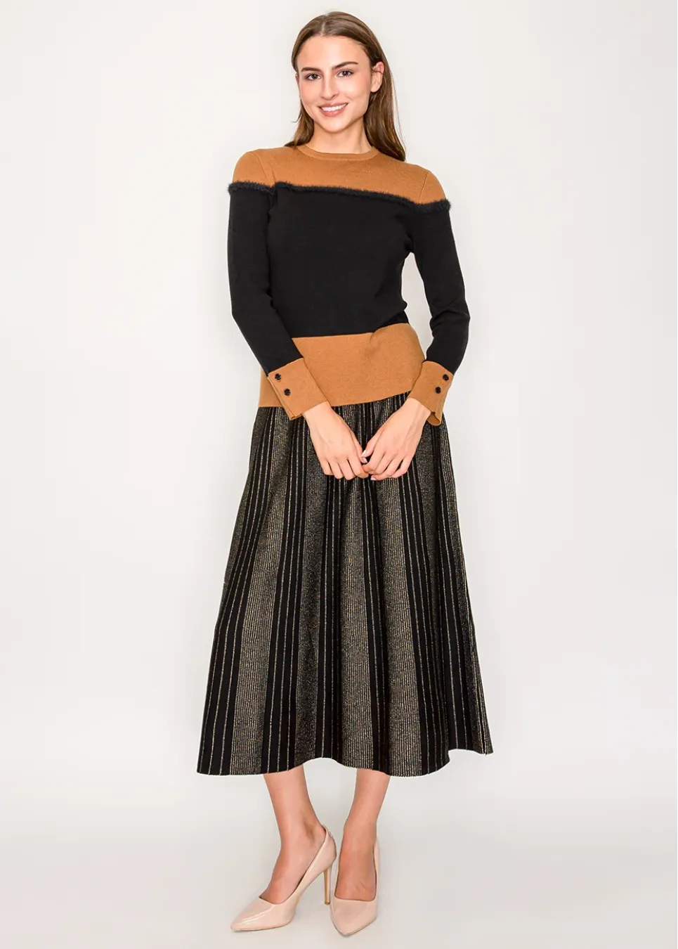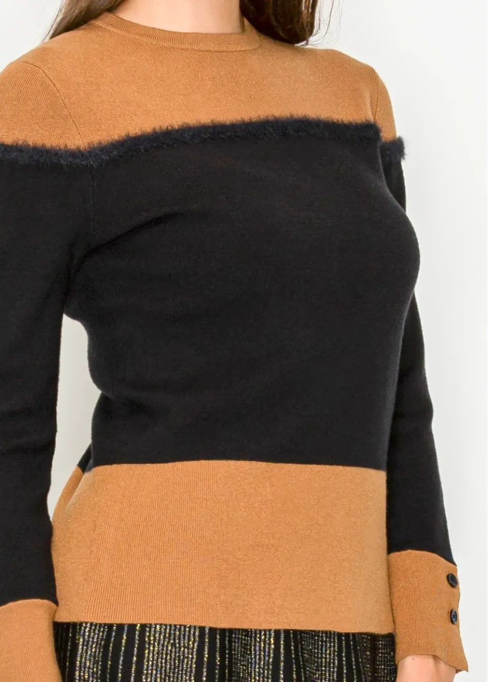 Minimalist lines with just a hint of softness. The contrast knit is accented by a fuzzy trim across the chest, making it a subtle standout piece for your fall wardrobe.