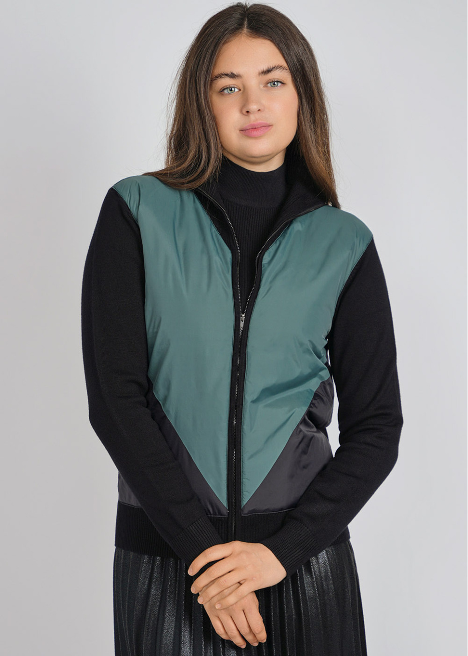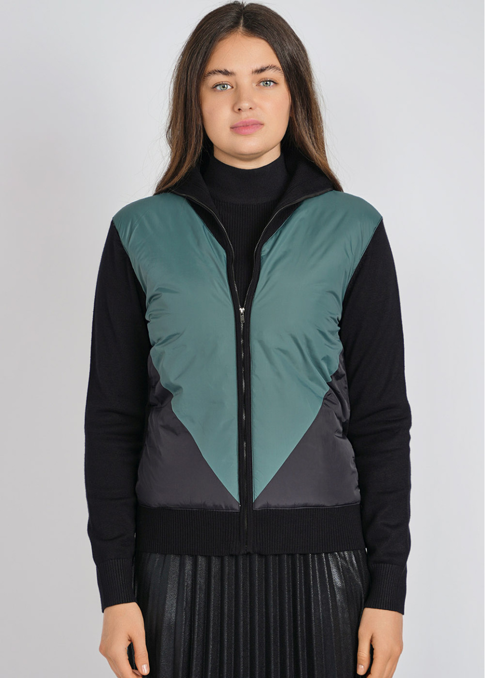 Modern Quilted Green Cardigan: Zip-Up with Raised Collar