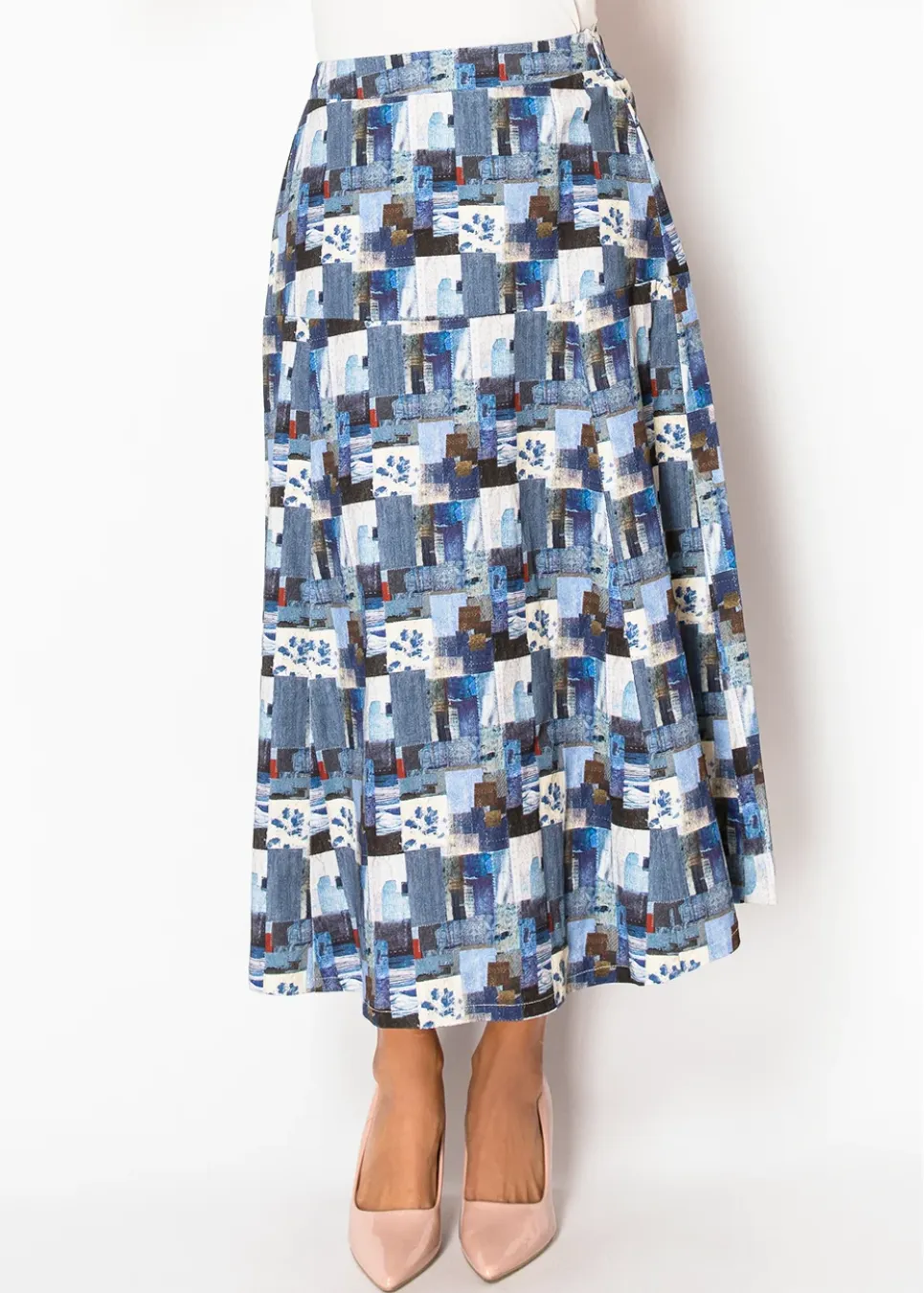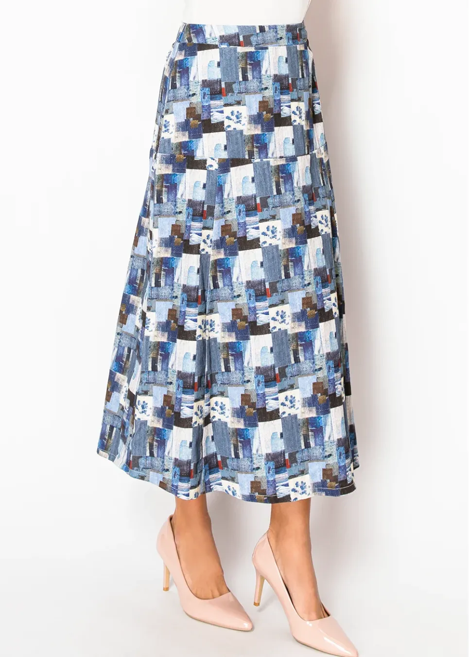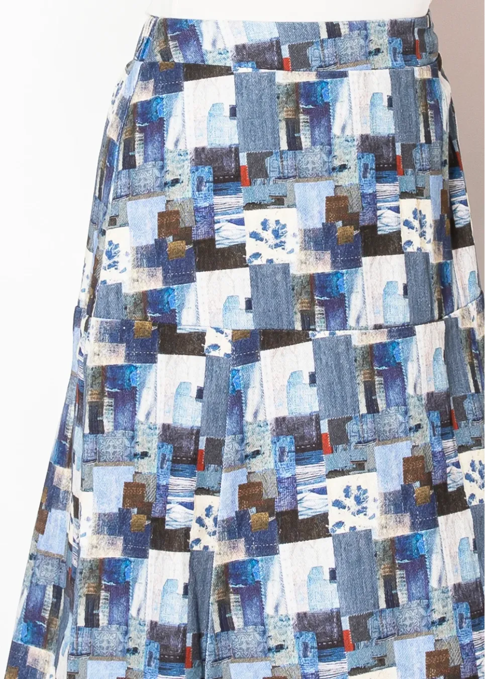 A beautiful blend of textures and patterns, this midi skirt has an artistic patchwork print with a soft, easy drape. The rich blue tones and subtle detailing make it a unique yet versatile piece for any season.