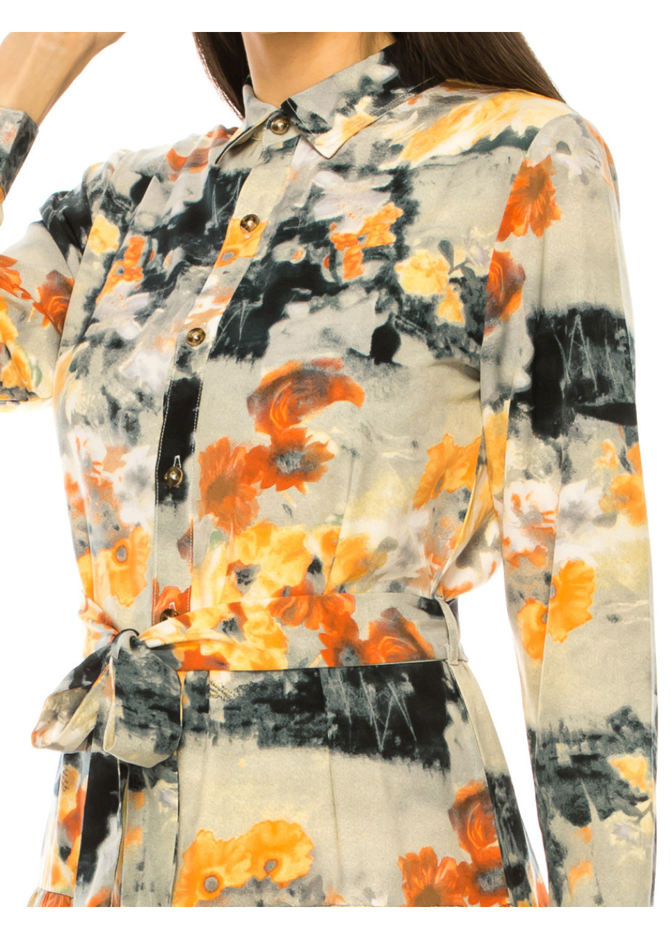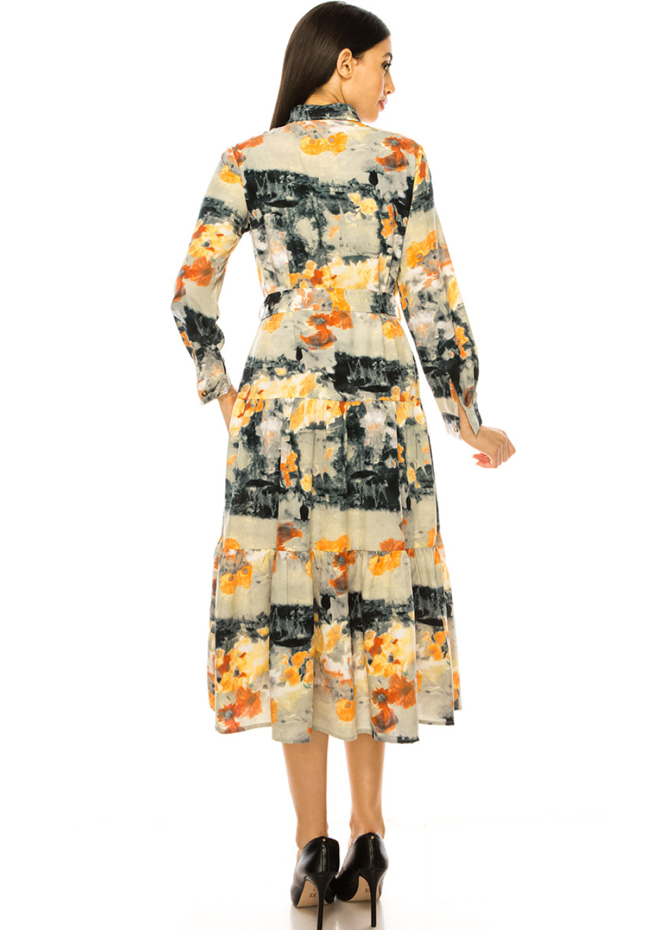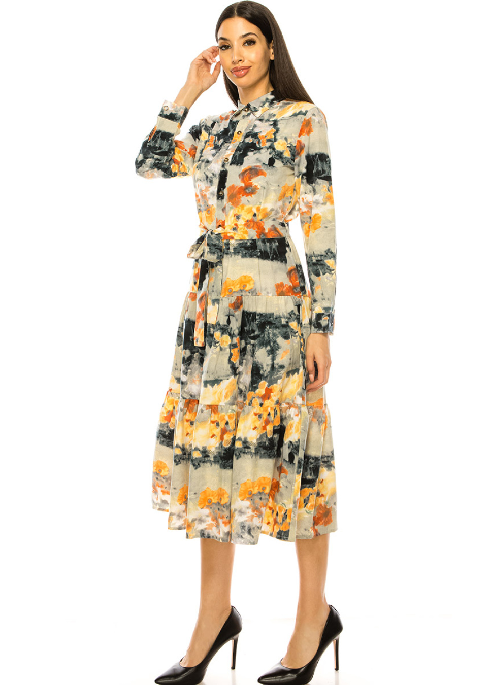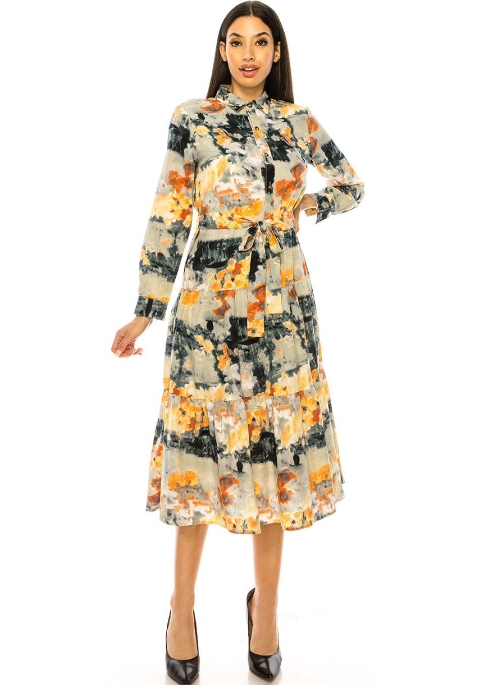 Step into the world of fashion with this beautiful and colorful abstract print midi dress. The button-down front and shirt collar create a timeless and classic look, while the A-line silhouette is both flattering and versatile. The long sleeves provide modest coverage, making it a perfect choice for any occasion. The abstract print adds a playful and trendy twist to the dress, making it a must-have addition to your wardrobe.