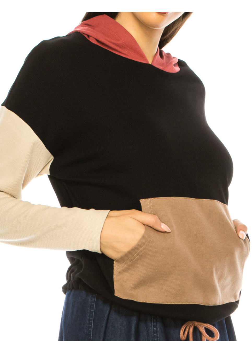 Black velour panel hoodie top with drawstring