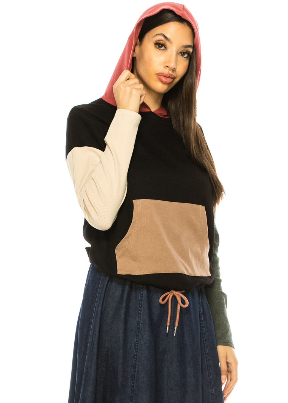 Brighten up your day with this colorful and playful long sleeve t-shirt. The black body and pocket create a sleek contrast to the vibrant hood and sleeves, while the drawstring bottom and kangaroo pocket add a practical touch. The loose fit makes it perfect for a casual and comfortable outfit.