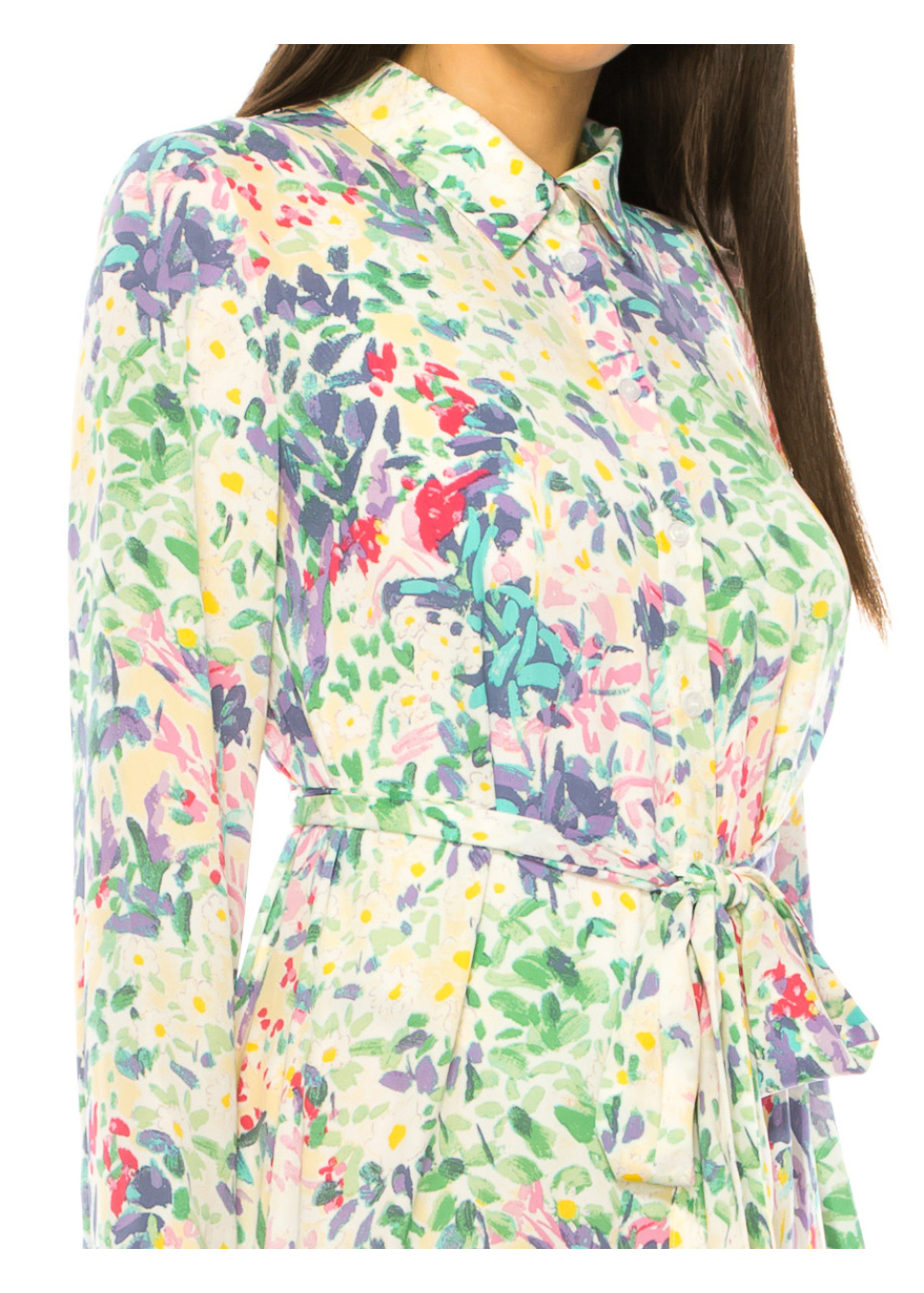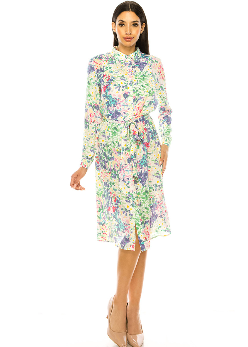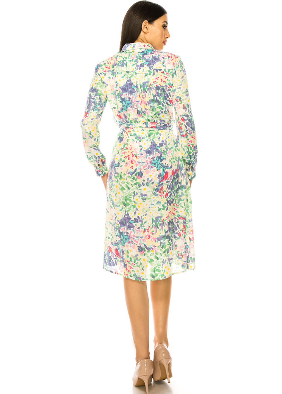 Let the colors of this beautiful floral midi dress wash over you like a wave of emotions. The colorful print is a reflection of your unique personality, while the shirt collar and waist belt add a touch of elegance. Perfect for any occasion, this dress is a statement piece in any wardrobe.