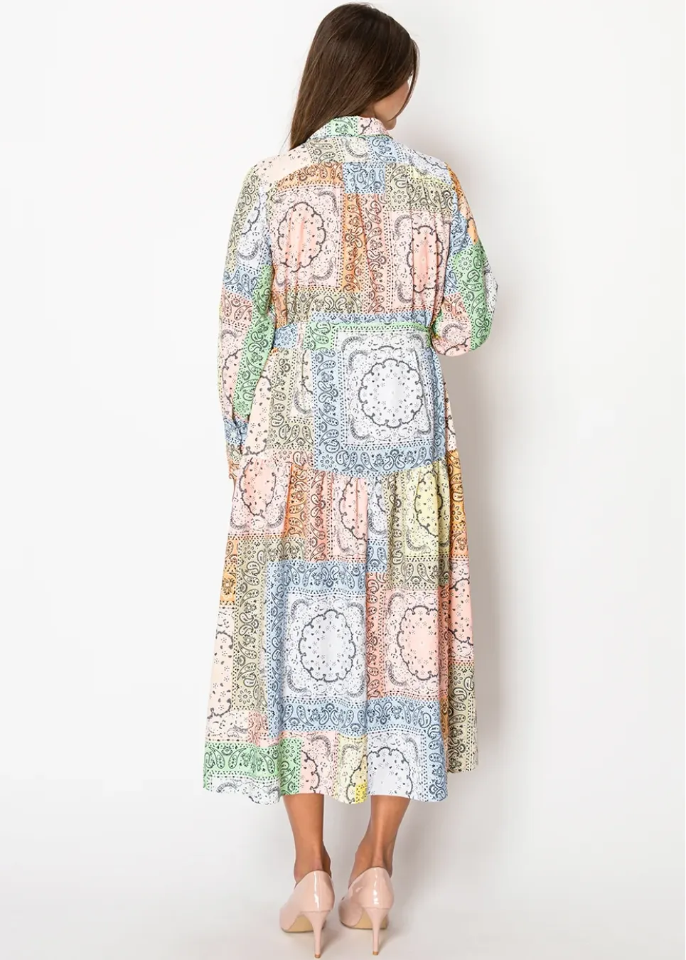 With a delightful mix of pastel colors and intricate prints, this dress feels both vintage and modern. Its lightweight fabric and flowy silhouette are perfect for sunny days and casual outings.