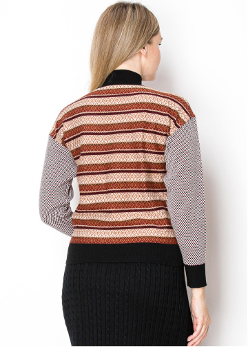 This eye-catching sweater combines bold stripes in rich rust tones with black-and-white checkered sleeves for a dynamic, unique look. The soft fabric and modest high neckline make it perfect for layering during the colder months. A statement piece for anyone who loves mixing patterns.