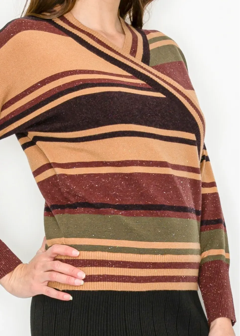A fresh twist on stripes. This crossover V-neck sweater blends warm earth tones with a soft, flecked knit for a casual yet refined feel.