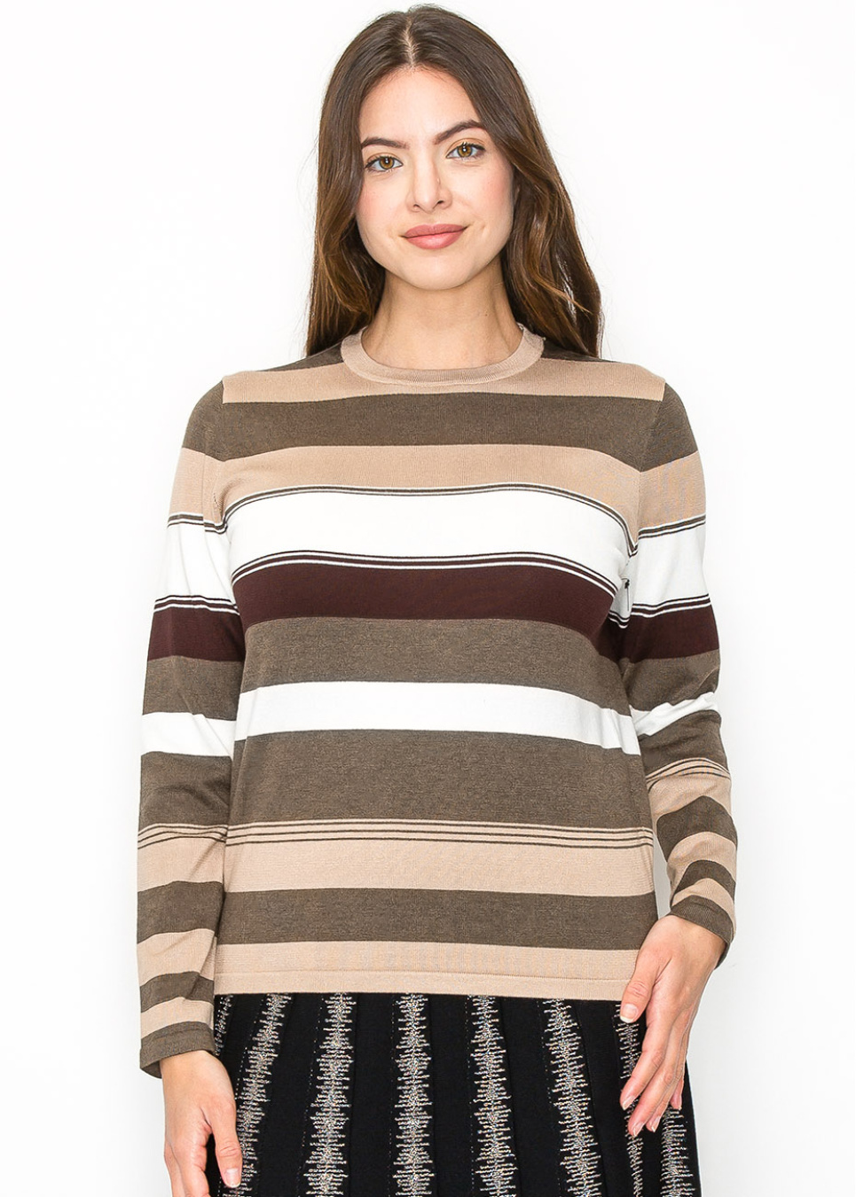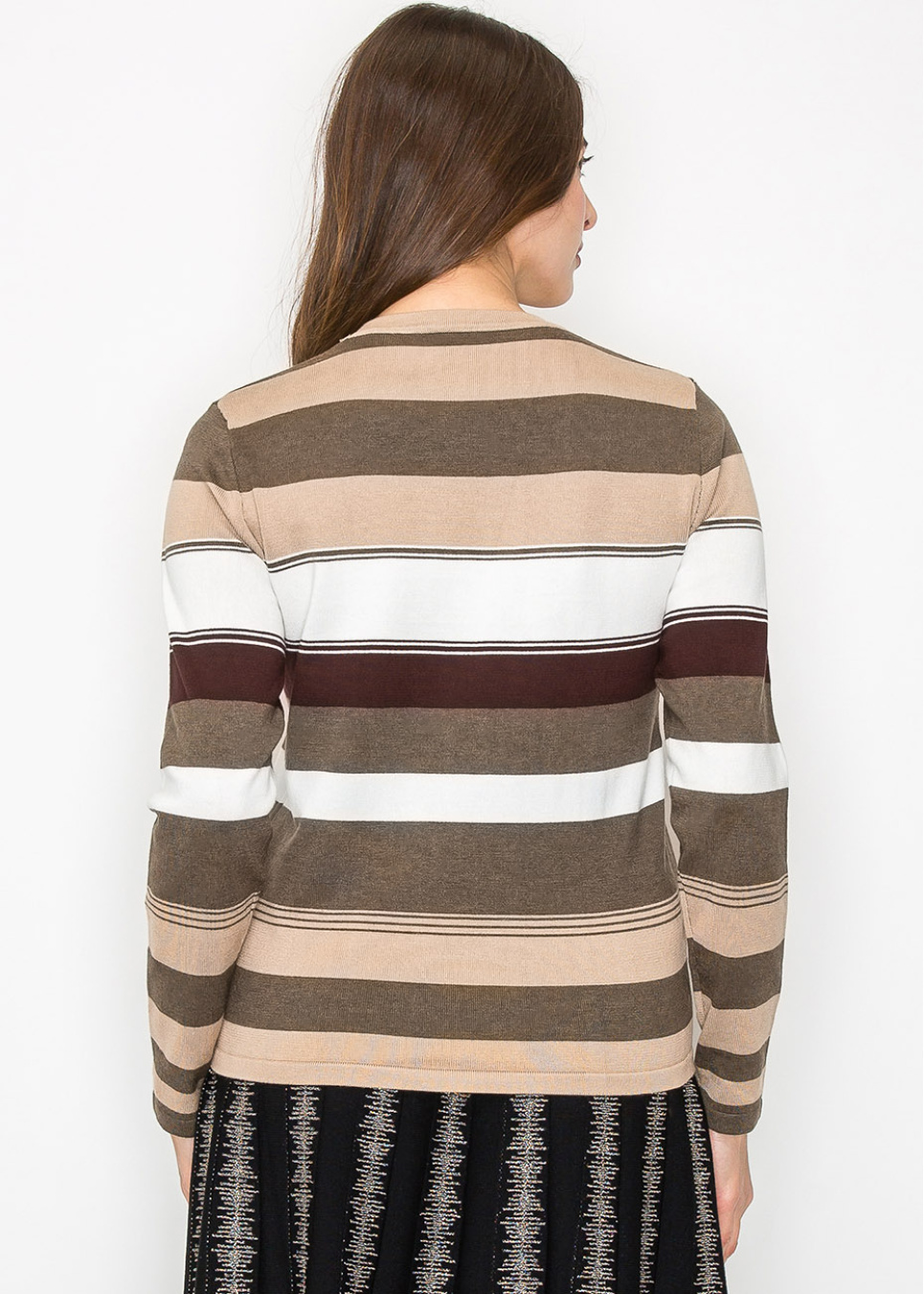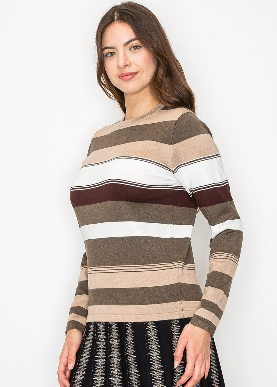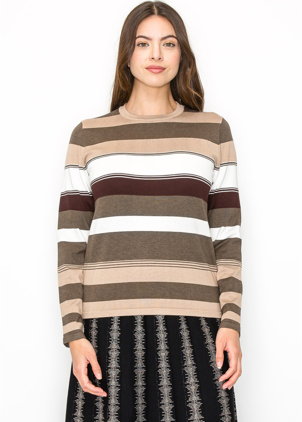 With rich stripes of camel, chocolate, and white, this sweater adds an earthy touch to your wardrobe. The soft fabric and long sleeves create a cozy fit that’s perfect for layering over dresses or pairing with skirts for a polished, modest look.